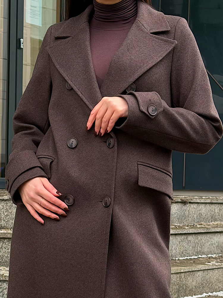 Это длинное двубортное пальто — настоящая классика гардероба, сочетающая в себе неподвластный времени стиль и премиальное тепло.