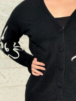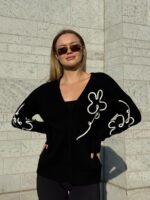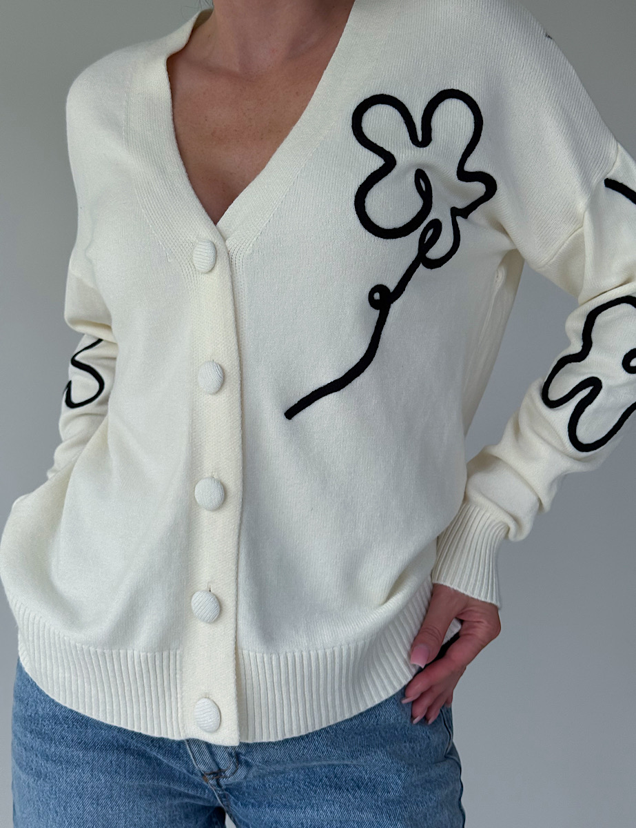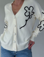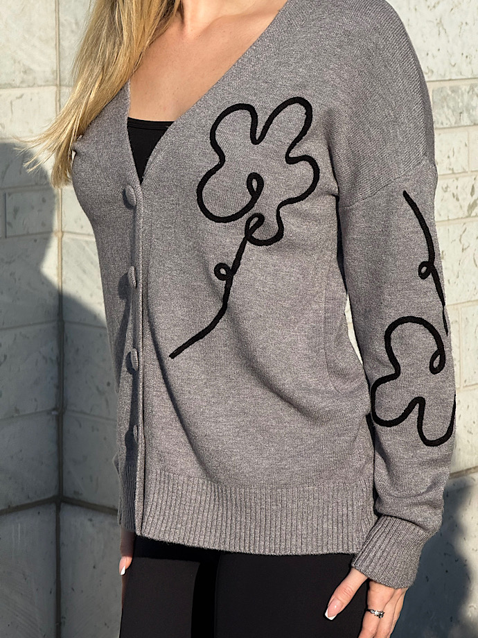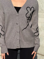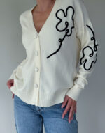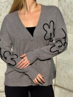 Стильный кардиган с эффектным декором — цветком, расположенным на рукаве и груди.