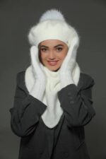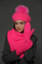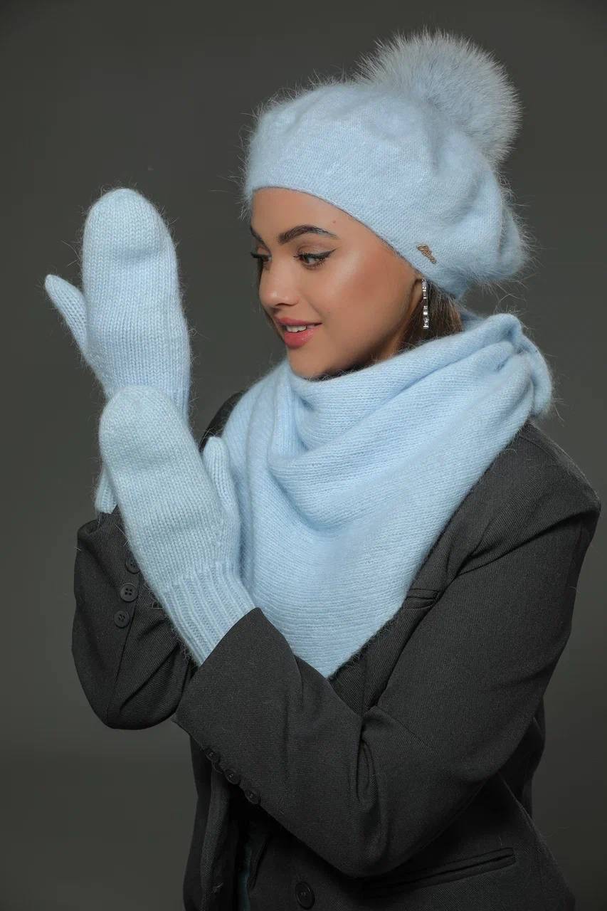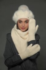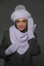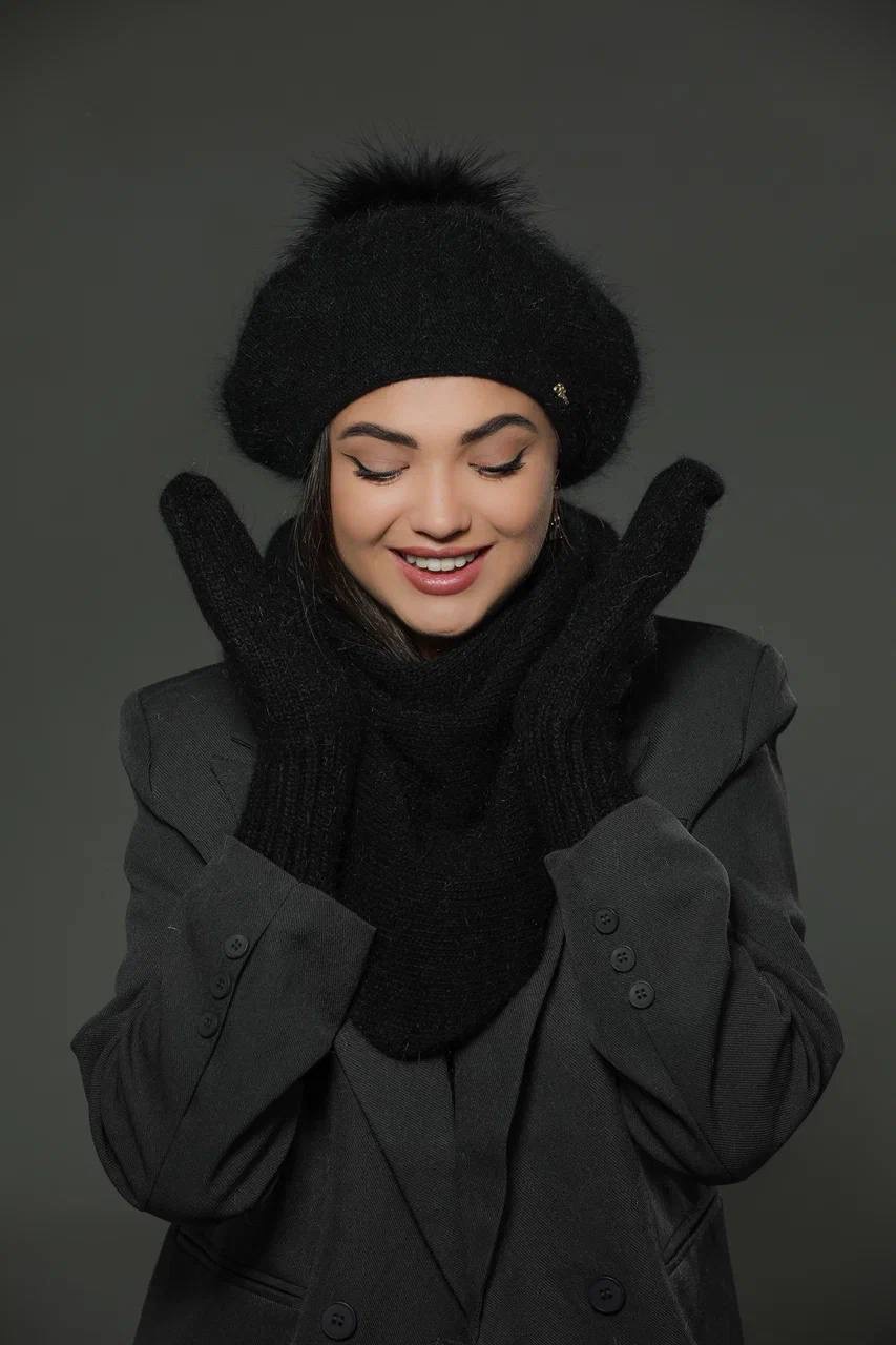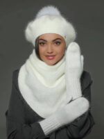 Стильный комплект из ангоры — идеально подойдет для уютных зимних прогулок. Включает элегантный берёт, теплый палантин и уютные варежки, выполненные из мягкой и натуральной ангоры. Дополняет образ помпон из натурального меха.