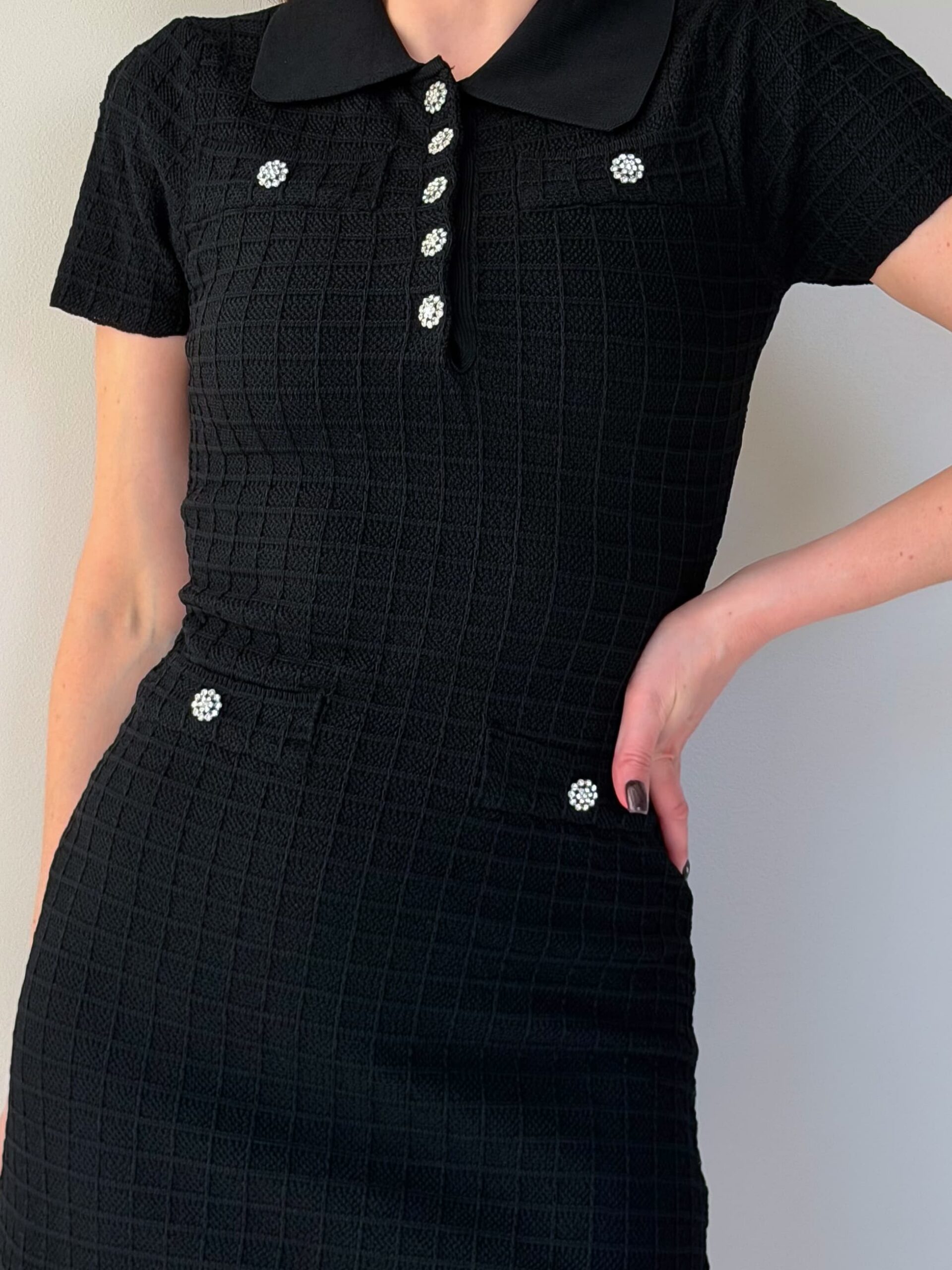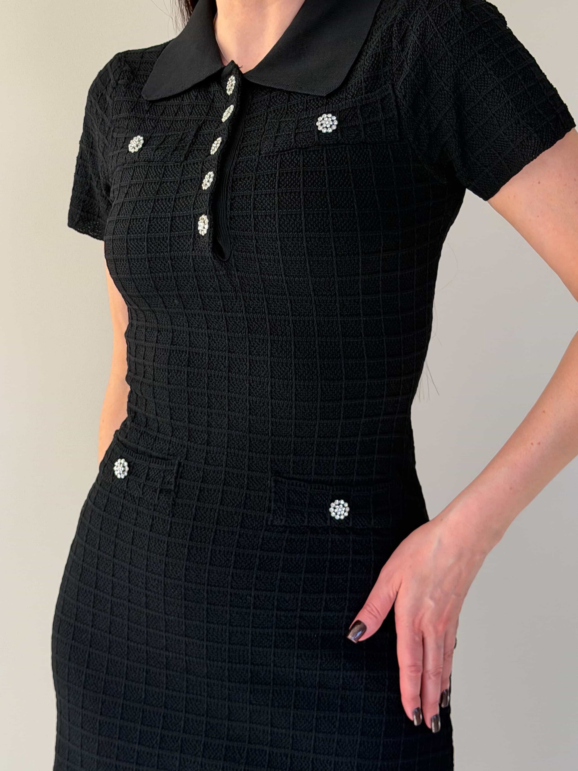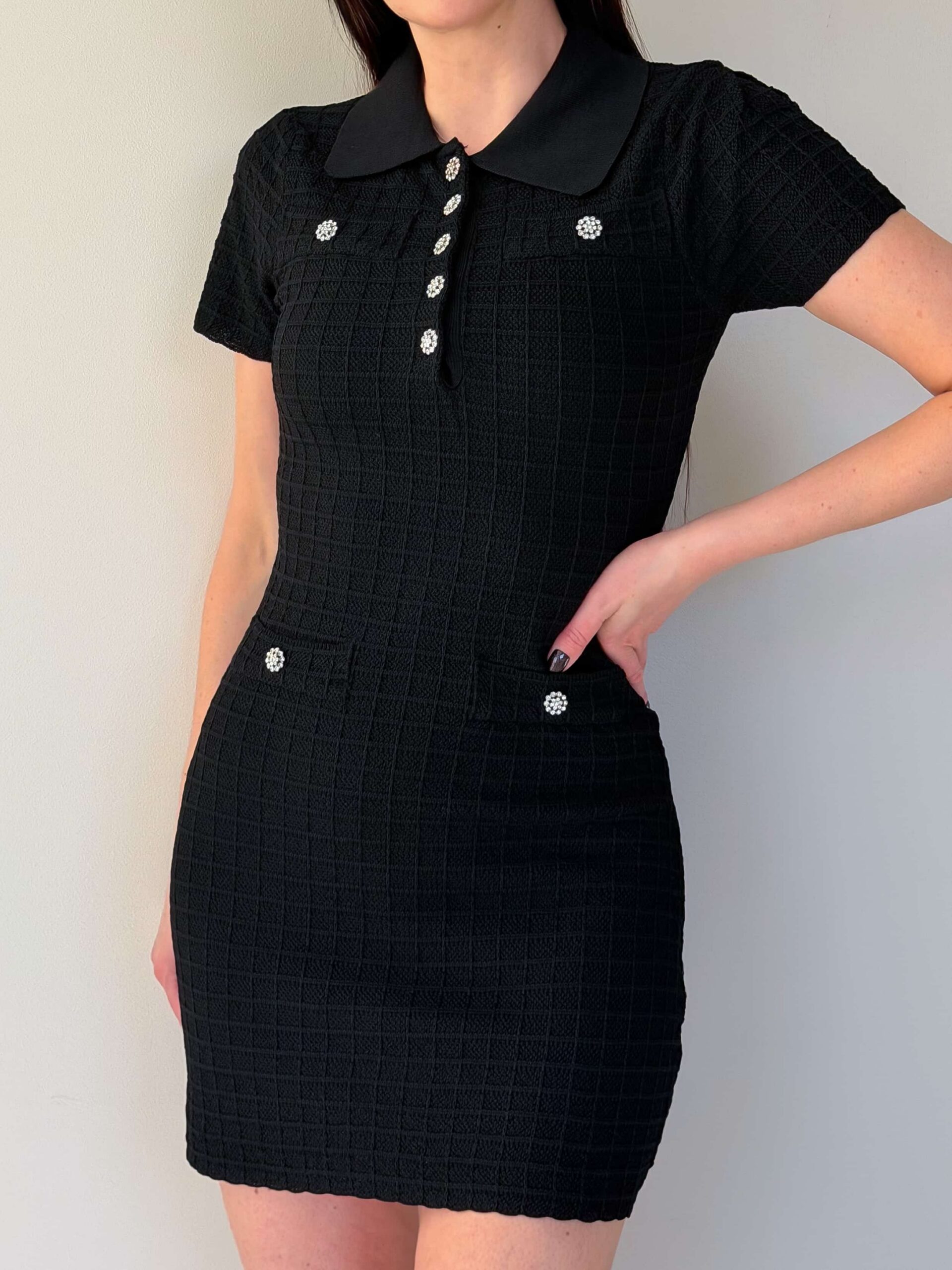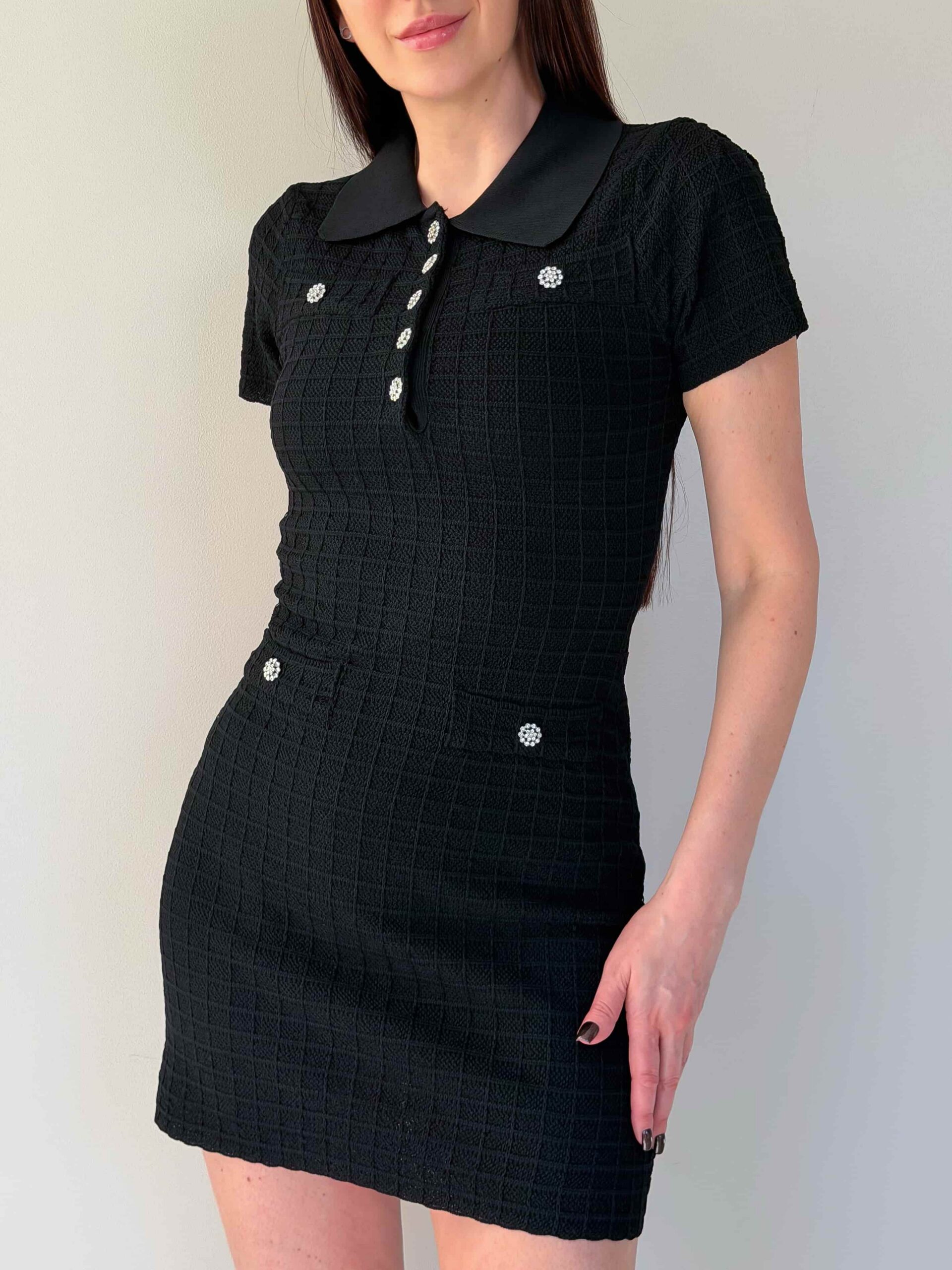 Liibuv kleit on minipikkuses mudel, mis rõhutab siluetti ja loob naiseliku välimuse. Kleit on lõigatud figuuri järgi ning järgib keha jooni, kuid jääb tänu läbimõeldud lõikele siiski mugavaks. Lühikesed varrukad lisavad kergust ja sobivad hästi soojaks hooajaks. Kontrastsed nööbid esikeskjoonel toimivad pilkupüüdva aktsendina ja lõpetavad stiilse terviku. Tekstuuriga kangas lisab välimusele sügavust ja muudab materjali huvitavaks ka katsudes. Liibuvat kleiti saab lihtsasti kombineerida kontsakingadega õhtuseks look’iks või baleriinadega igapäevaseks kandmiseks. Mudel sobib üritusteks, jalutuskäikudeks ja vabaaja kontoristiiliks. Pikkus ja väljendusrikkad detailid teevad kleidist märgatava ja praktilise eseme garderoobis.