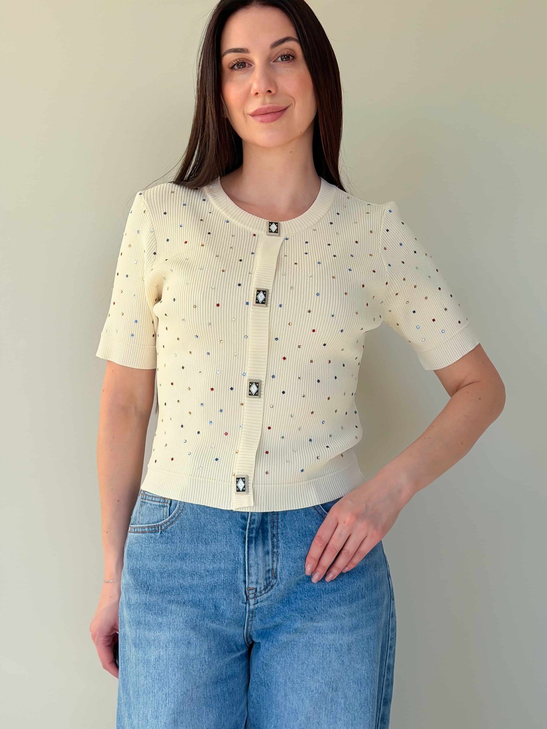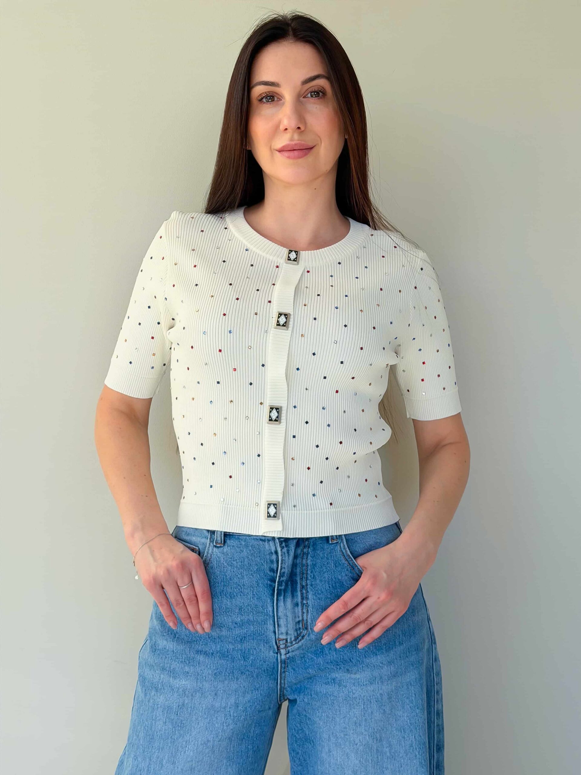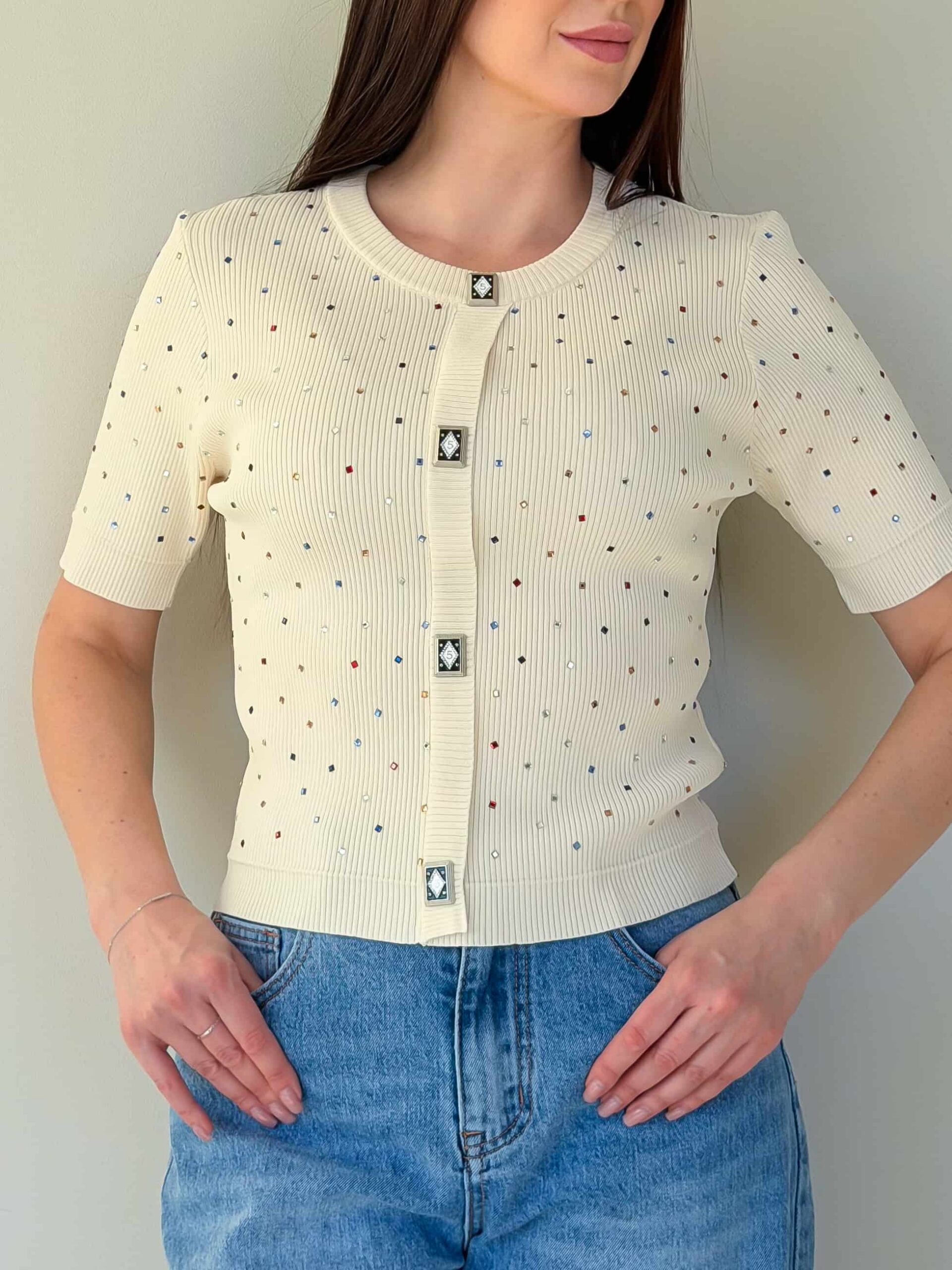 Lühikeste varrukatega džemper — universaalne ese vahehooajaks ja jahedamateks suvepäevadeks, väljendusrikka dekoratsiooniga. Mudel on valmistatud elastse trikoo materjalist, mis venib hästi ja tagab mugava istuvuse. Džemprit kaunistavad straasid, mis lisavad igapäevasele välimusele sära ja pidulikkust. Ruutjad dekoratiivsed nupud annavad siluetile erilise võlu. Taljepikkus rõhutab taljet, lühikesed varrukad teevad džempri kergesti kombineeritavaks mitmekihiliste komplektide jaoks. Sobib suurepäraselt seeliku või pükstega ning kombineerimiseks jakide või kardiganidega. Mudel on saadaval mitmes värvitoonis.
