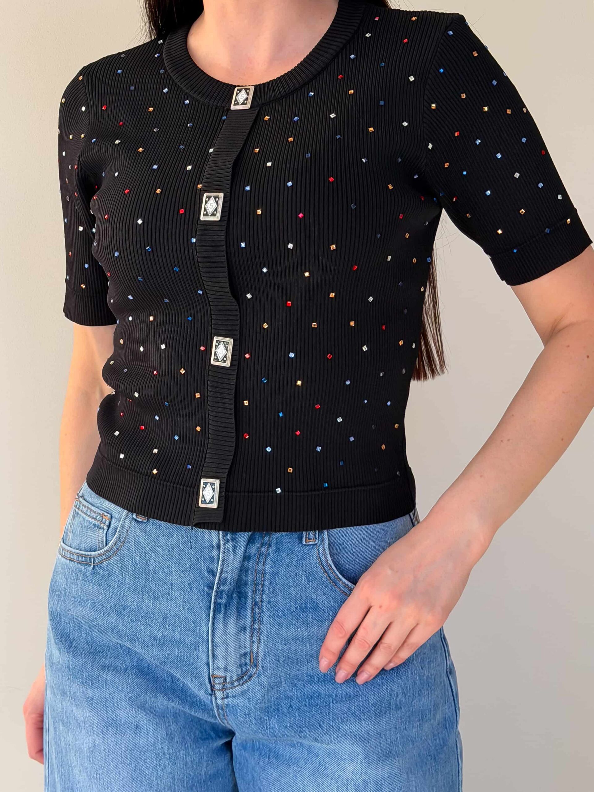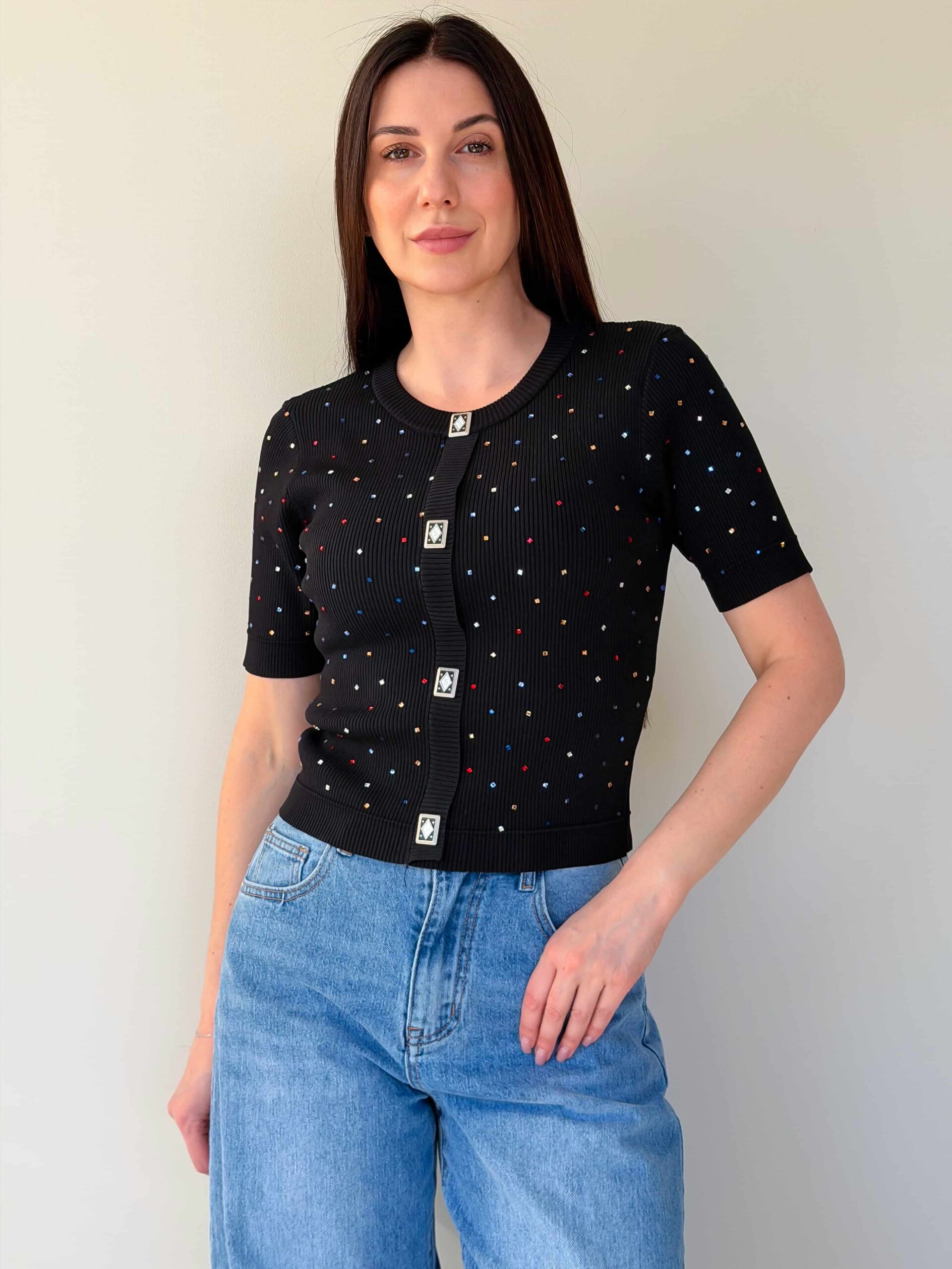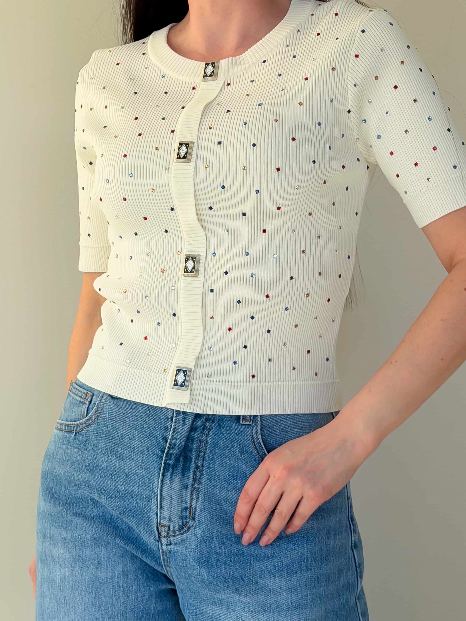 Lühikeste varrukatega džemper — universaalne ese vahehooajaks ja jahedamateks suvepäevadeks, väljendusrikka dekoratsiooniga. Mudel on valmistatud elastse trikoo materjalist, mis venib hästi ja tagab mugava istuvuse. Džemprit kaunistavad straasid, mis lisavad igapäevasele välimusele sära ja pidulikkust. Ruutjad dekoratiivsed nupud annavad siluetile erilise võlu. Taljepikkus rõhutab taljet, lühikesed varrukad teevad džempri kergesti kombineeritavaks mitmekihiliste komplektide jaoks. Sobib suurepäraselt seeliku või pükstega ning kombineerimiseks jakide või kardiganidega. Mudel on saadaval mitmes värvitoonis.