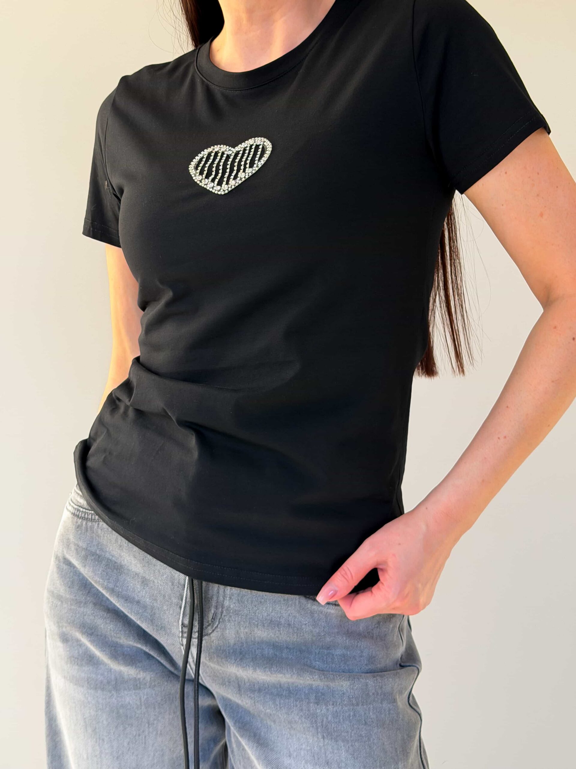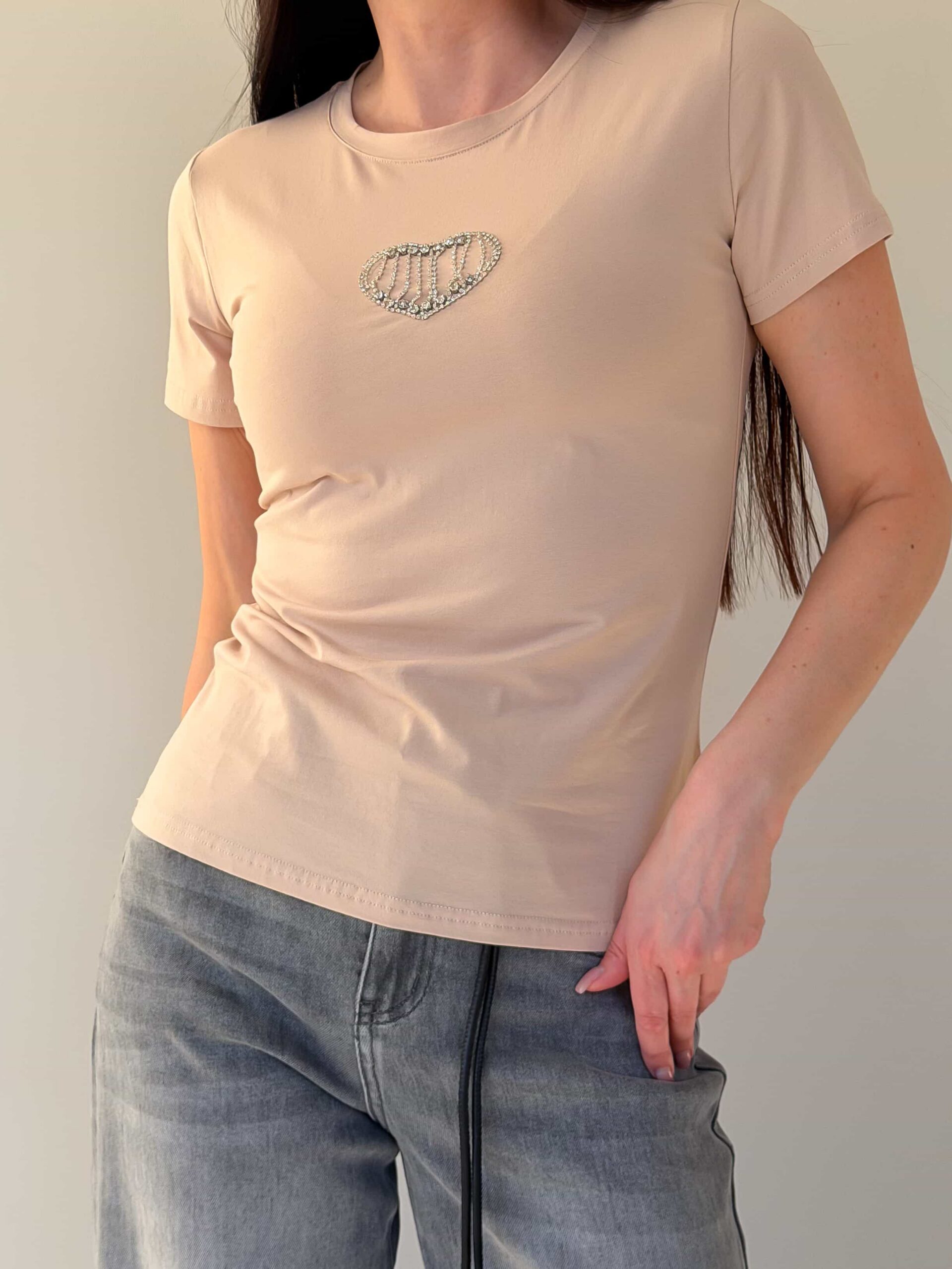 T-särk südamega — õrn ja väljendusrikas mudel igapäevasesse garderoobi. Valmistatud pehmest puuvillatrikoo materjalist, meeldiv keha vastas. Ees on korralik dekoratsioon südame kujul straasidega, mis lisab välimusele kerget aktsenti. Sirge lõige tagab liikumisvabaduse ja universaalsuse kombinatsioonides. Mudel on saadaval põhivärvides, sobitudes igat tüüpi alumise osaga.
