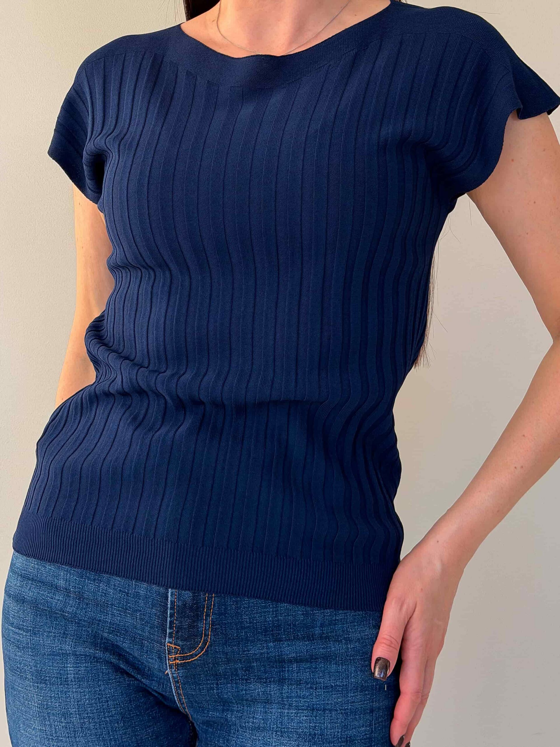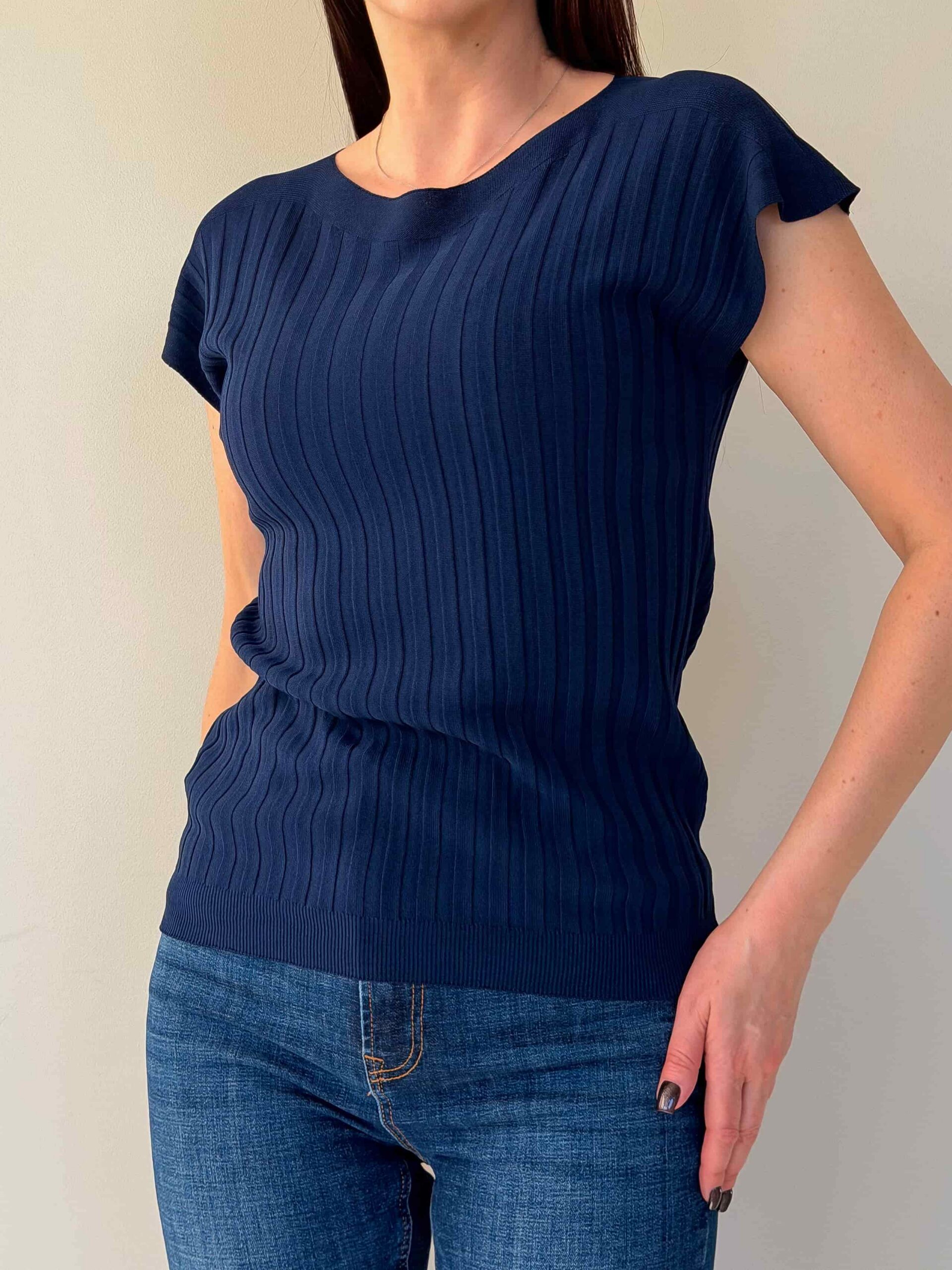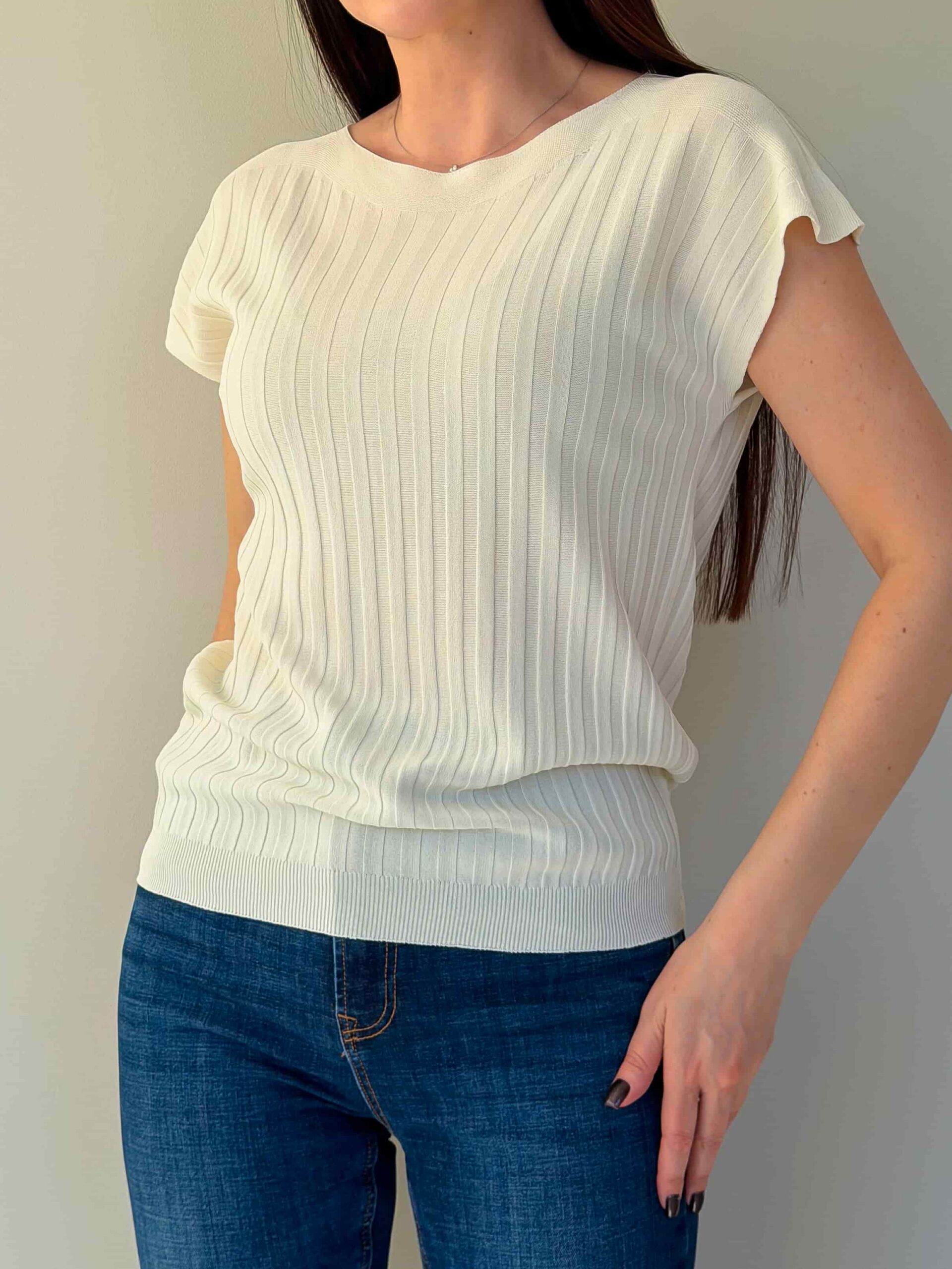 Õhukesest trikookangast topp on kerge ja universaalne põhimudel igapäevaseks kandmiseks ning kihiliseks stiiliks. Sirge lõige istub vabalt ja allääras olev kumm hoiab istuvust, luues modernse silueti. Üheosalised varrukad annavad minimalistliku ja sujuva välimuse ning tagavad mugavuse liikumisel. Kangas on elastne, mistõttu topp sobib erinevatele suurustele. Mudel on saadaval mitmes värvitoonis, mis lihtsustab kombineerimist jaku, kardigani või seelikuga. Ideaalne kontoriks, jalutuskäikudeks ja reisideks – kerge, kompaktne ja lihtsasti hooldatav.