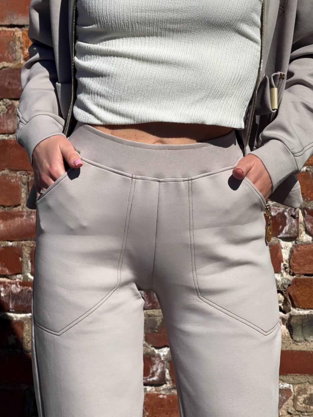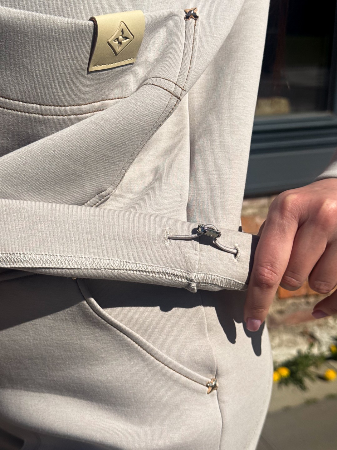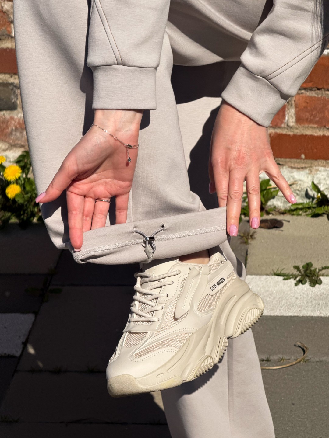 See kaasaegne naiste komplekt koosneb jakist ja pükstest. Moodsat kostüümi, millel on pealekantud taskud, täiendab mugavuse huvides tõmblukk. Püstkrae kaitseb kaela jaheduse eest. Suured pealekantud taskud on oluline disainielement ja funktsionaalne detail. Originaalne õmblusdekoratsioon rõhutab lõikejooni ja annab tootele isikupära. Kampsuni alaosa spetsiaalne laiusregulaator aitab toote mahtu hõlpsasti muuta. Pükste alaosa on samuti reguleeritav kinnitustega vastavalt teie isiklikele soovidele. Universaalne komplekt pealekantavate taskutega sobib dünaamilise spordiliku välimuse loomiseks. Iga detail ja kaunistus on läbimõeldud mugavaks kasutamiseks.