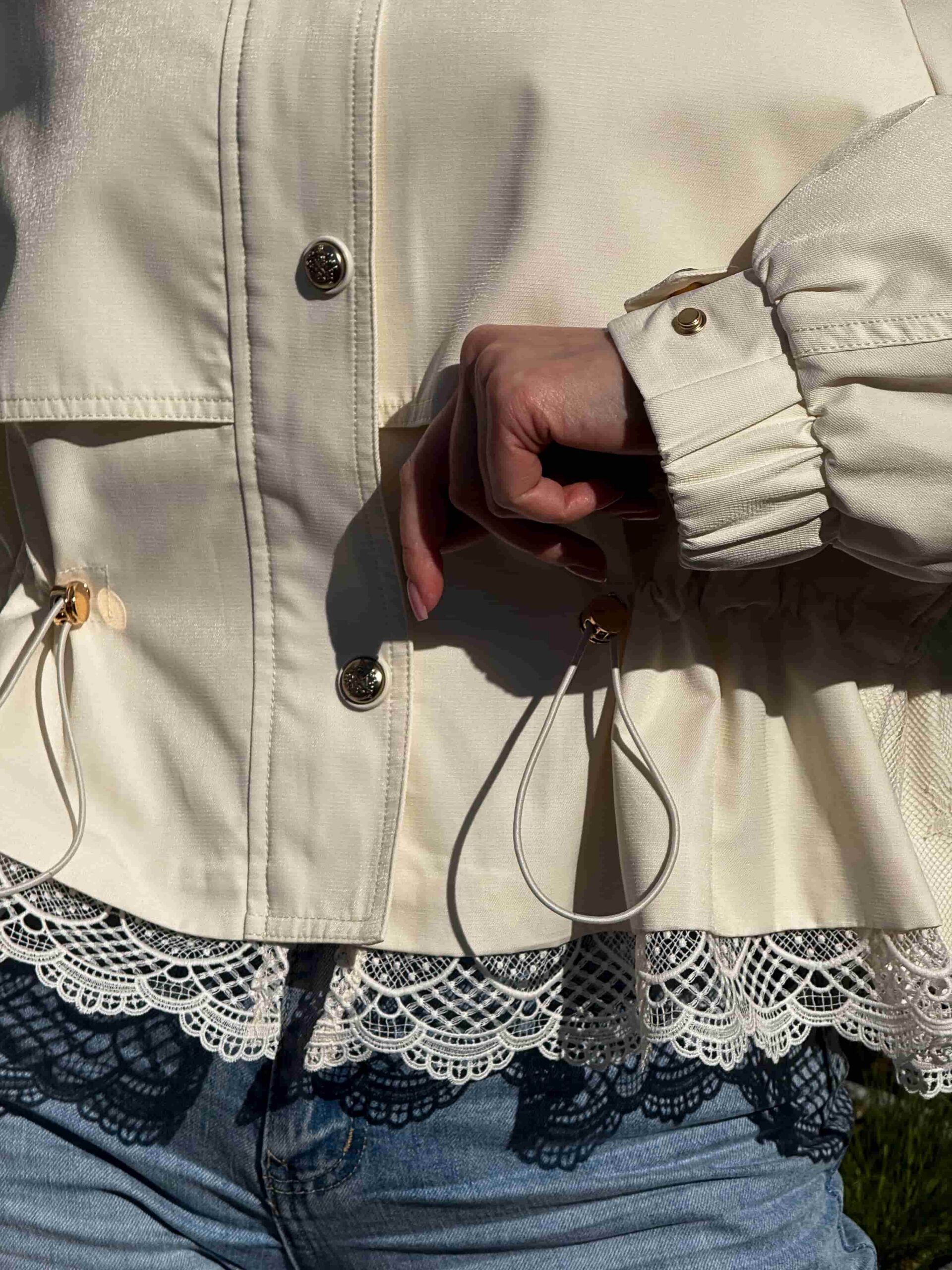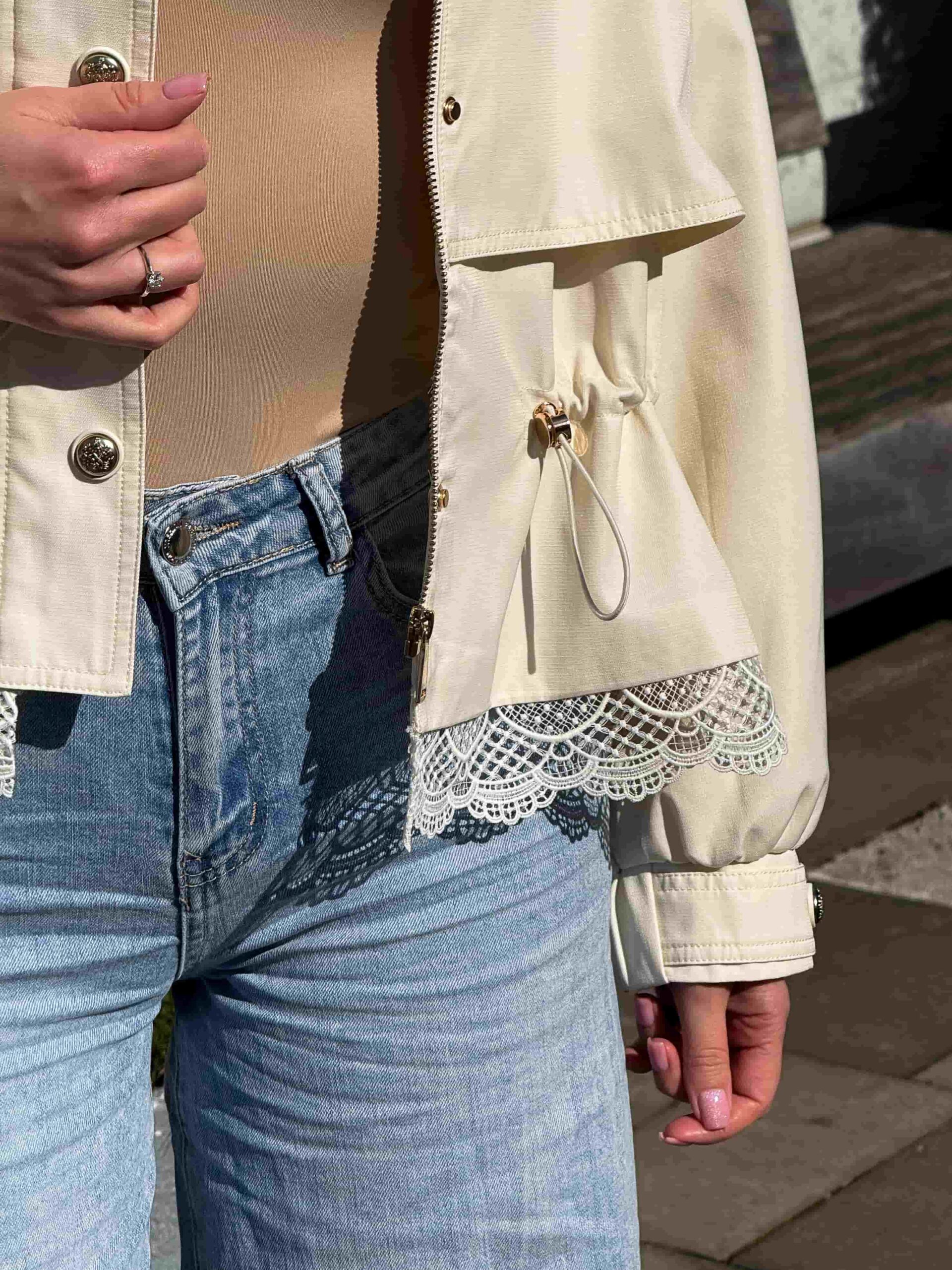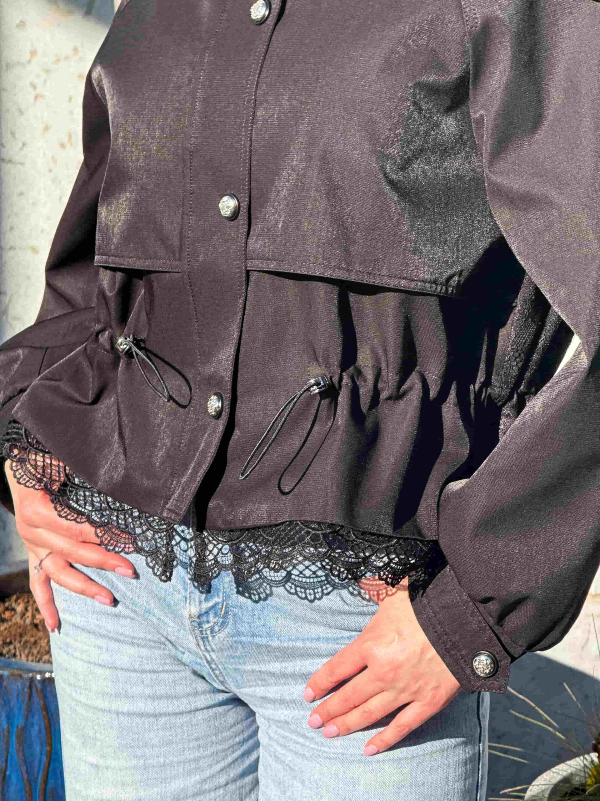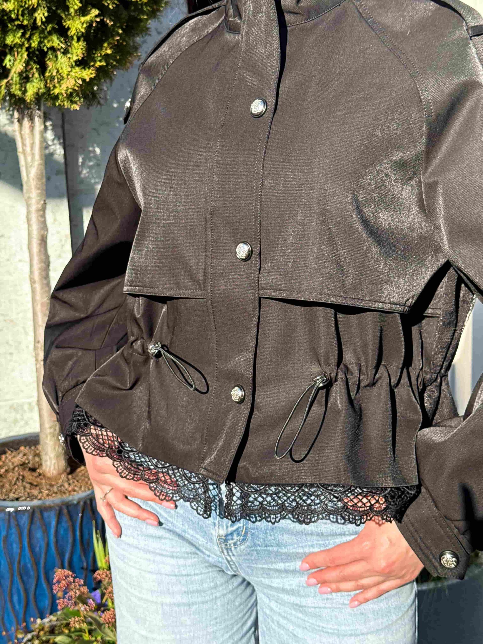 Pitsiga nööritav jope — stiilne ja naiselik ese kaasaegsesse garderoobi. Mudel on lühendatud lõikega, elegantse püstkraega ja peidetud tõmblukuga. Pitsist alläär lisab tootele romantilisust ja õrnust. Pitsiga nööritaval jopel on taljeosas reguleerimisvõimalus, mis võimaldab luua erinevaid siluette. Krae kaitseb heitlike ilmastikuolude eest. Ideaalne jalutuskäikudeks, kohtumisteks ja igapäevaseks kasutamiseks. Kaasaegne disain muudab jope aktuaalseks ja moodsaks. Sobib originaalsete ja stiilsete kombinatsioonide loomiseks. Asendamatu ese iga naise garderoobis.