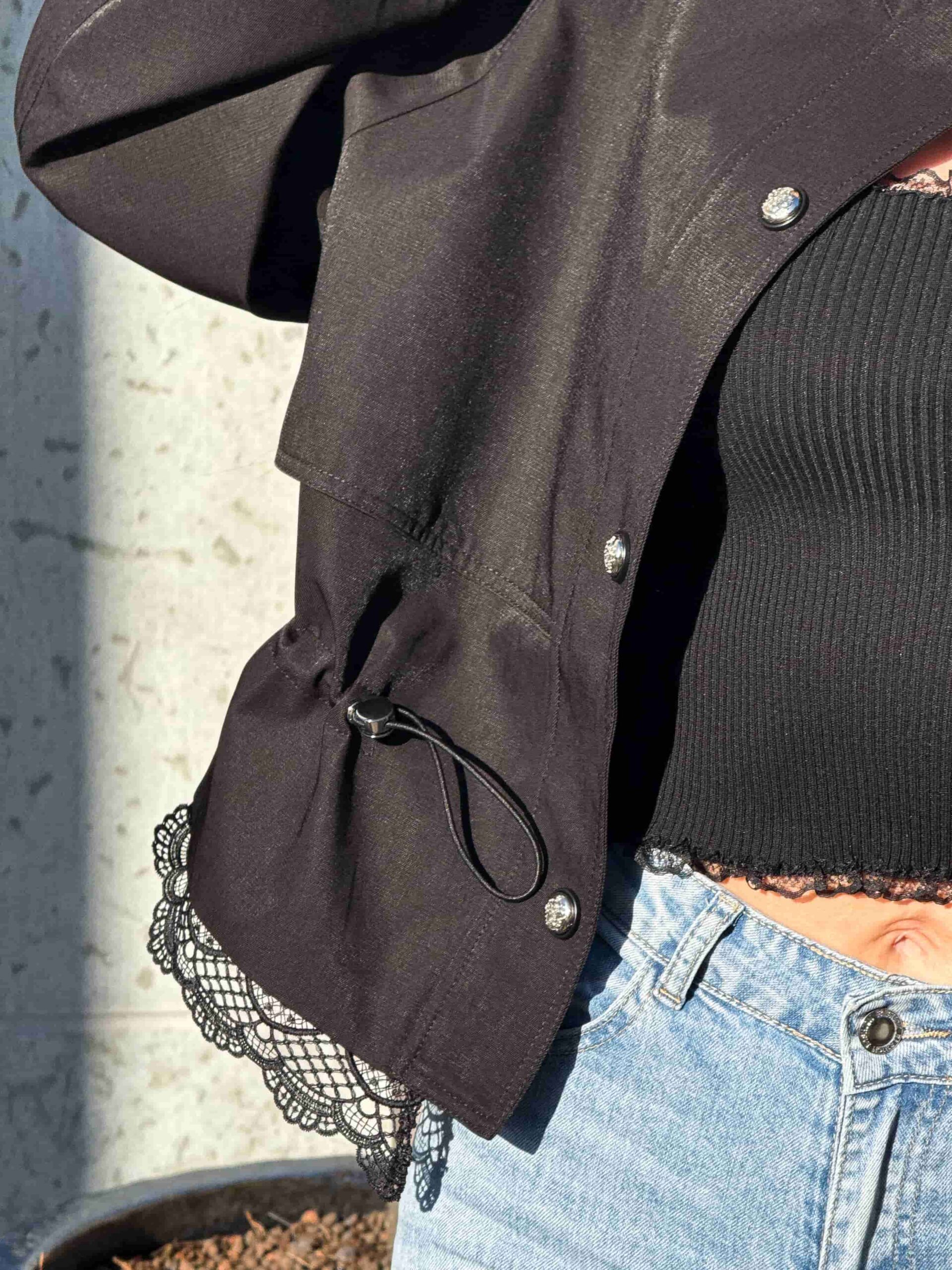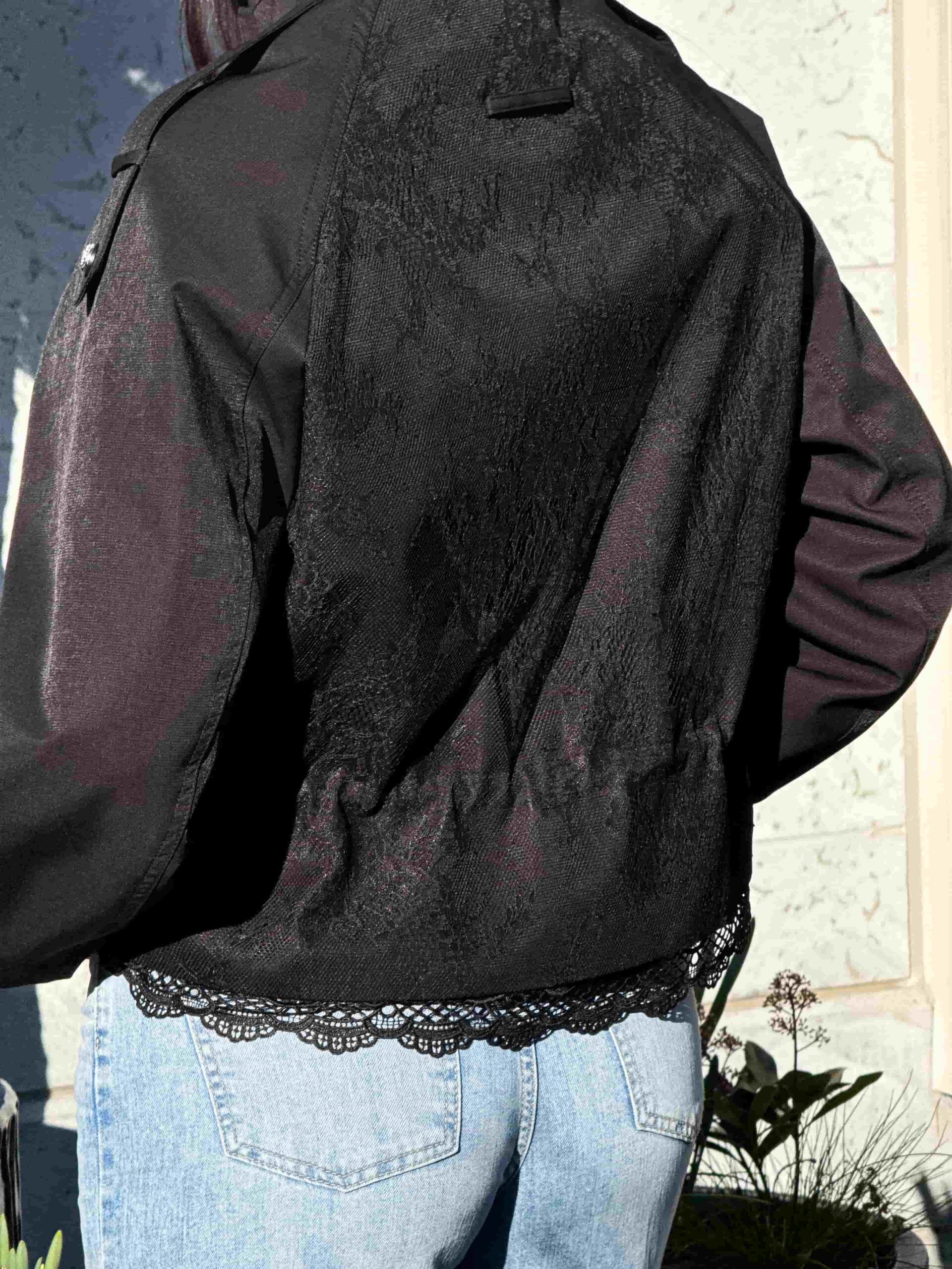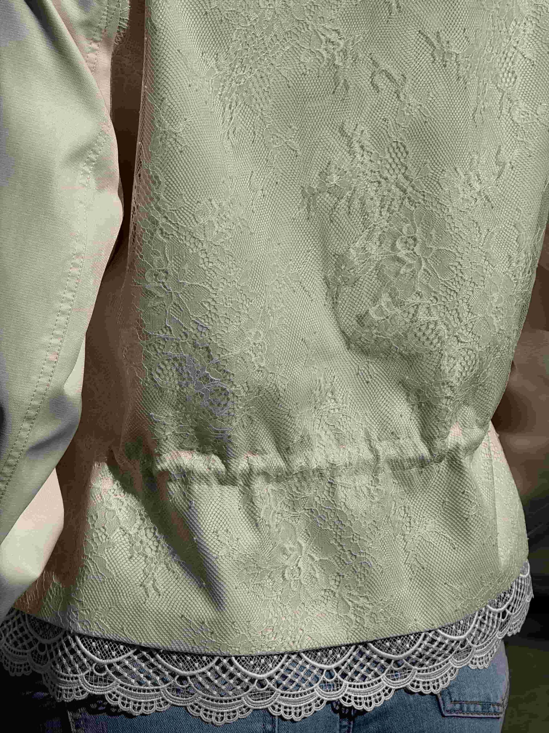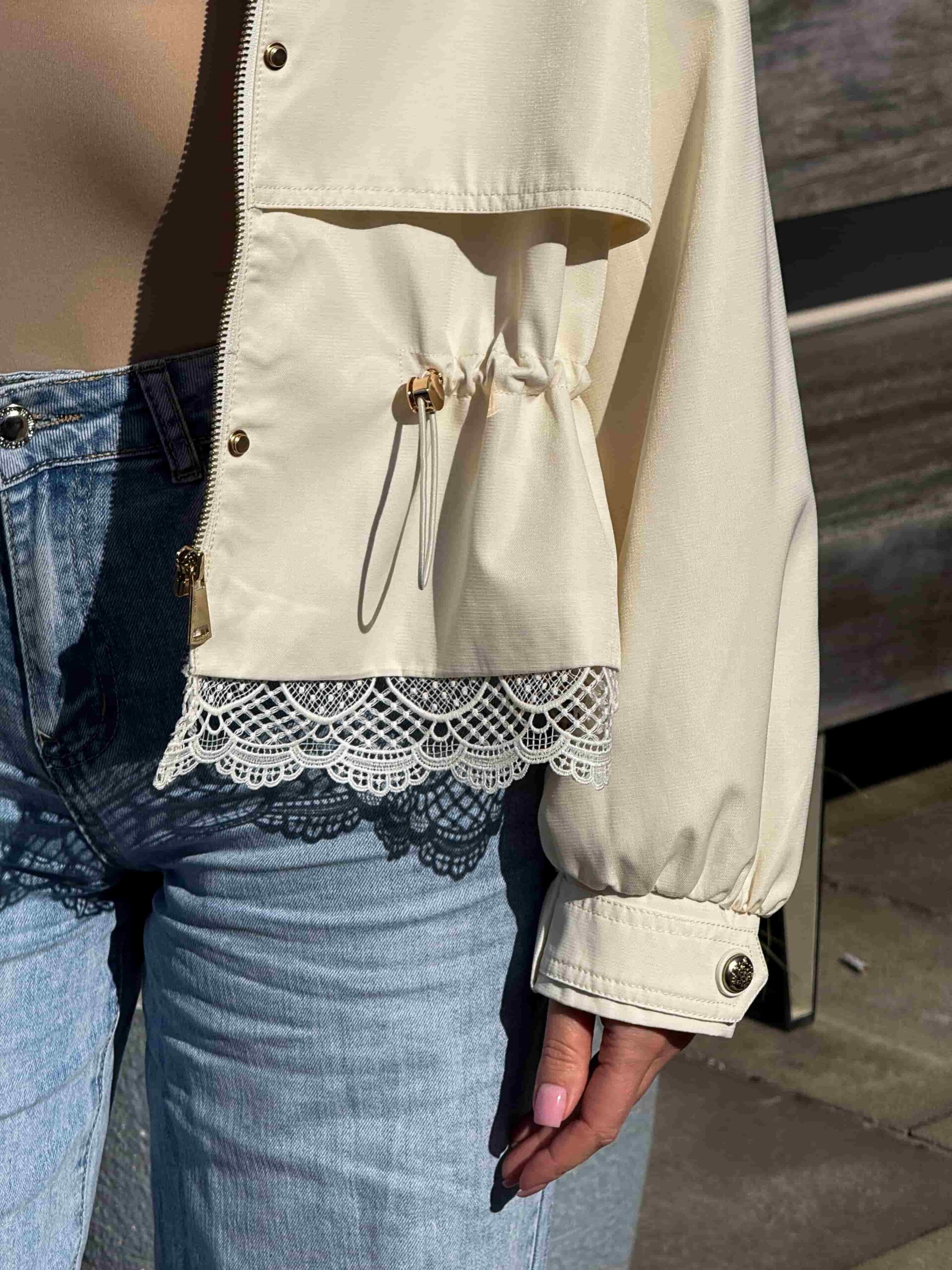 Pitsiga nööritav jope — stiilne ja naiselik ese kaasaegsesse garderoobi. Mudel on lühendatud lõikega, elegantse püstkraega ja peidetud tõmblukuga. Pitsist alläär lisab tootele romantilisust ja õrnust. Pitsiga nööritaval jopel on taljeosas reguleerimisvõimalus, mis võimaldab luua erinevaid siluette. Krae kaitseb heitlike ilmastikuolude eest. Ideaalne jalutuskäikudeks, kohtumisteks ja igapäevaseks kasutamiseks. Kaasaegne disain muudab jope aktuaalseks ja moodsaks. Sobib originaalsete ja stiilsete kombinatsioonide loomiseks. Asendamatu ese iga naise garderoobis.