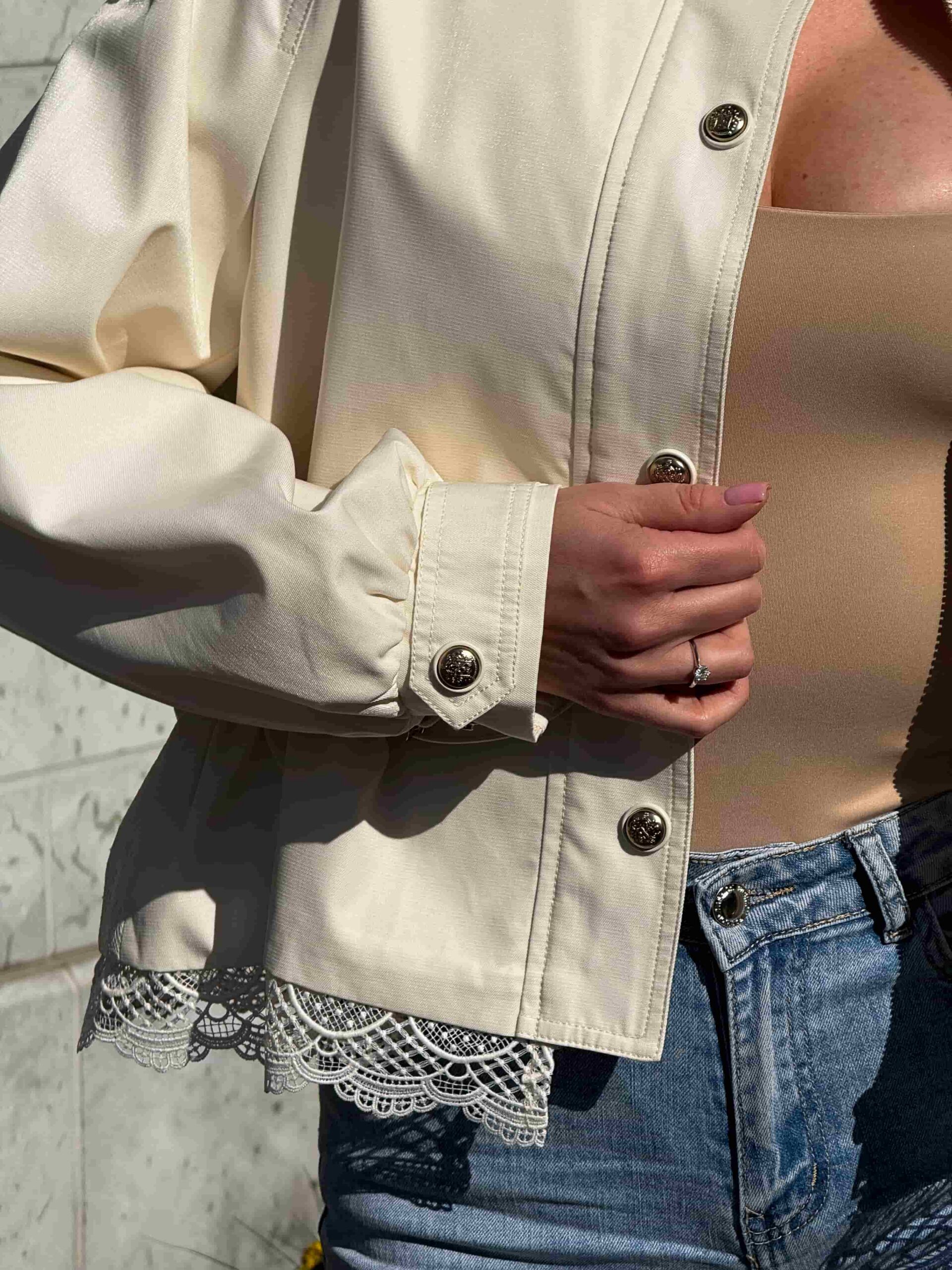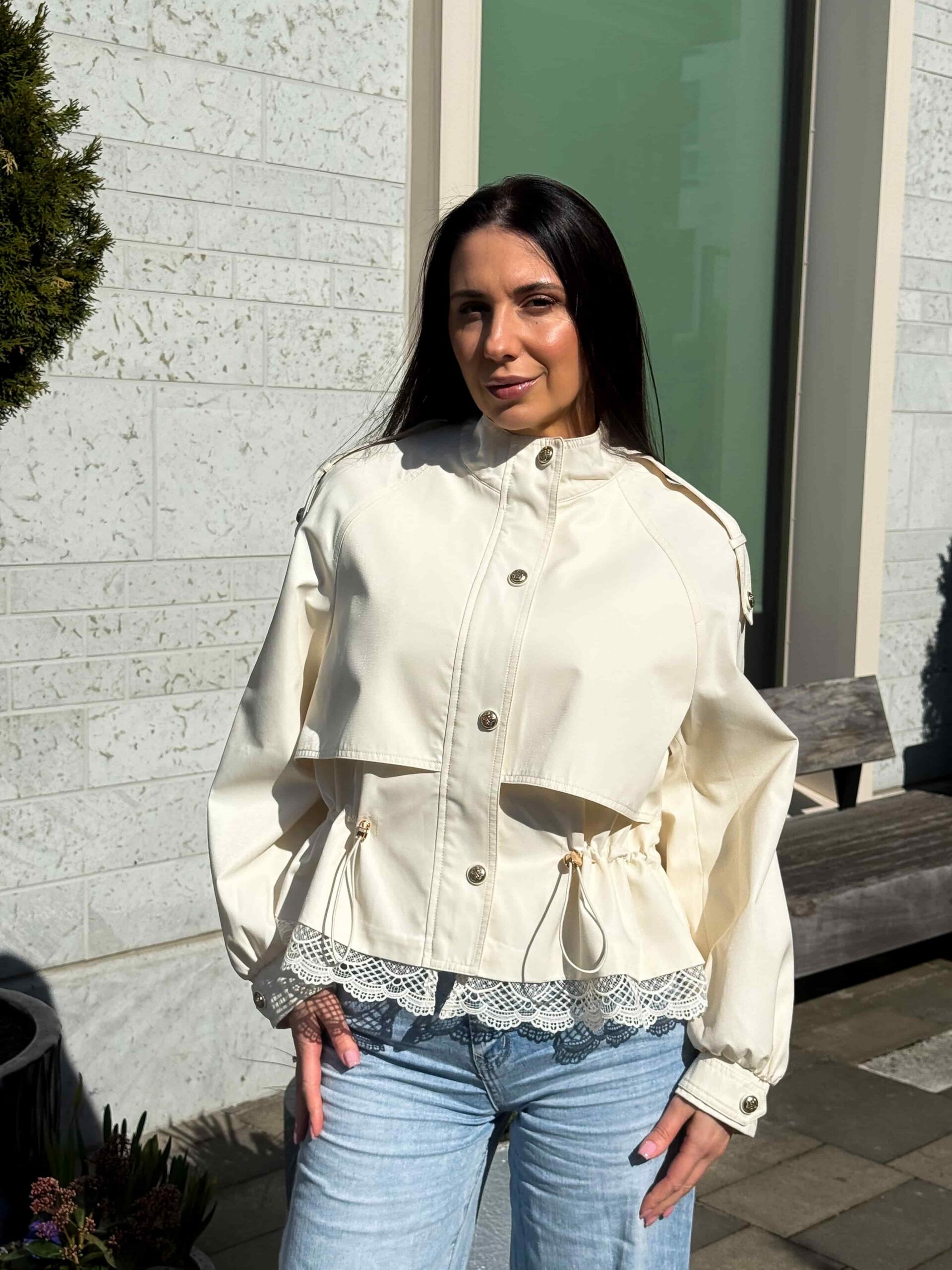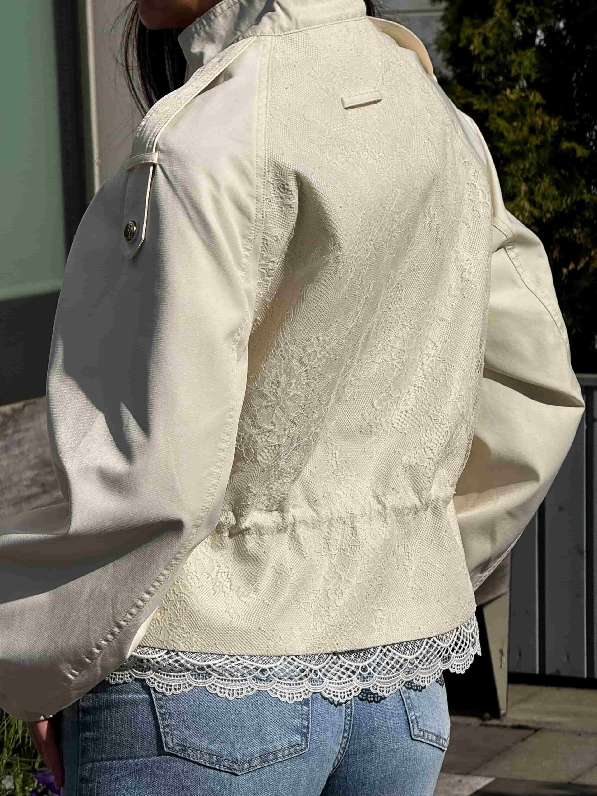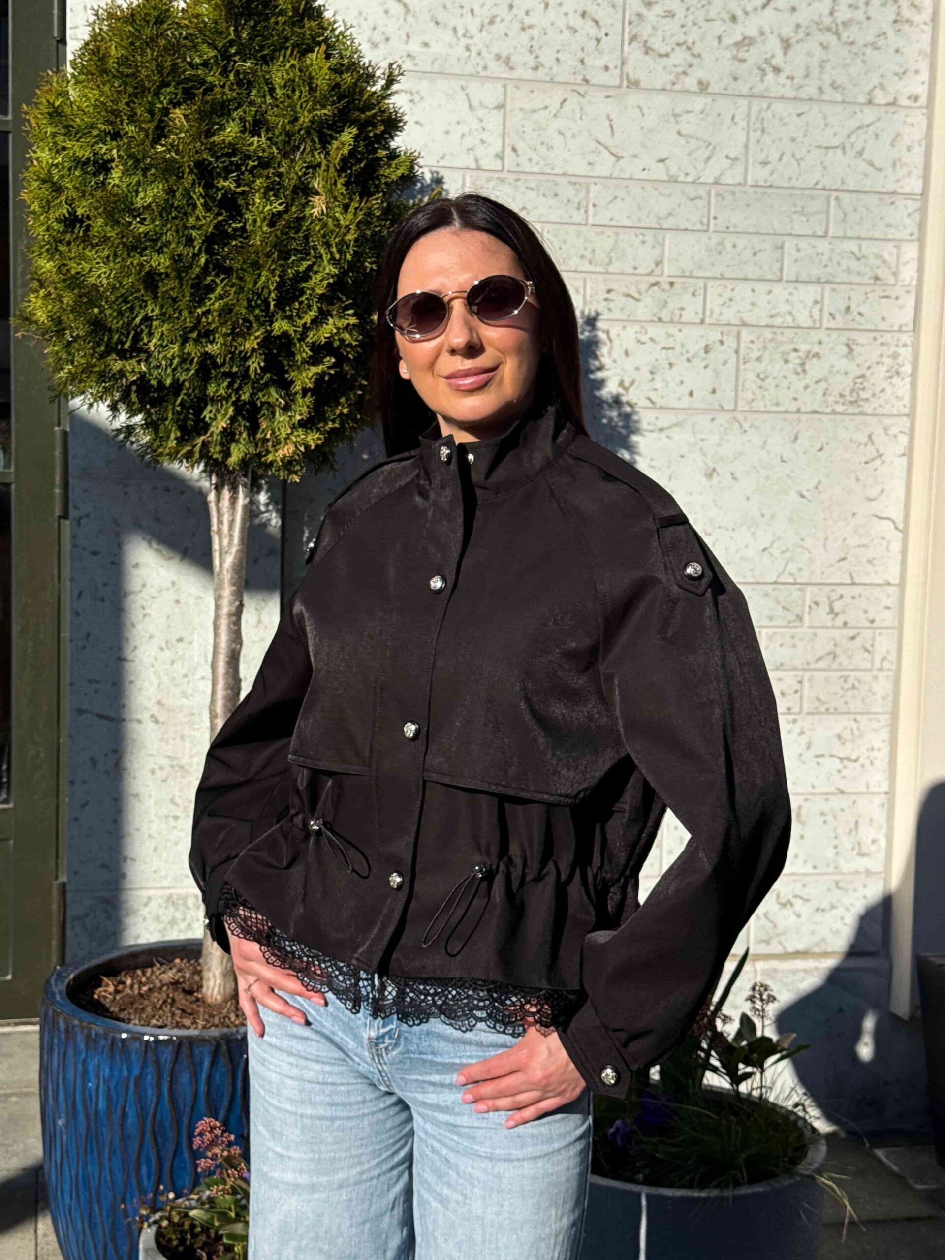 Pitsiga nööritav jope — stiilne ja naiselik ese kaasaegsesse garderoobi. Mudel on lühendatud lõikega, elegantse püstkraega ja peidetud tõmblukuga. Pitsist alläär lisab tootele romantilisust ja õrnust. Pitsiga nööritaval jopel on taljeosas reguleerimisvõimalus, mis võimaldab luua erinevaid siluette. Krae kaitseb heitlike ilmastikuolude eest. Ideaalne jalutuskäikudeks, kohtumisteks ja igapäevaseks kasutamiseks. Kaasaegne disain muudab jope aktuaalseks ja moodsaks. Sobib originaalsete ja stiilsete kombinatsioonide loomiseks. Asendamatu ese iga naise garderoobis.
