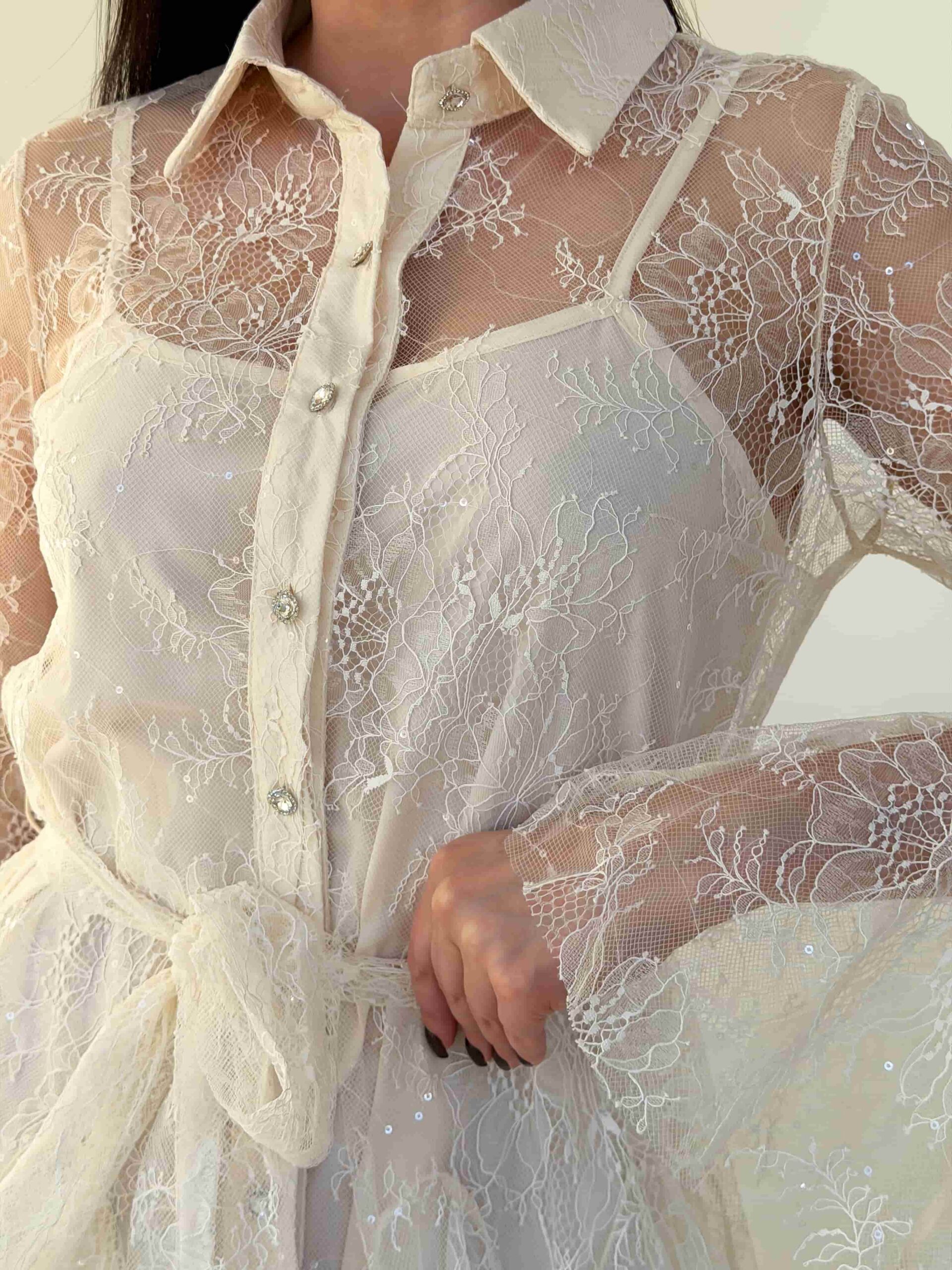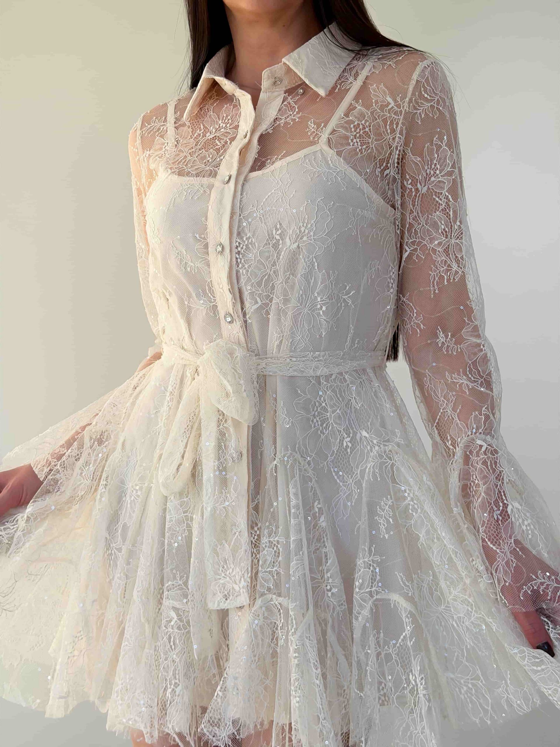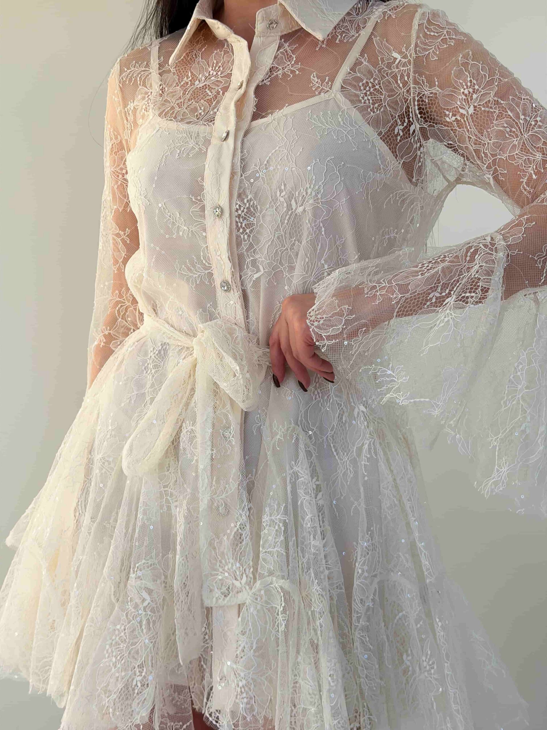 Kleit koos aluskleidiga komplektis on elegantne minipikkuses mudel, mis ühendab kleidi väljendusrikka silueti ja eraldi aluskleidi mugavuse. Kleit istub korralikult õlgadel ja laieneb allapoole. Komplekti kuuluv aluskleit tagab mugavuse ja korrektse istuvuse. Laienevad mansetid lisavad varrukatele kerget teatraalsust ja annavad välimusele volüümi. Vöö võimaldab rõhutada taljet või jätta istuvus vabamaks vastavalt soovile. Kleit koos aluskleidiga komplektis sobib kihilisteks outfitideks ning nii pidulikeks kui ka igapäevasteks väljaminekuteks. Minipikkus rõhutab jalgu ja loob moodsa silueti. Mudel sobitub hästi kingade või rihmik-sandaalidega ning saab garderoobi pilkupüüdvaks osaks.