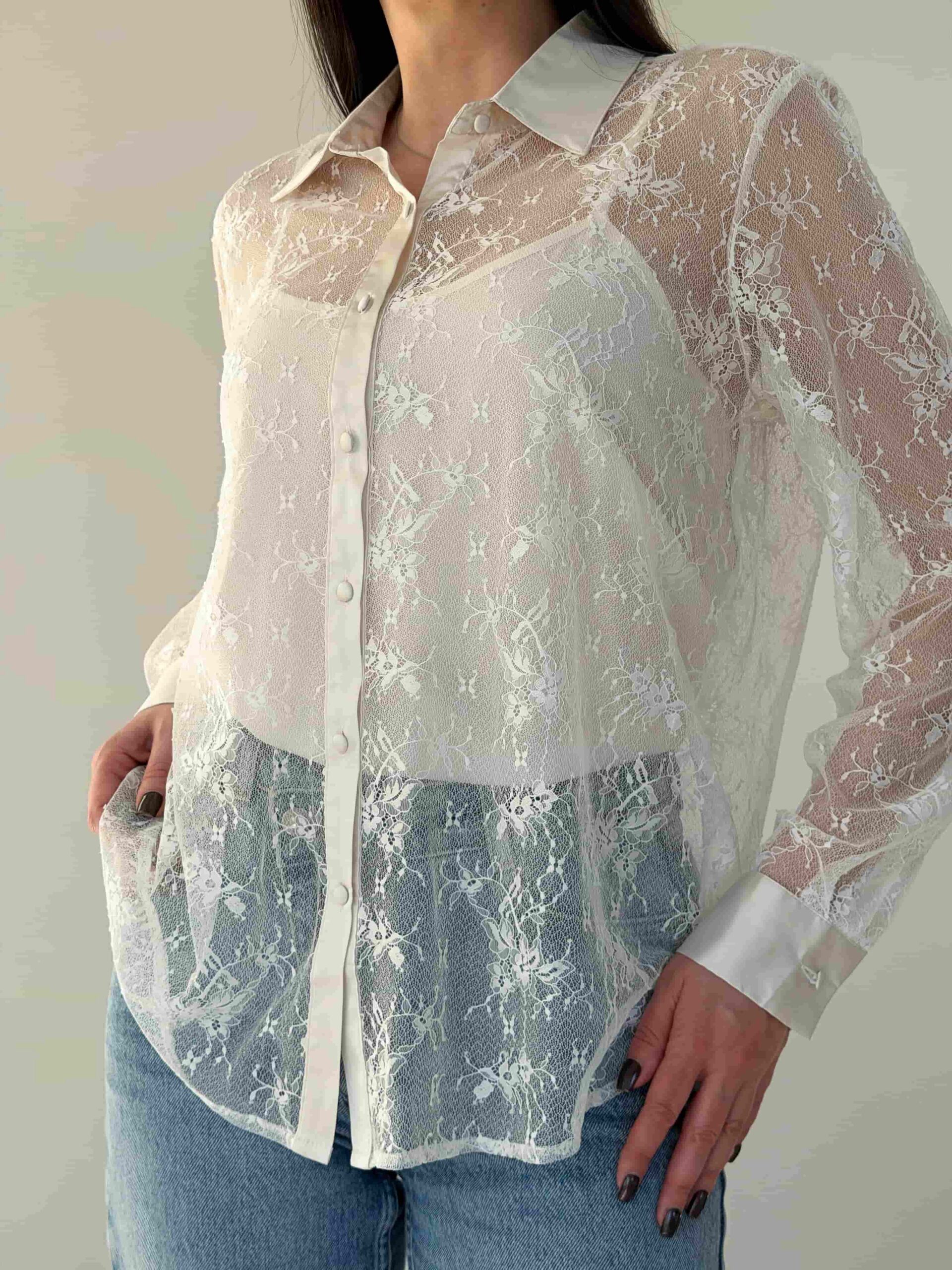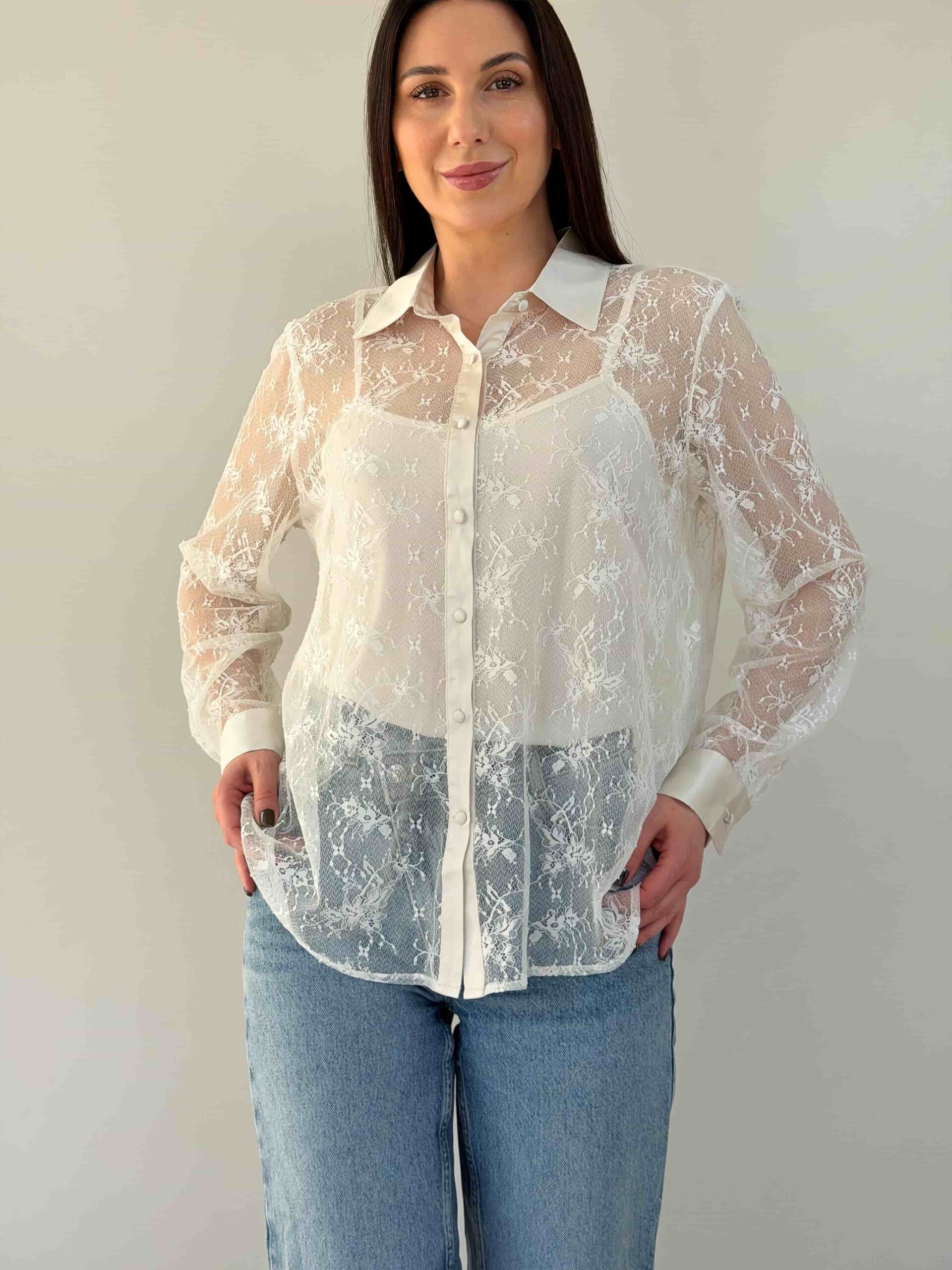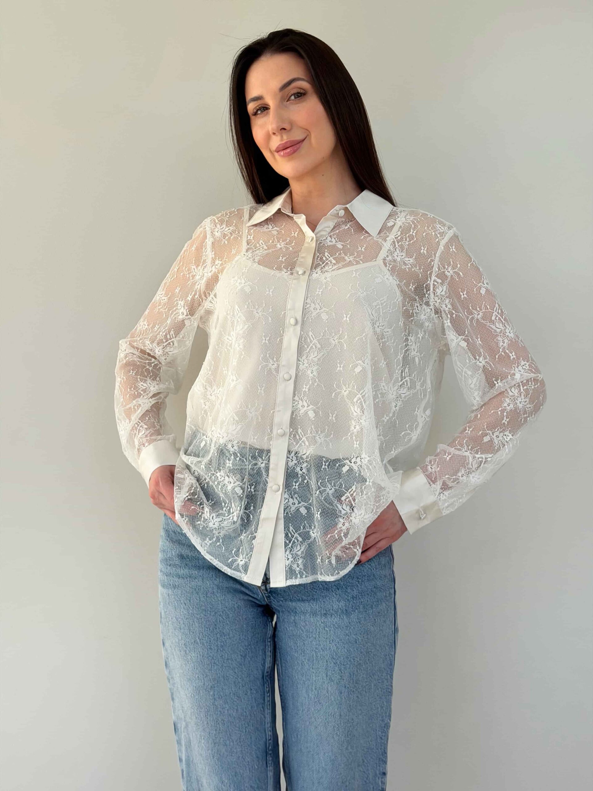 Pluusi ja topi komplekt — elegantne komplekt ärilisteks ja pidulikeks olukordadeks. Pluus on valmistatud poolläbipaistvast pitskangast. Krae ja mansetid on viimistletud satiiniga, andes neile korrektse ja piduliku ilme. Nööbid on samuti kaetud satiinkangaga, rõhutades detailide läbimõeldust. Komplekti kuulub õlapaeltega top, mida saab kanda eraldi või pluusi all kihilise efekti loomiseks. Pluusi ja topi komplekt sobitub hästi seeliku ja pükstega. Kerge istuvus tagab mugavuse kogu päeva vältel. Komplekt sobib nii kontorisse kui ka õhtustele kohtumistele.