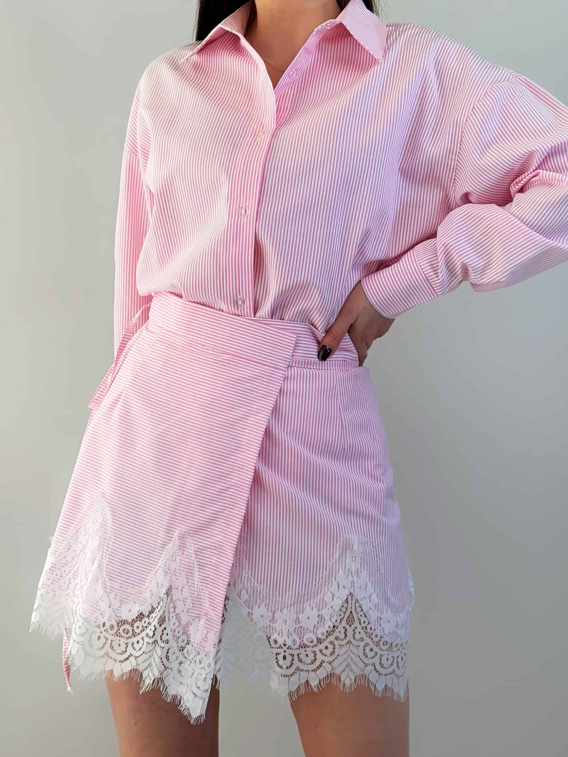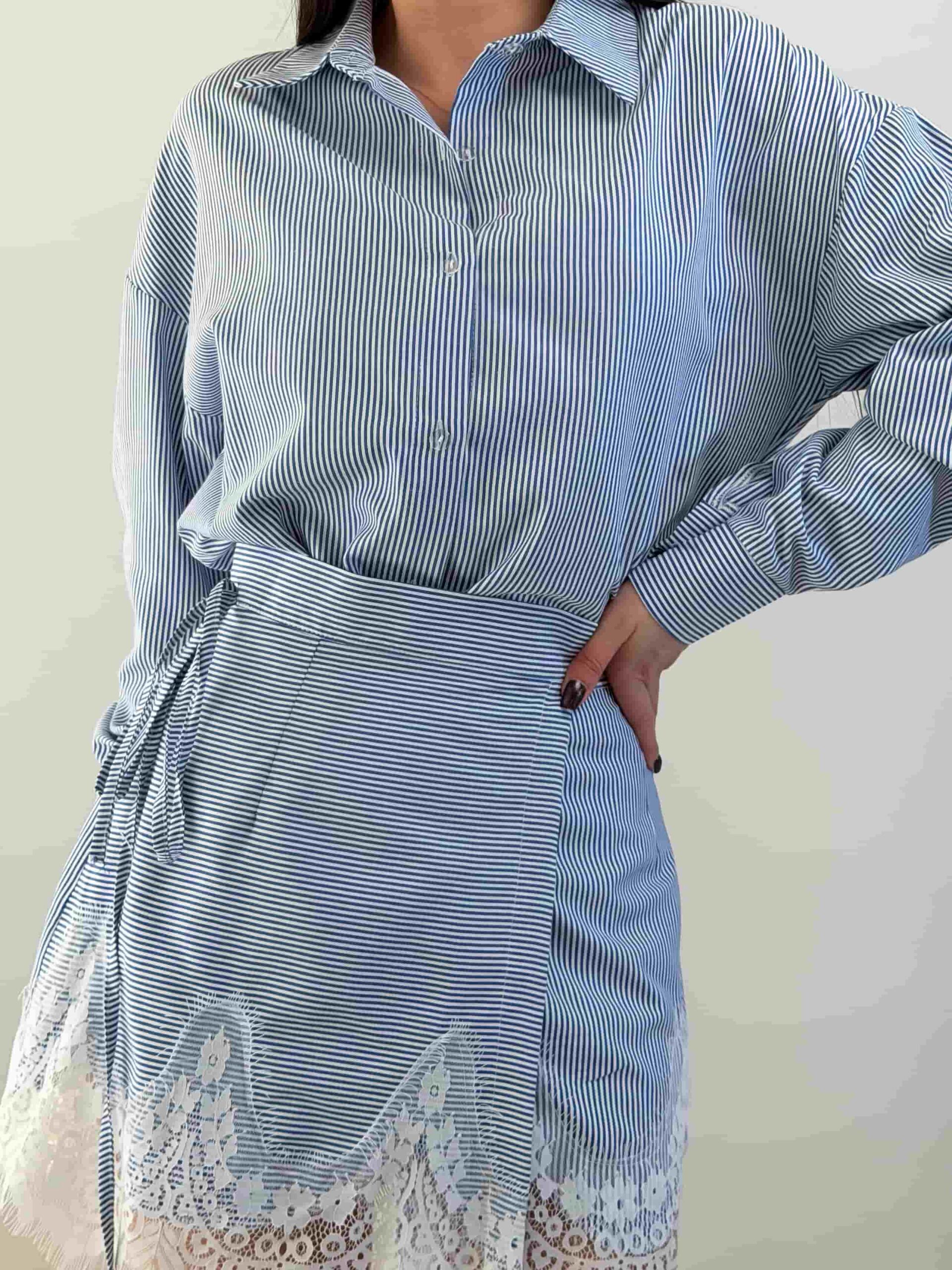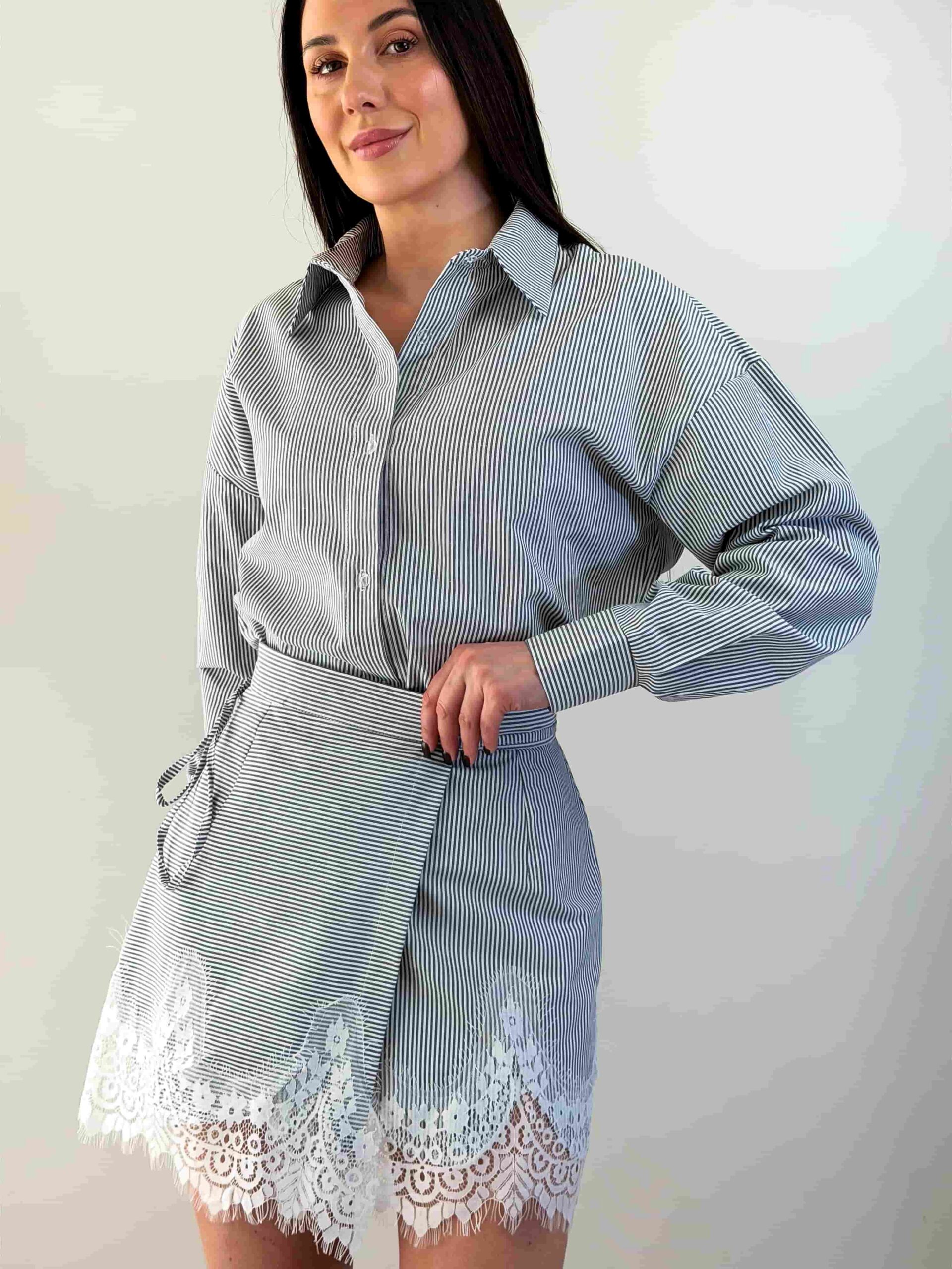 Särgi ja seeliku komplekt — elegantne õhukese triibumustriga komplekt. Sirgelõikeline pikendatud särk kinnitub nööpidega ning on kaunistatud õrna pitsviimistlusega. Seelik seotakse vöökohalt ning loob elegantse silueti ja liikumisvabaduse. Pitsiline viimistlus allääres lisab romantilise aktsendi. Esemeid saab kanda eraldi ja kombineerida teiste garderoobielementidega. Komplekt sobib nii kontorisse kui ka seltskondlikele üritustele. See komplekt saab teie garderoobi stiilseks põhiesemeks.