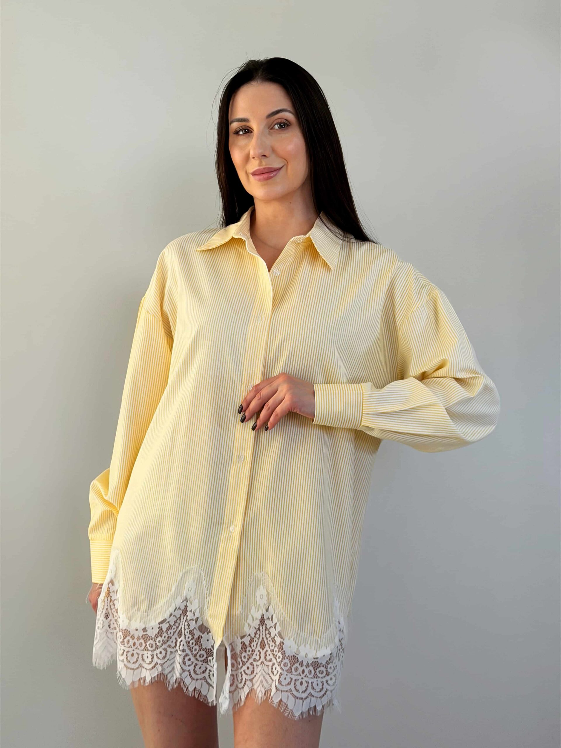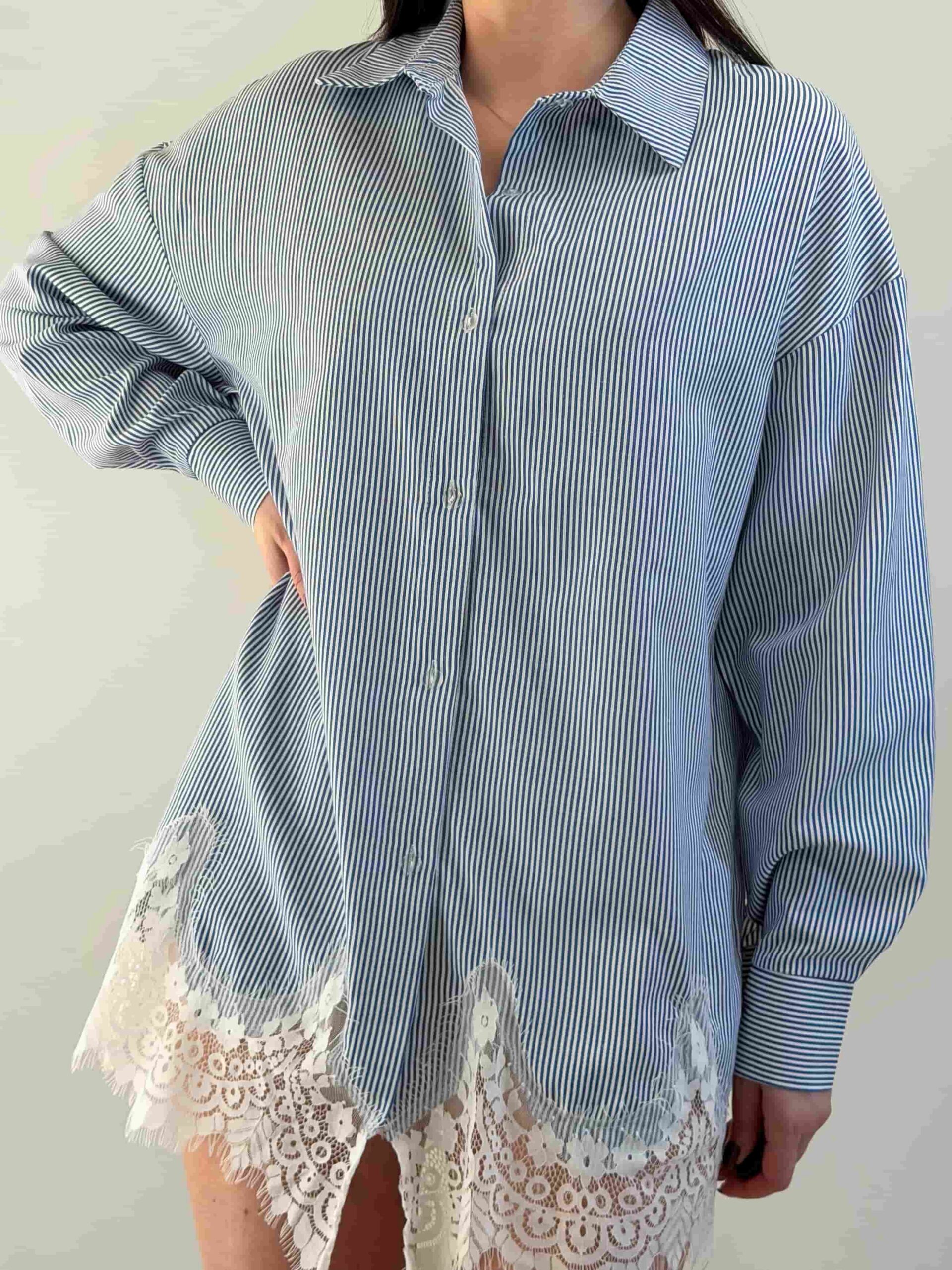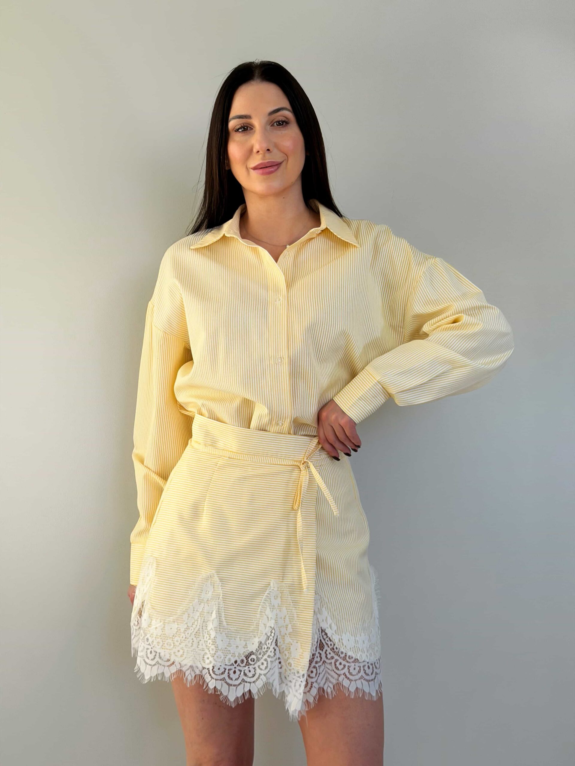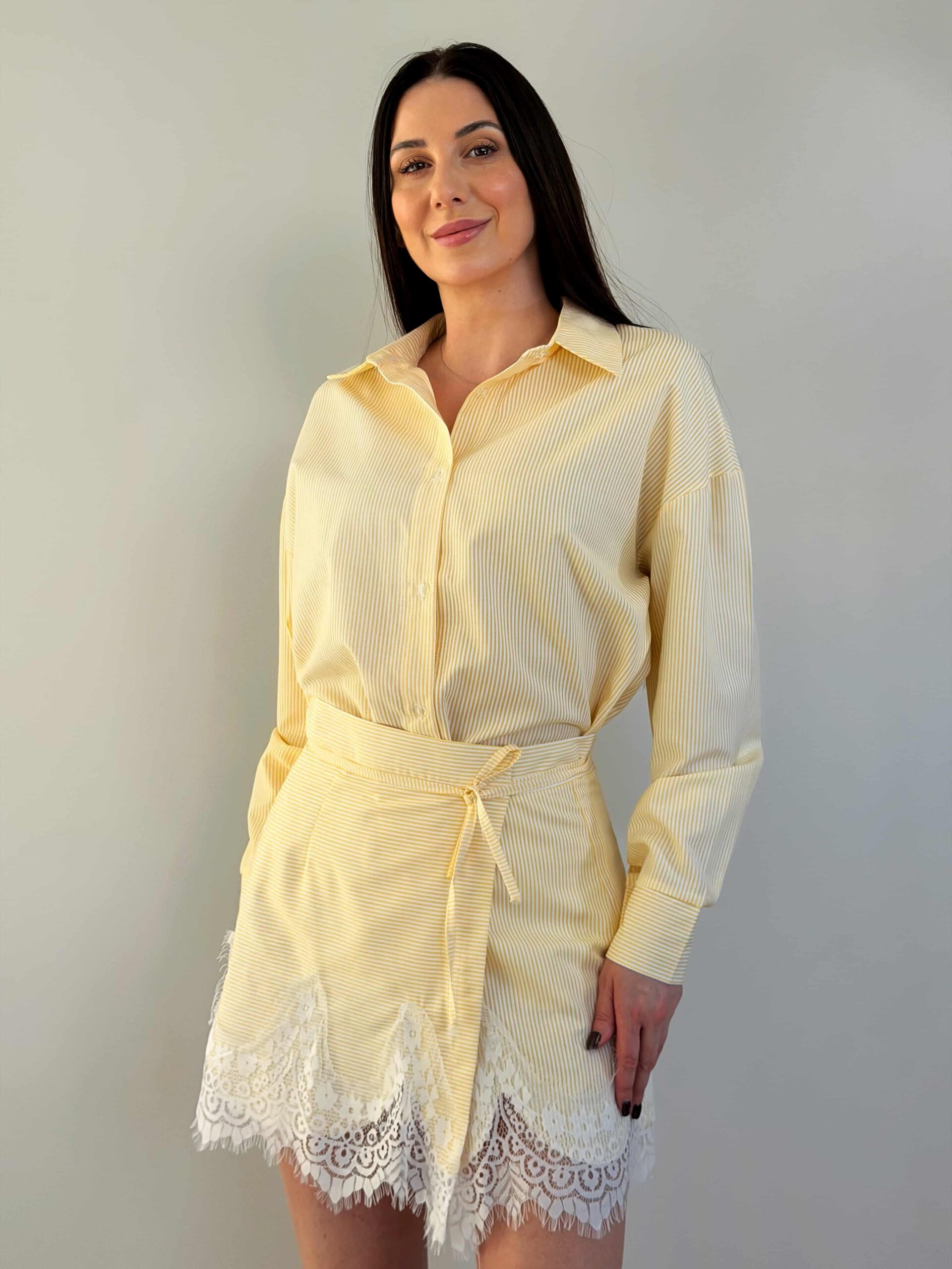Särgi ja seeliku komplekt — elegantne õhukese triibumustriga komplekt. Sirgelõikeline pikendatud särk kinnitub nööpidega ning on kaunistatud õrna pitsviimistlusega. Seelik seotakse vöökohalt ning loob elegantse silueti ja liikumisvabaduse. Pitsiline viimistlus allääres lisab romantilise aktsendi. Esemeid saab kanda eraldi ja kombineerida teiste garderoobielementidega. Komplekt sobib nii kontorisse kui ka seltskondlikele üritustele. See komplekt saab teie garderoobi stiilseks põhiesemeks.