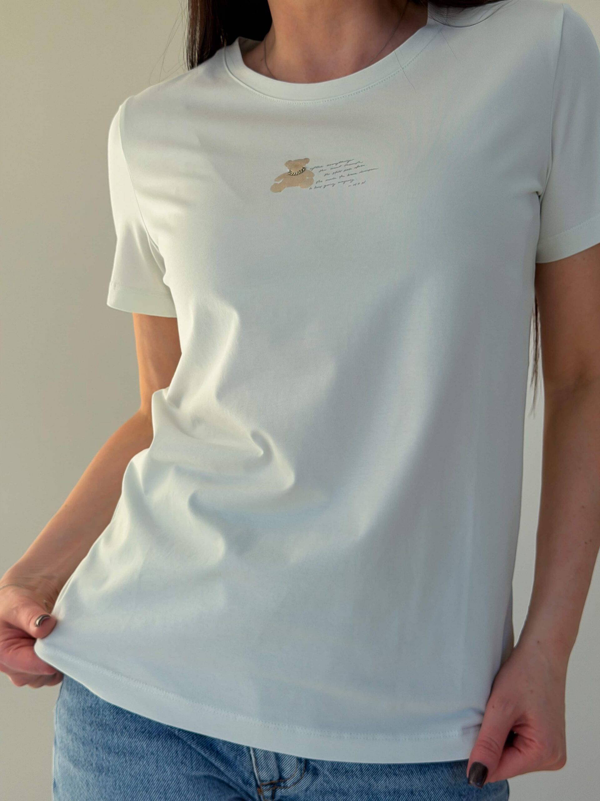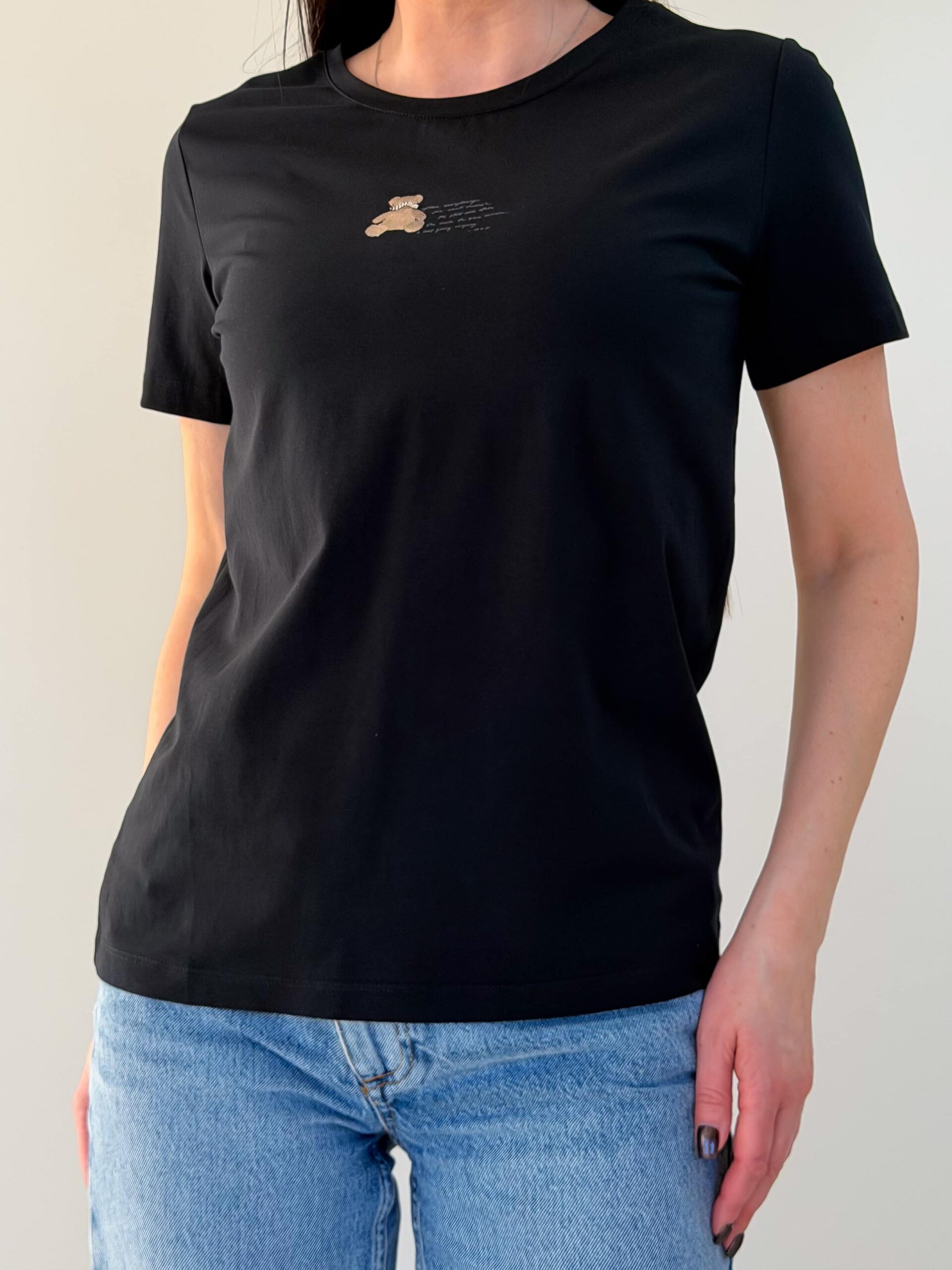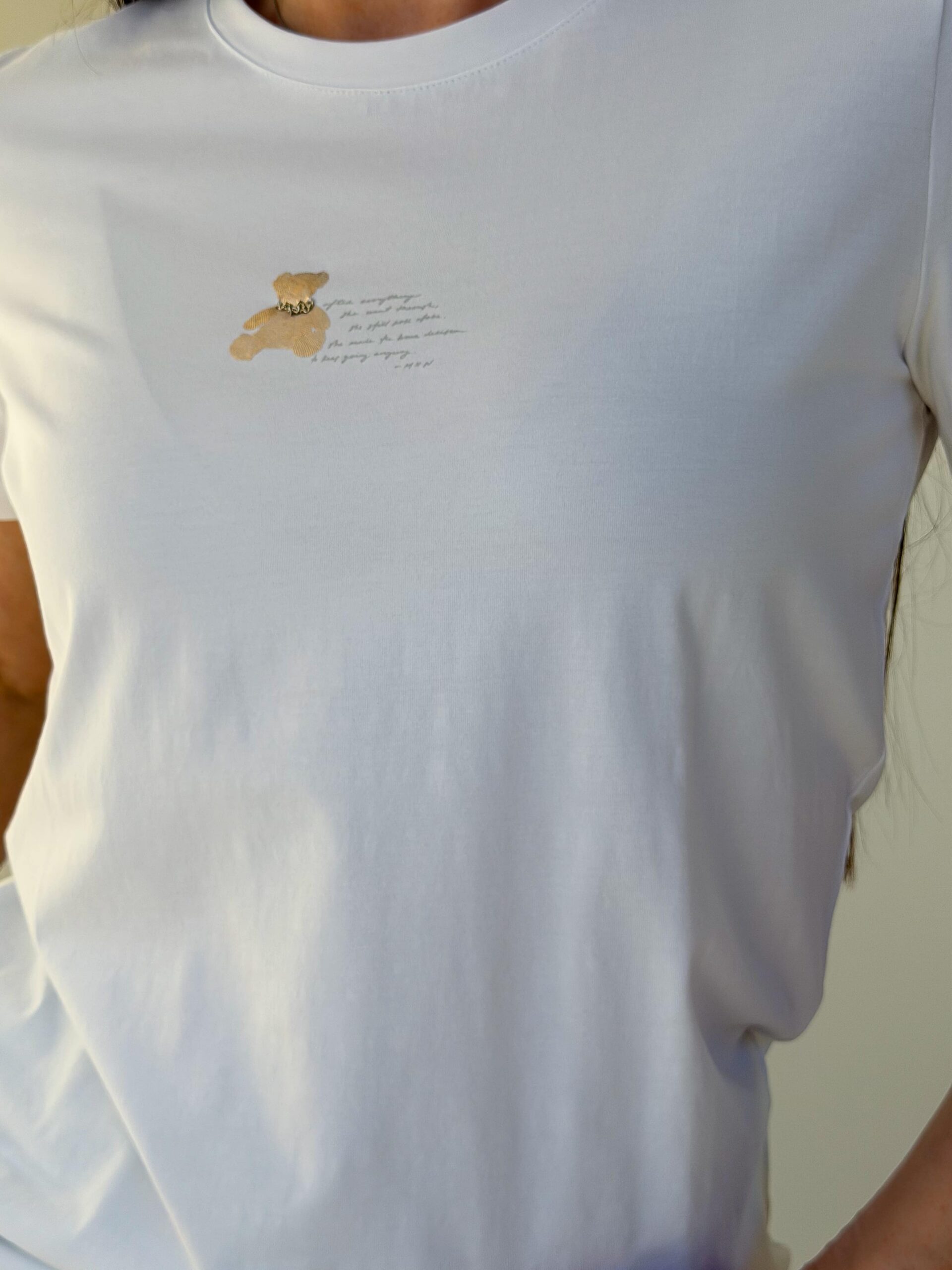 T-särk karukesega on hubane ja stiilne baasmudel, saadaval mitmes värvitoonis. Õrn karukujuline trükis rinnal annab rõivale mängulise iseloomu ja muudab selle silmapaistvaks osaks garderoobist. Kangas on pehme ja meeldiv naha vastas, mistõttu T-särk sobib mugavaks igapäevaseks kandmiseks. Lühikesed varrukad ja klassikaline sirge lõige tagavad universaalsuse ja lihtsa kombineeritavuse. T-särk karukesega sobib hästi teksade, seelikute ja lühikeste pükstega. See on ideaalne jalutuskäikudeks, sõpradega kohtumiseks ja koduseks kandmiseks.