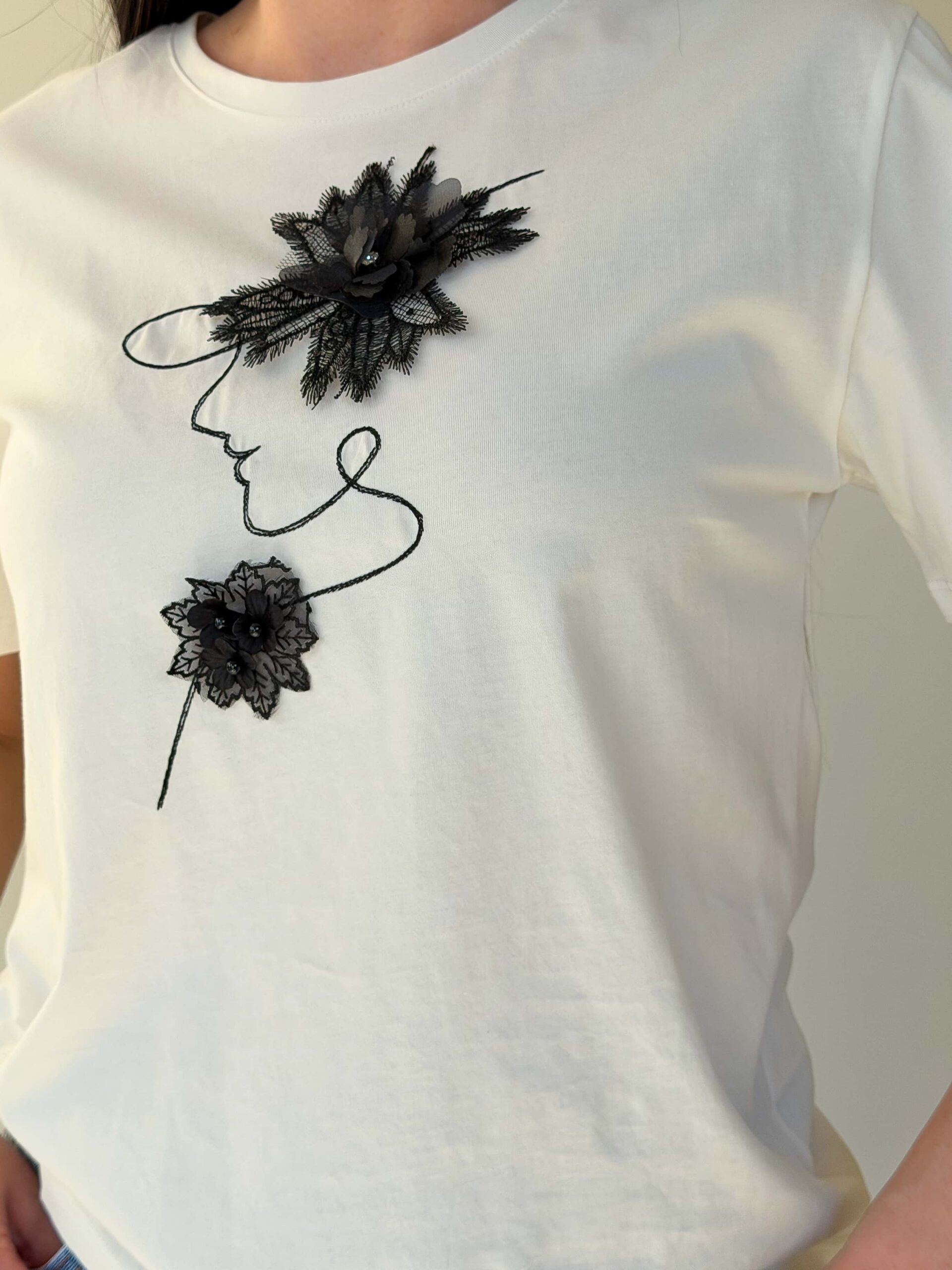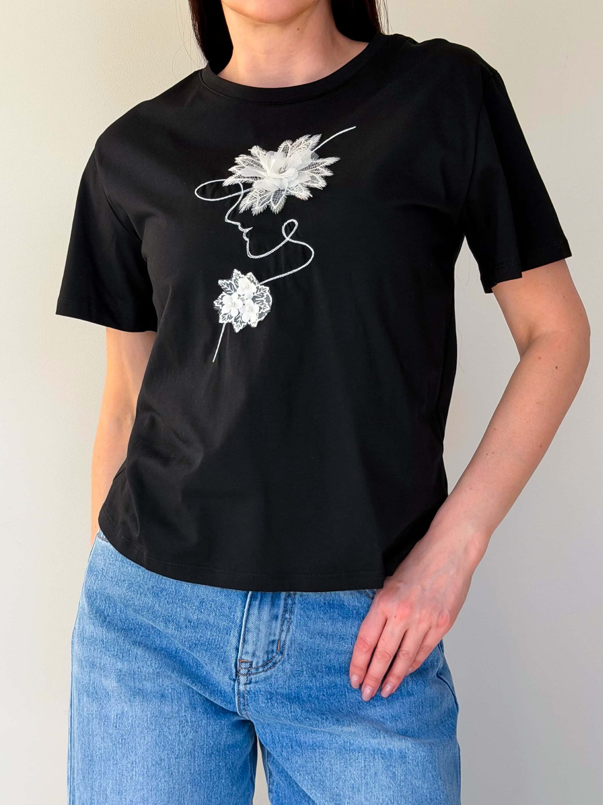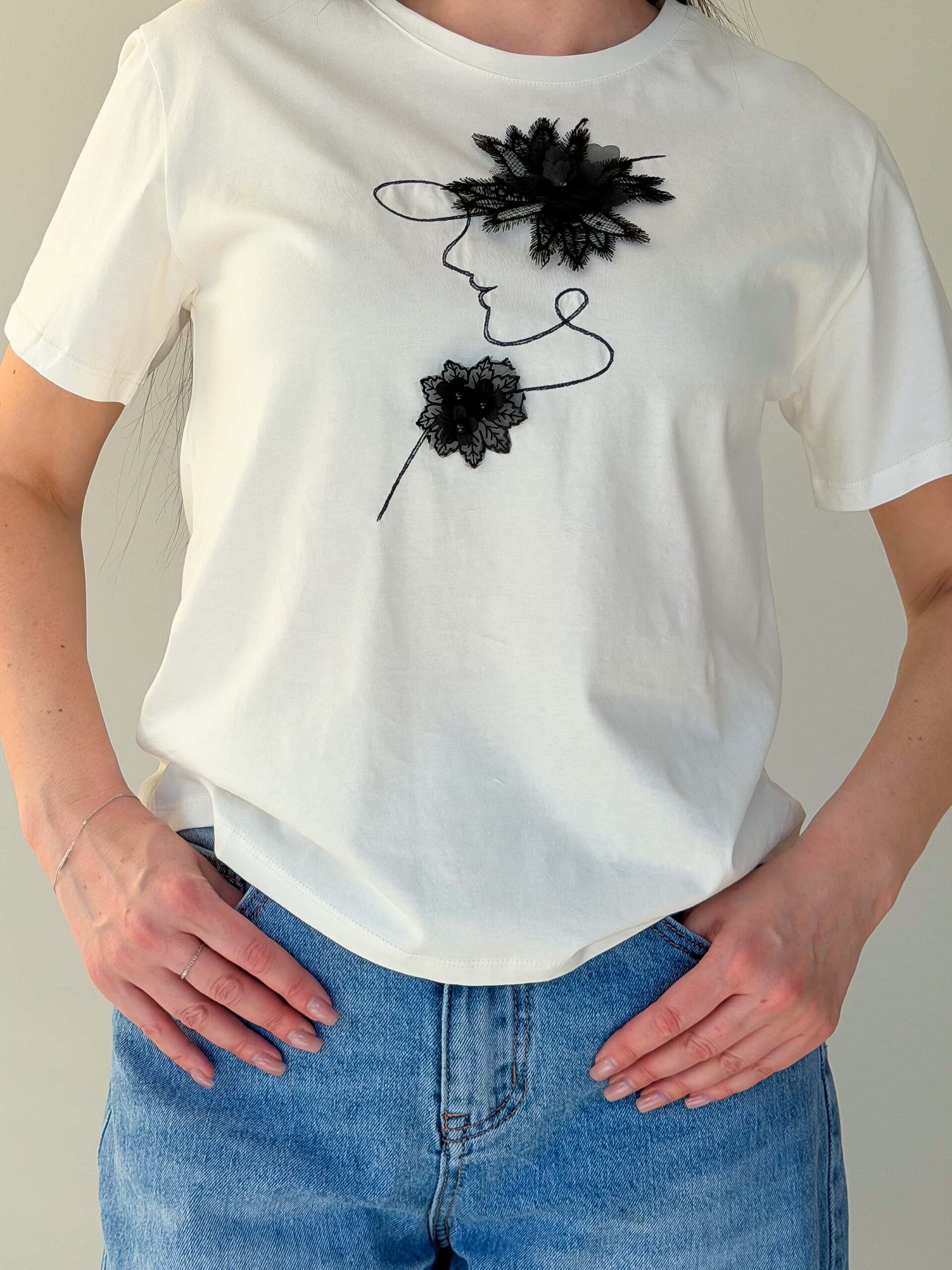 Naiste T-särk — elegantne ja praktiline mudel pehmest puuvillast. Mudel on saadaval kahes põhivärvis — valges ja mustas. Õrn kaunistus lille kujul rinnal ning elegantne naise profiili siluett lisavad tootele isikupära, säilitades samal ajal baaseseme universaalsuse. See naiste T-särk sobib nii igapäevasteks kui ka veidi pidulikumateks komplektideks: seda on lihtne kombineerida teksade, seelikute või jakiga ning läbimõeldud lõige rõhutab õlajoont ja taljet, tagades mugavuse kogu päevaks.