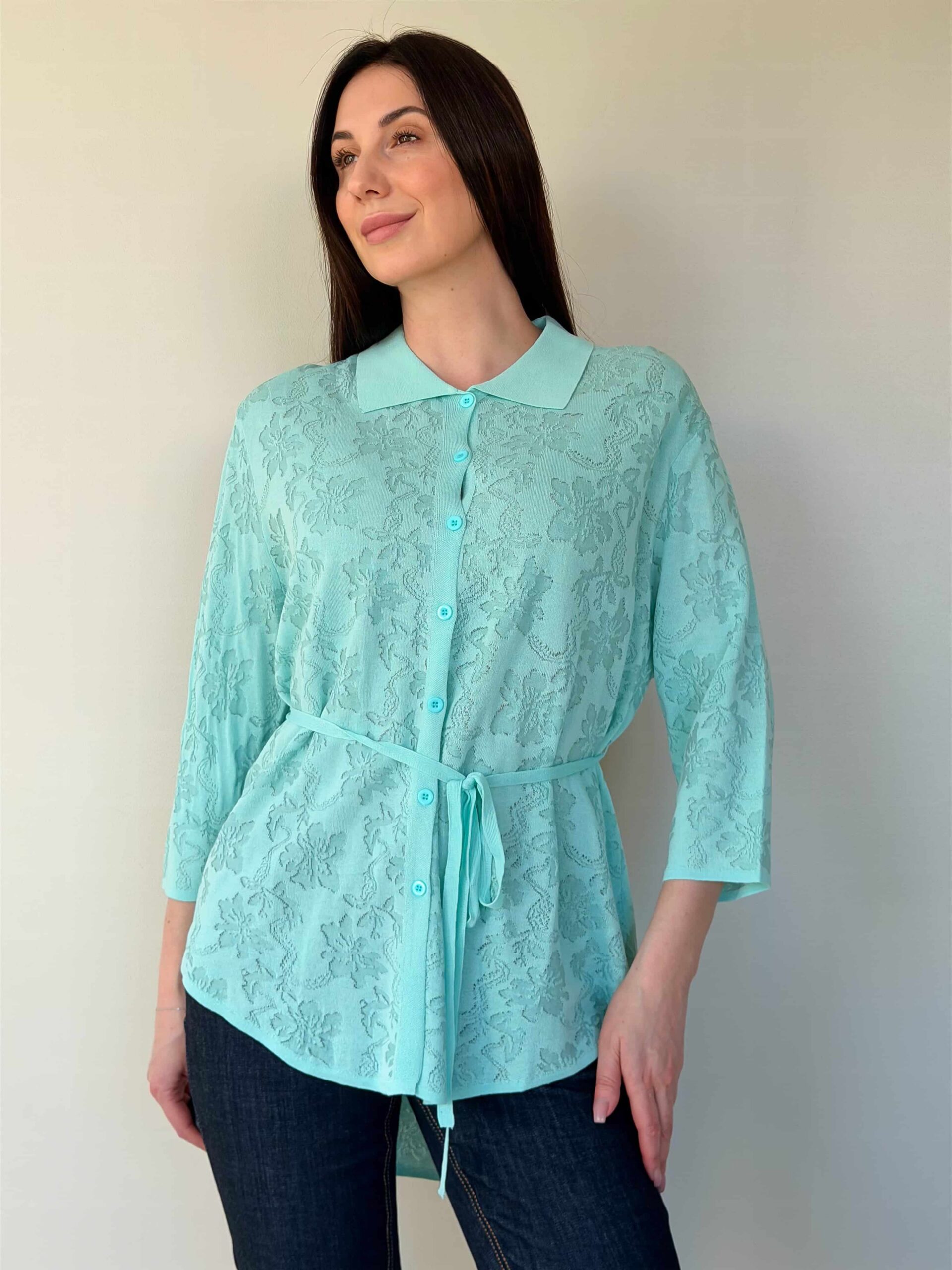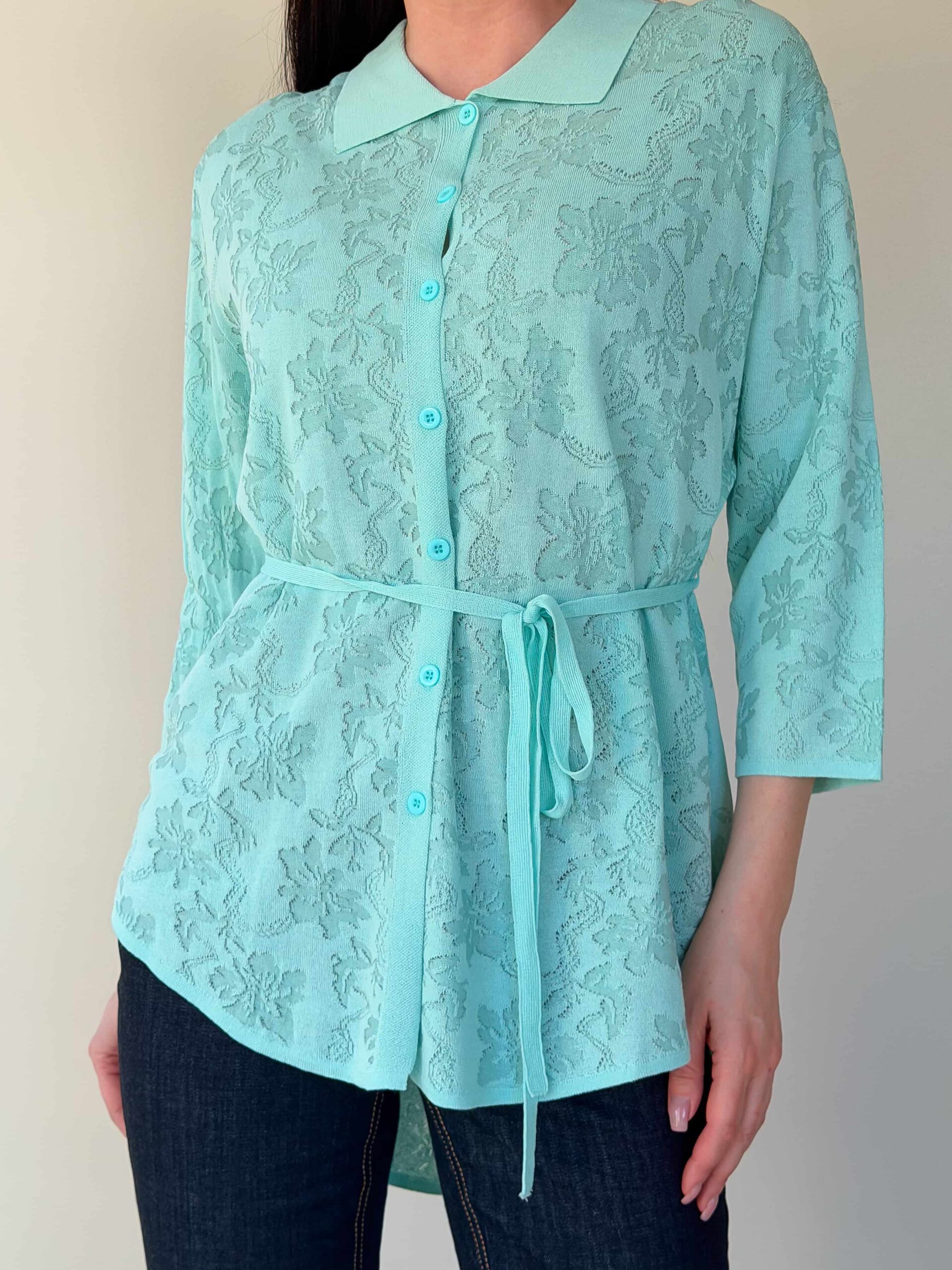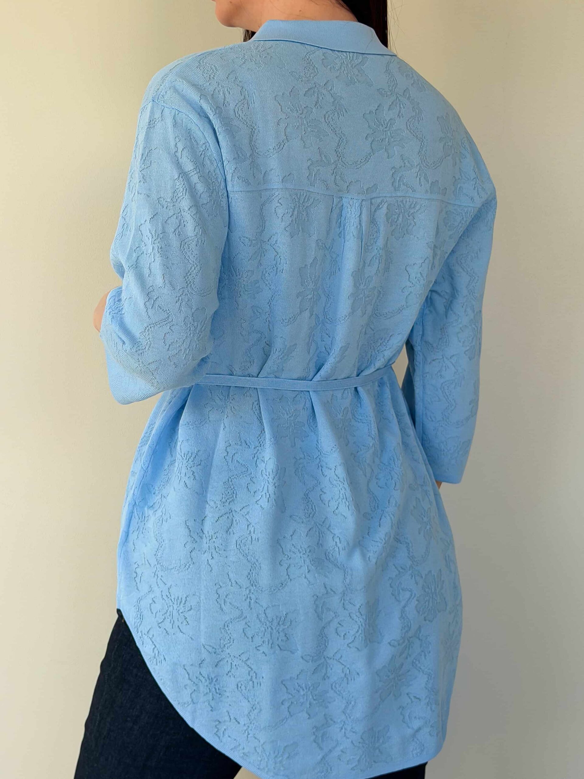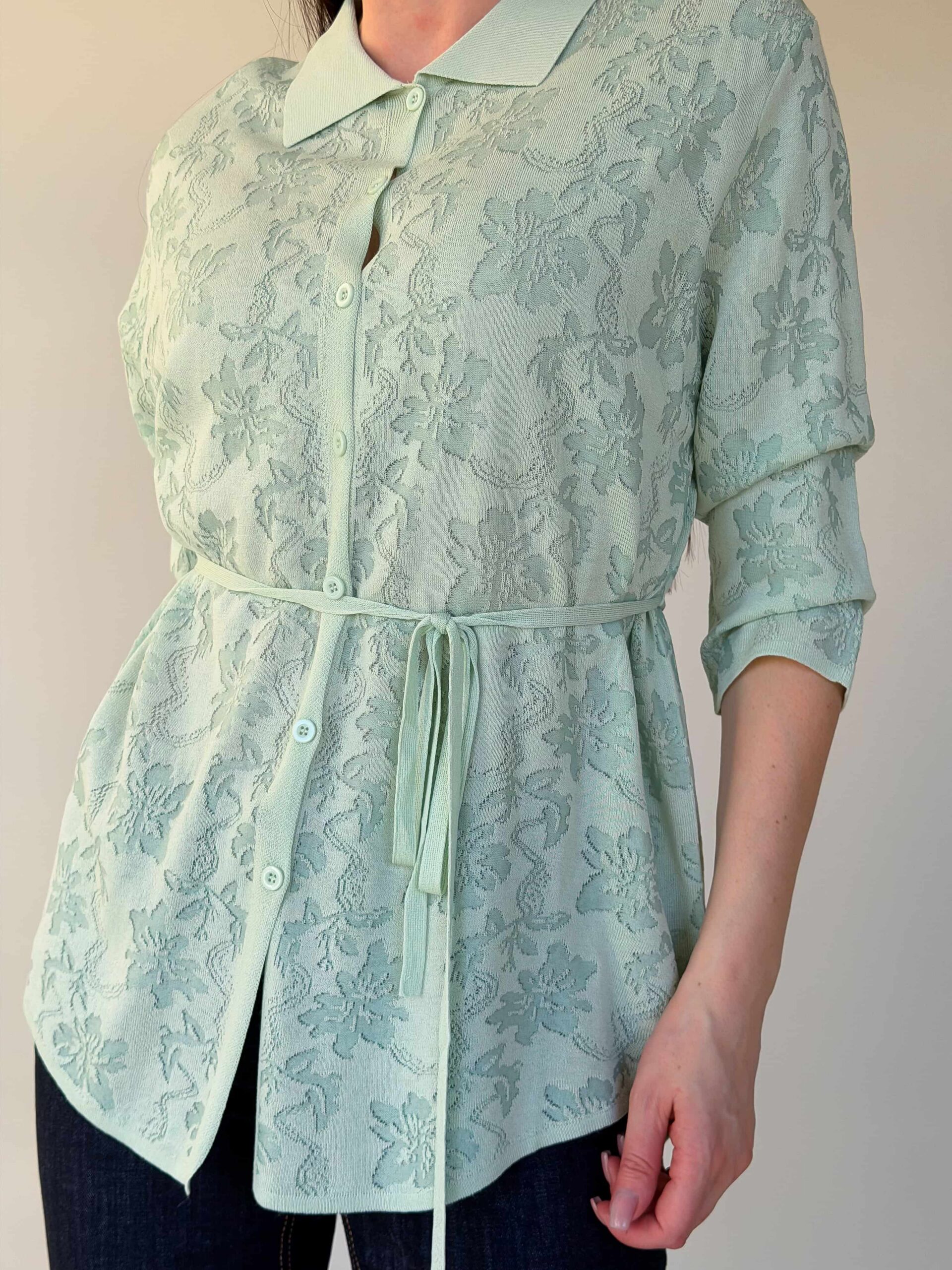Vööga kardigan — elegantne mudel stiilsete lookide loomiseks, rõhutades taljet. Pikendatud lõige siluett visuaalselt saledamaks ja sobib harmooniliselt nii seeliku kui pükstega. Mudel on valmistatud ühevärvilise lillemustriga kangast. Reljeefne muster lisab õrna romantilist nooti ilma teravate kontrastideta. Õhuke vöö reguleerib istuvust ja loob liivakella-kujulise silueti. 3/4 varrukad annavad lookile elegantset kerget tunnet ja on mugavad igapäevases kandmises. Vööga kardigan sobib suurepäraselt nii kontorisse kui jalutuskäikudele tänu tagasihoidlikule dekoratsioonile ja läbimõeldud pikkusele.