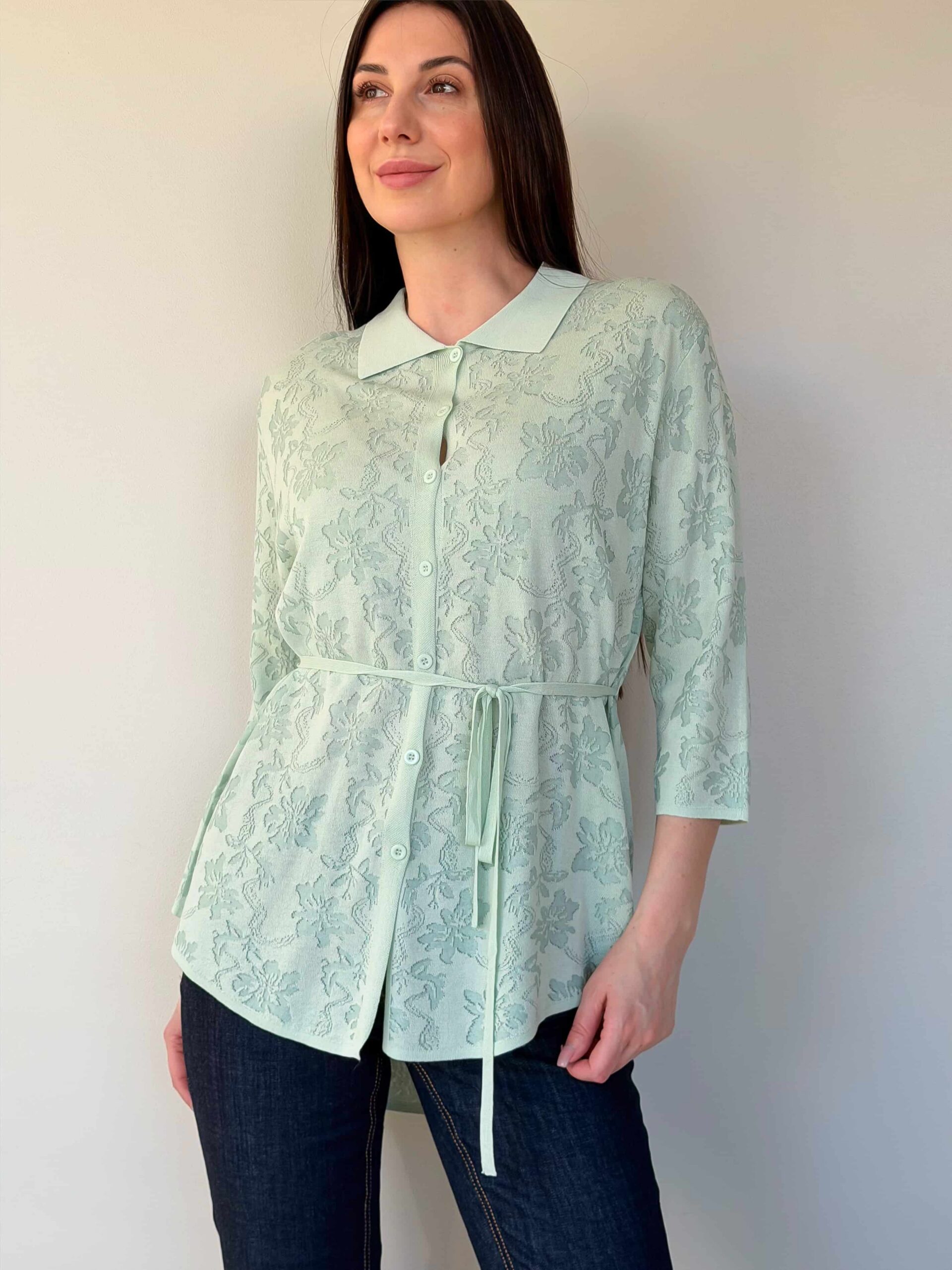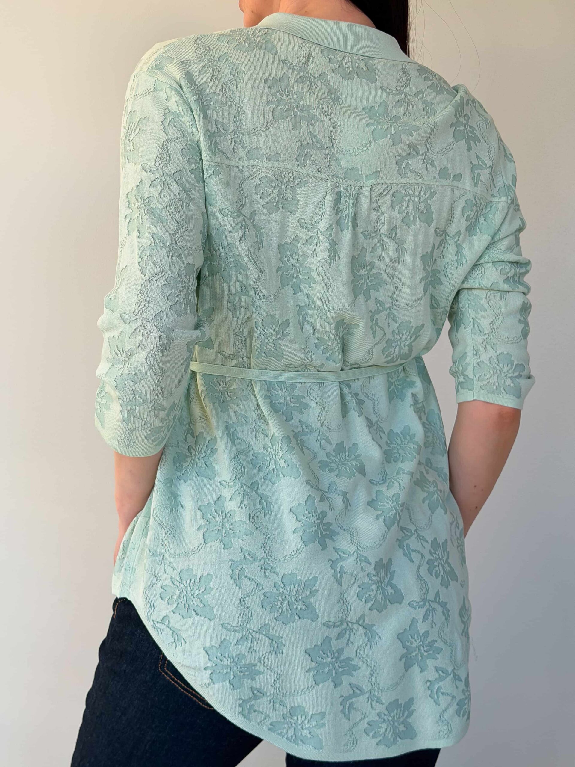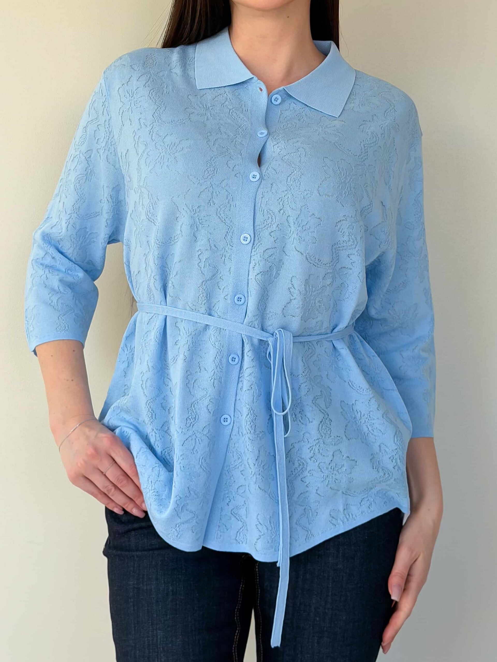Vööga kardigan — elegantne mudel stiilsete lookide loomiseks, rõhutades taljet. Pikendatud lõige siluett visuaalselt saledamaks ja sobib harmooniliselt nii seeliku kui pükstega. Mudel on valmistatud ühevärvilise lillemustriga kangast. Reljeefne muster lisab õrna romantilist nooti ilma teravate kontrastideta. Õhuke vöö reguleerib istuvust ja loob liivakella-kujulise silueti. 3/4 varrukad annavad lookile elegantset kerget tunnet ja on mugavad igapäevases kandmises. Vööga kardigan sobib suurepäraselt nii kontorisse kui jalutuskäikudele tänu tagasihoidlikule dekoratsioonile ja läbimõeldud pikkusele.
