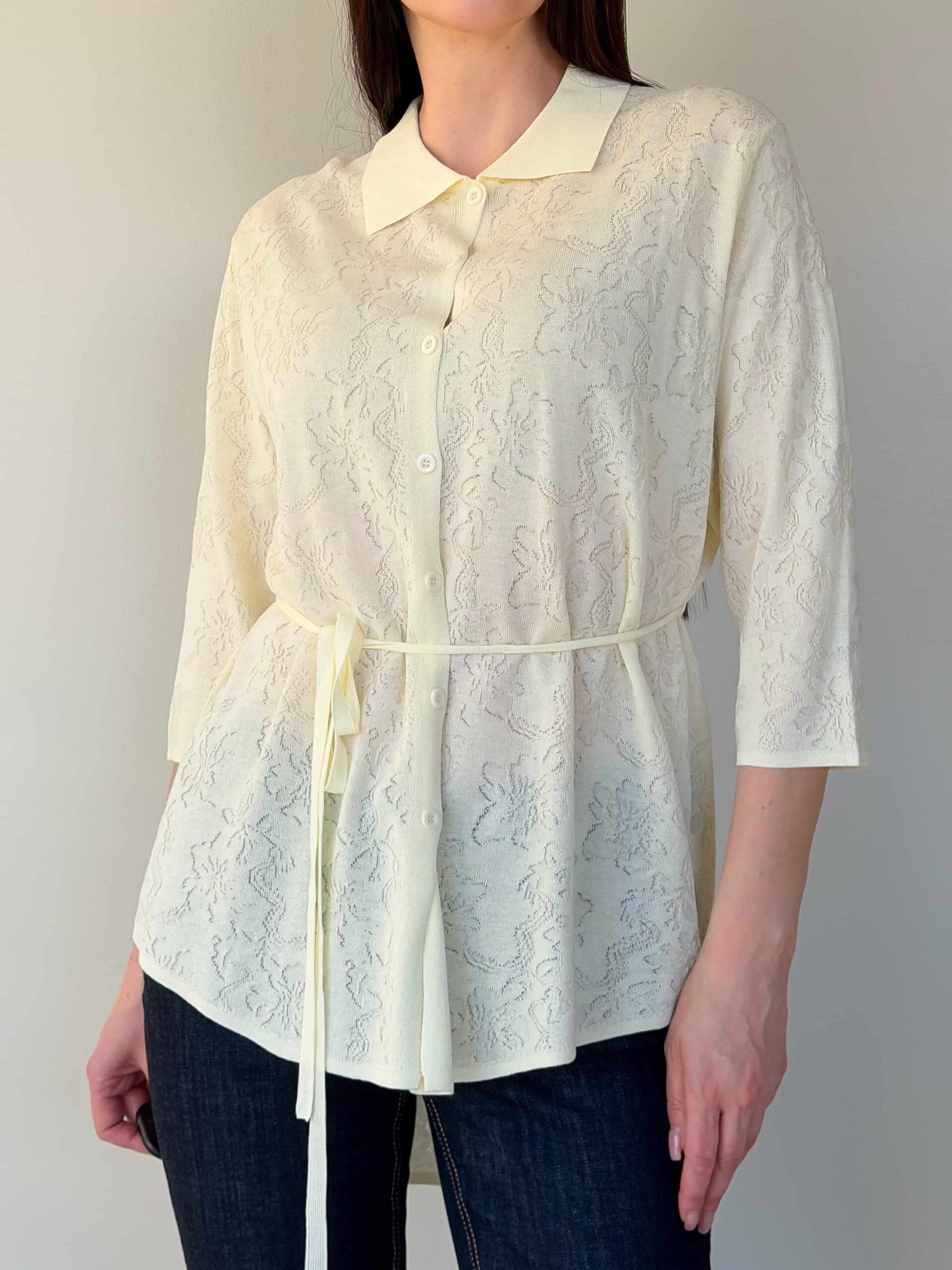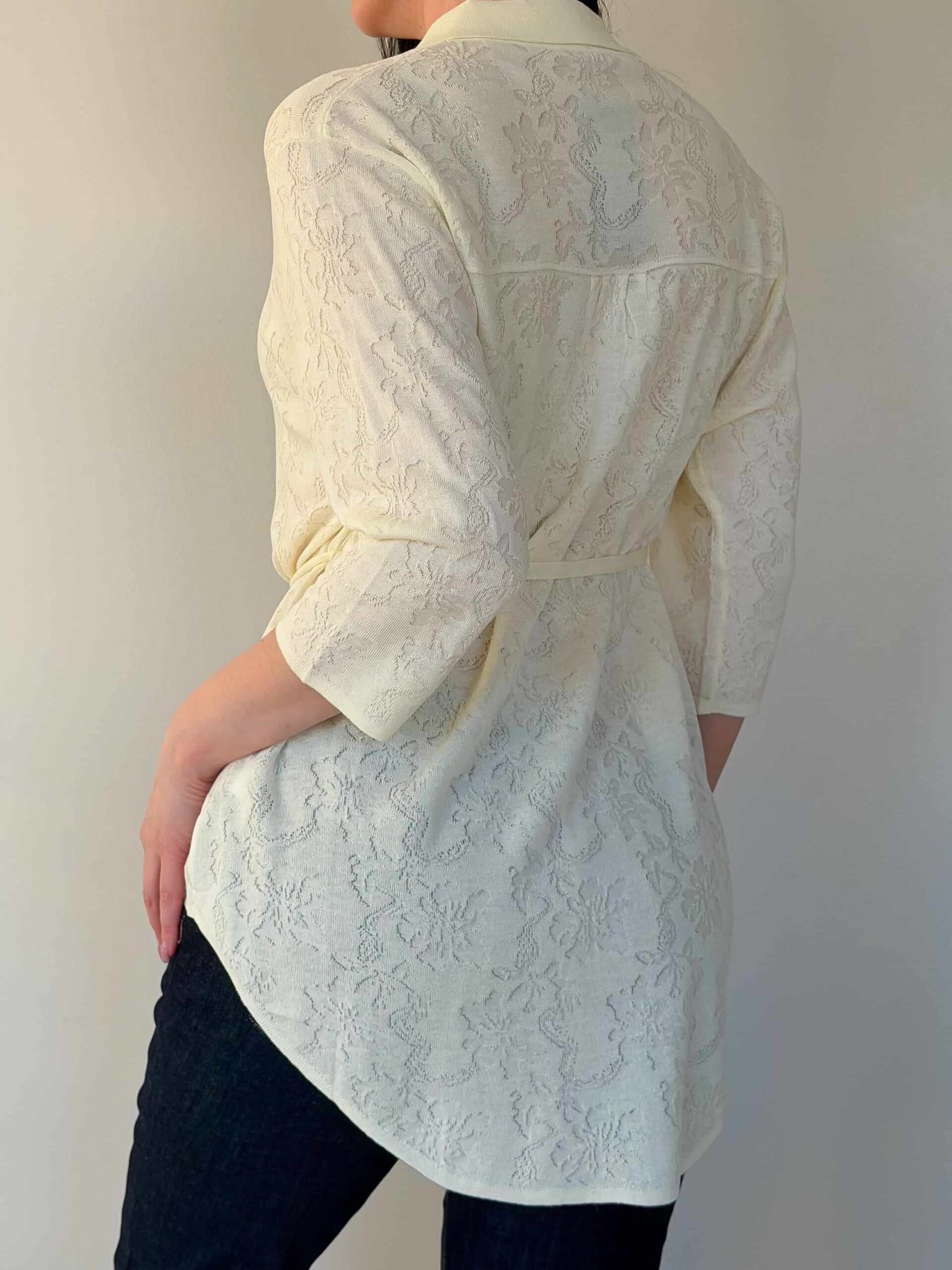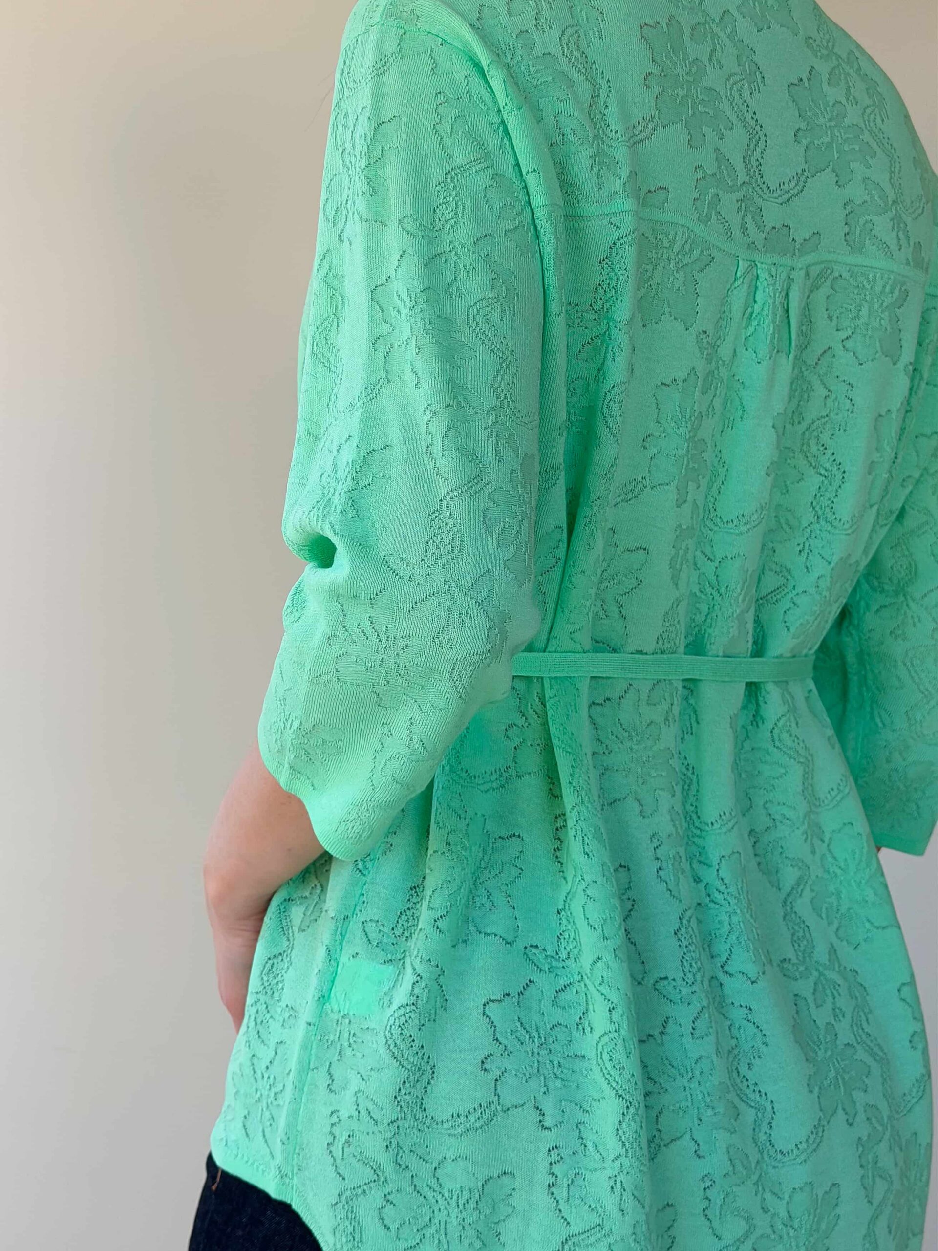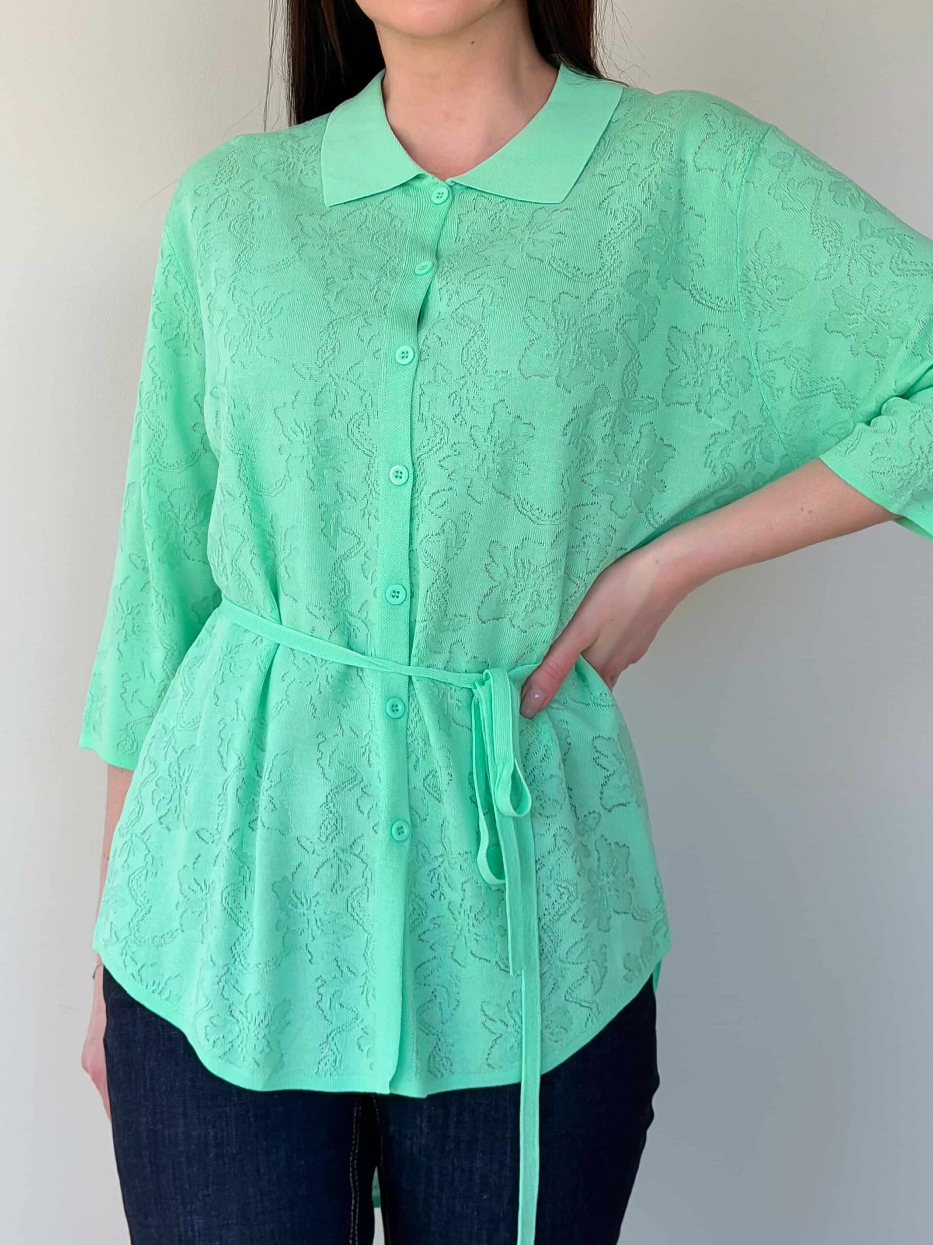 Vööga kardigan — elegantne mudel stiilsete lookide loomiseks, rõhutades taljet. Pikendatud lõige siluett visuaalselt saledamaks ja sobib harmooniliselt nii seeliku kui pükstega. Mudel on valmistatud ühevärvilise lillemustriga kangast. Reljeefne muster lisab õrna romantilist nooti ilma teravate kontrastideta. Õhuke vöö reguleerib istuvust ja loob liivakella-kujulise silueti. 3/4 varrukad annavad lookile elegantset kerget tunnet ja on mugavad igapäevases kandmises. Vööga kardigan sobib suurepäraselt nii kontorisse kui jalutuskäikudele tänu tagasihoidlikule dekoratsioonile ja läbimõeldud pikkusele.