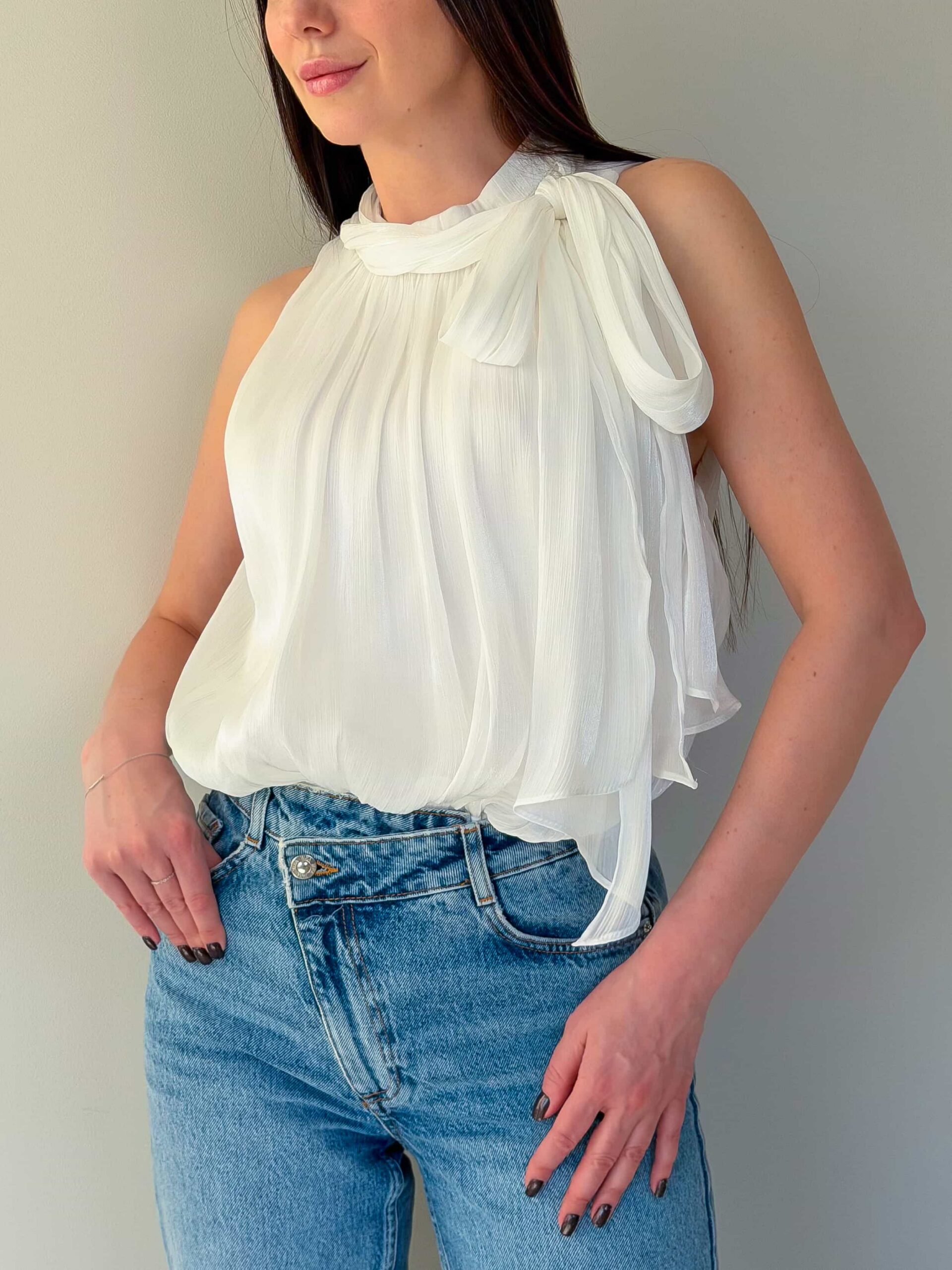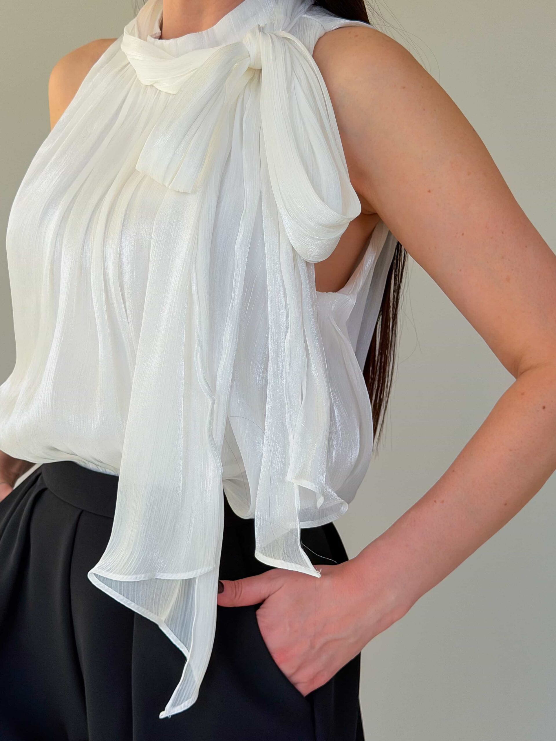 Боди с бантом — элегантная и женственная модель для романтичных и вечерних образов. Модель выполнена из струящейся ткани, которая мягко драпируется по фигуре и подчёркивает ваш силуэт. Белый цвет придаёт чистоту и свежесть образу. Бант на горловине служит декоративным акцентом. Продуманная посадка обеспечивает гладкую и незаметную линию под одеждой. Нижняя часть боди фиксирует изделие, делая его практичным в повседневности и на мероприятиях. Боди с бантом легко сочетать с брюками, юбками и шортами, создавая как лёгкие дневные, так и более нарядные вечерние комплекты.