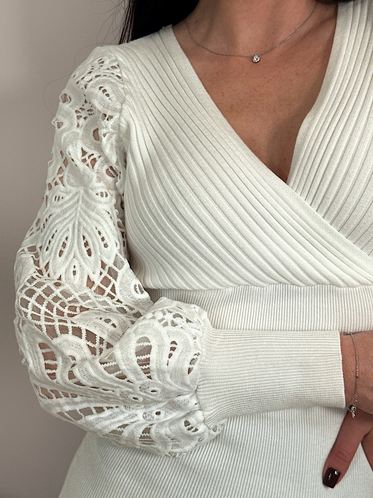 Воздушный джемпер с игрой контрастов. Смелый открытый крой в сочетании с изящными ажурными рукавами создает баланс между откровенностью и утонченностью.