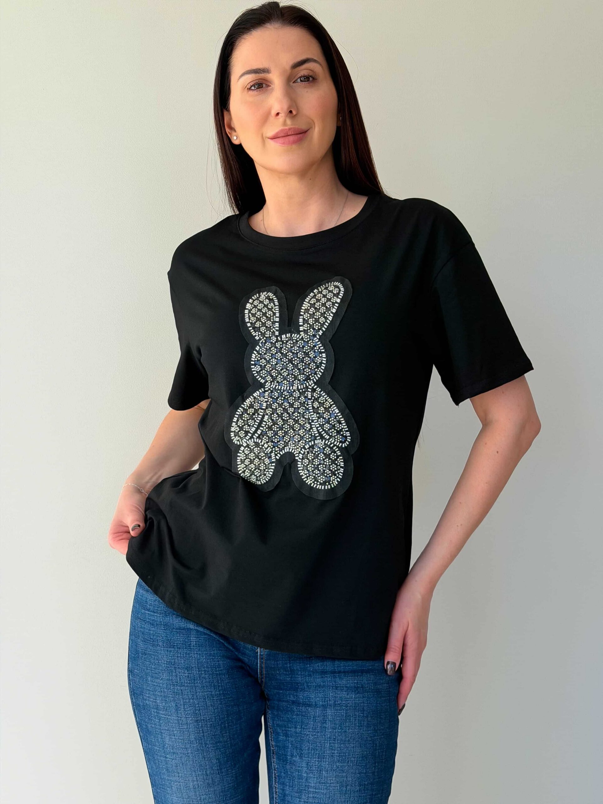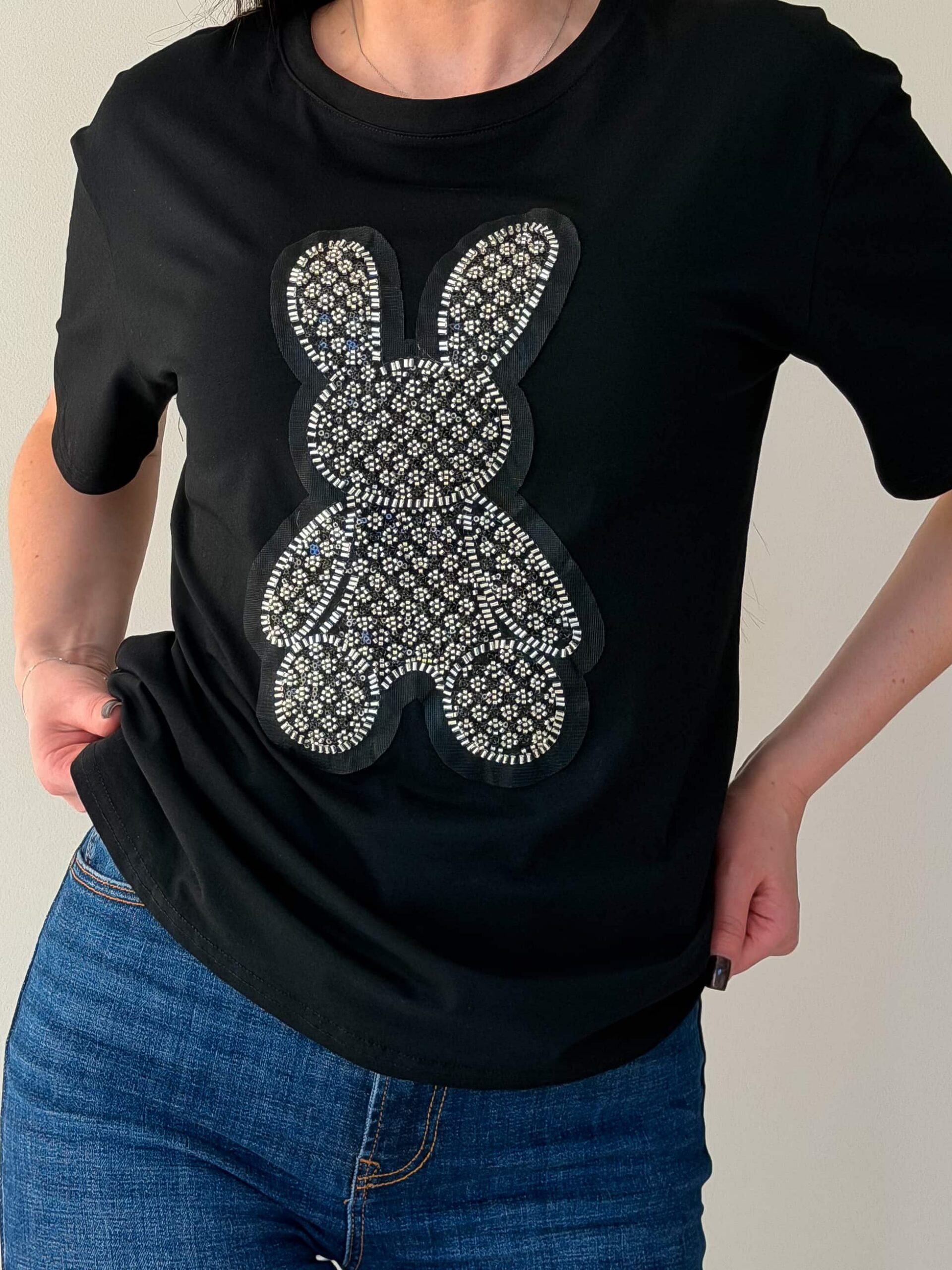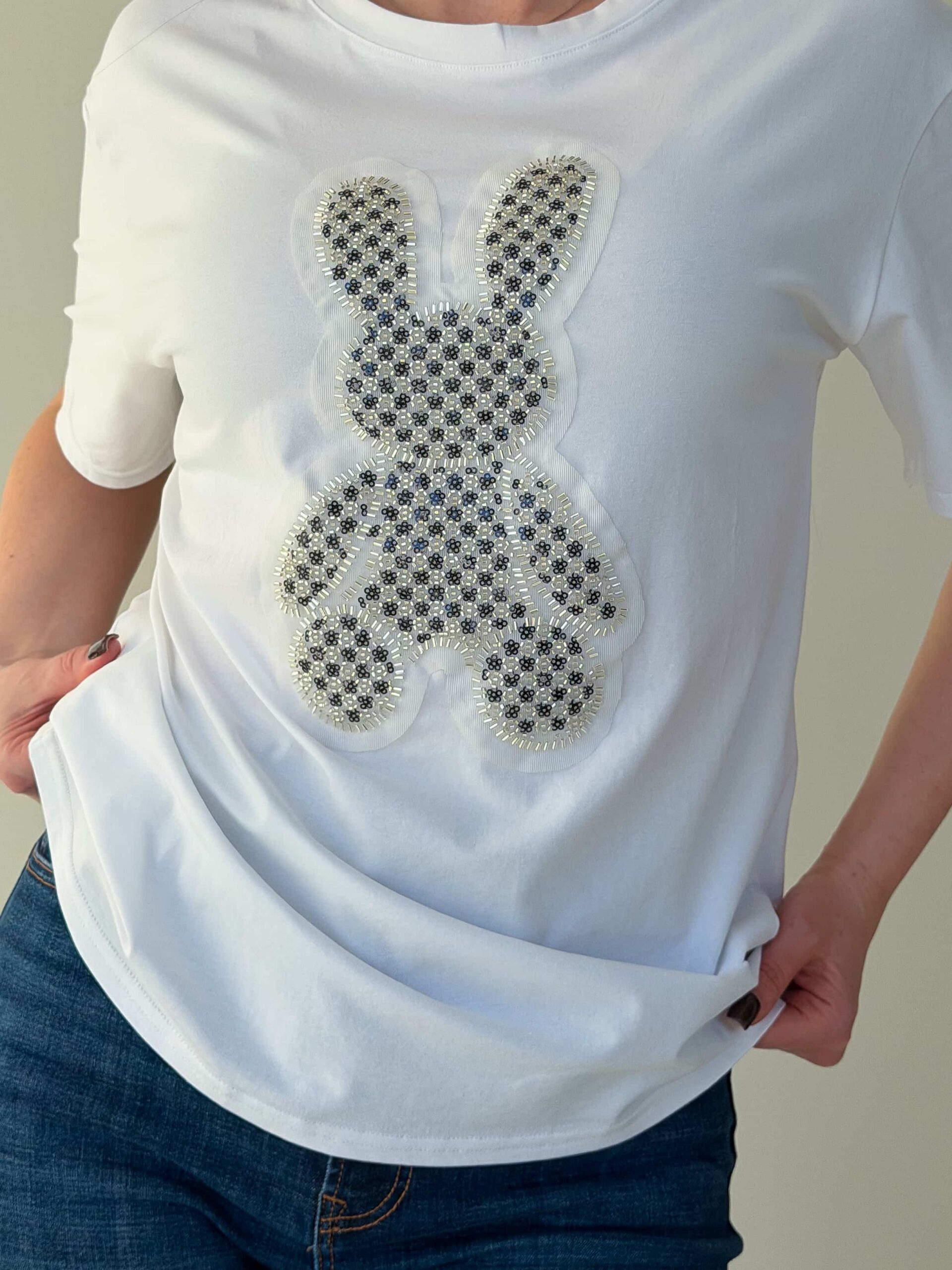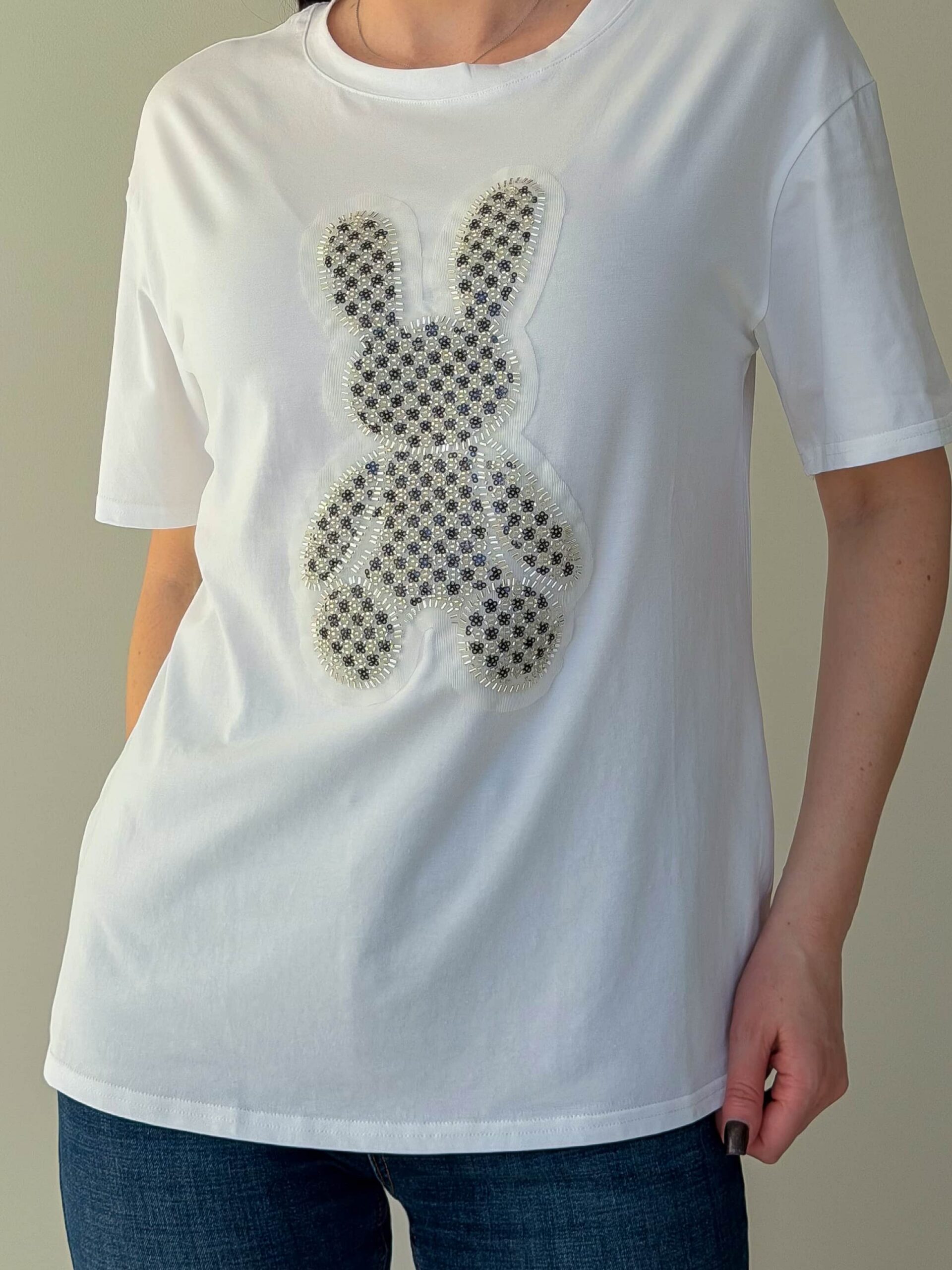 Футболка летняя станет идеальным выбором для создания свежего образа. Главным украшением модели выступает оригинальный принт силуэта зайца, расположенный на передней части изделия. Продуманная прямая форма обеспечивает отличную посадку на любой тип женской фигуры. Данная вещь абсолютно универсальная и легко дополняет джинсы, юбки или короткие шорты. Футболка летняя будет гармонично смотреться как на прогулке, так и на отдыхе. Добавьте в свой гардероб практичную модель, которая подчеркнет ваш неповторимый стиль.