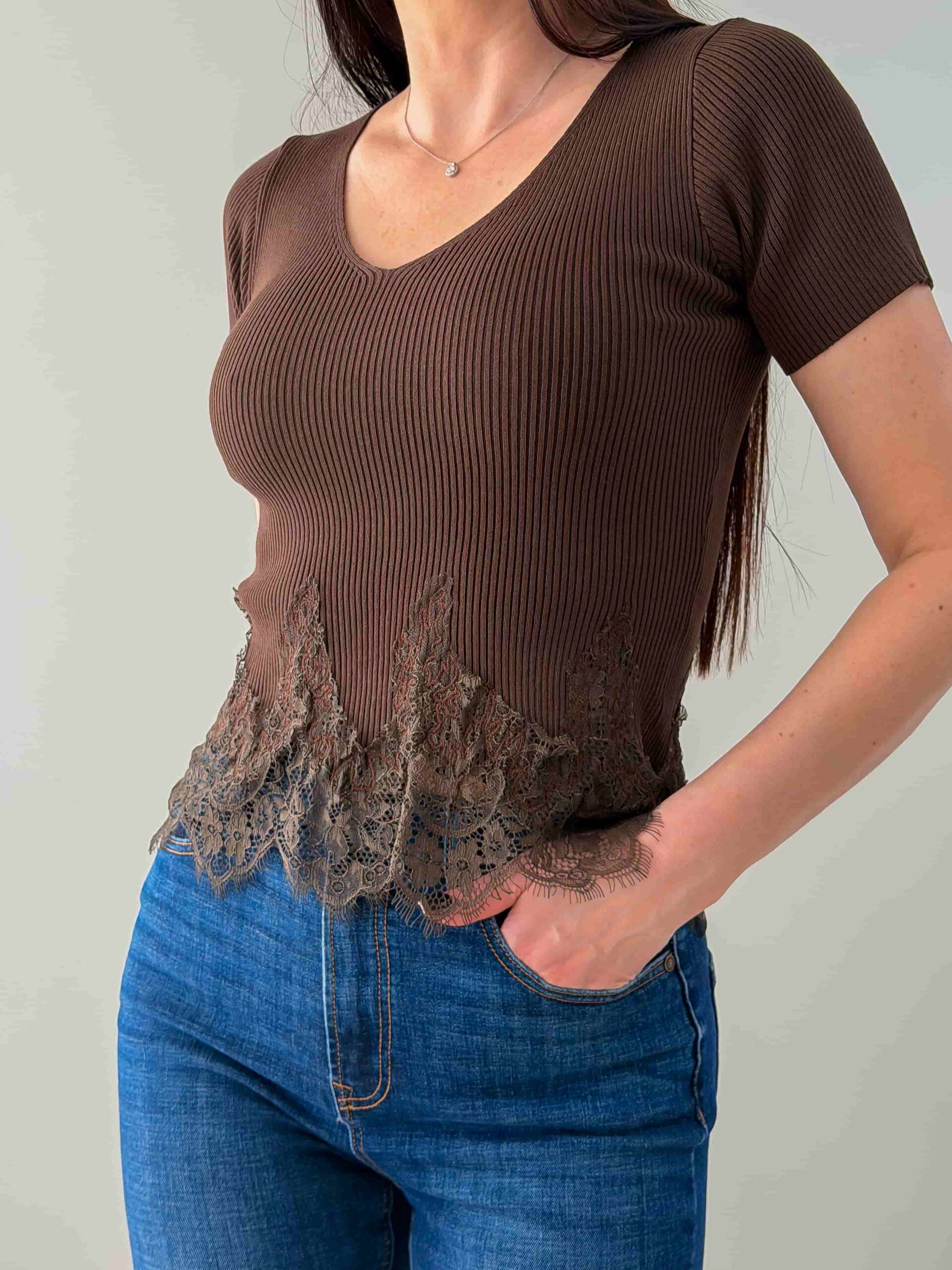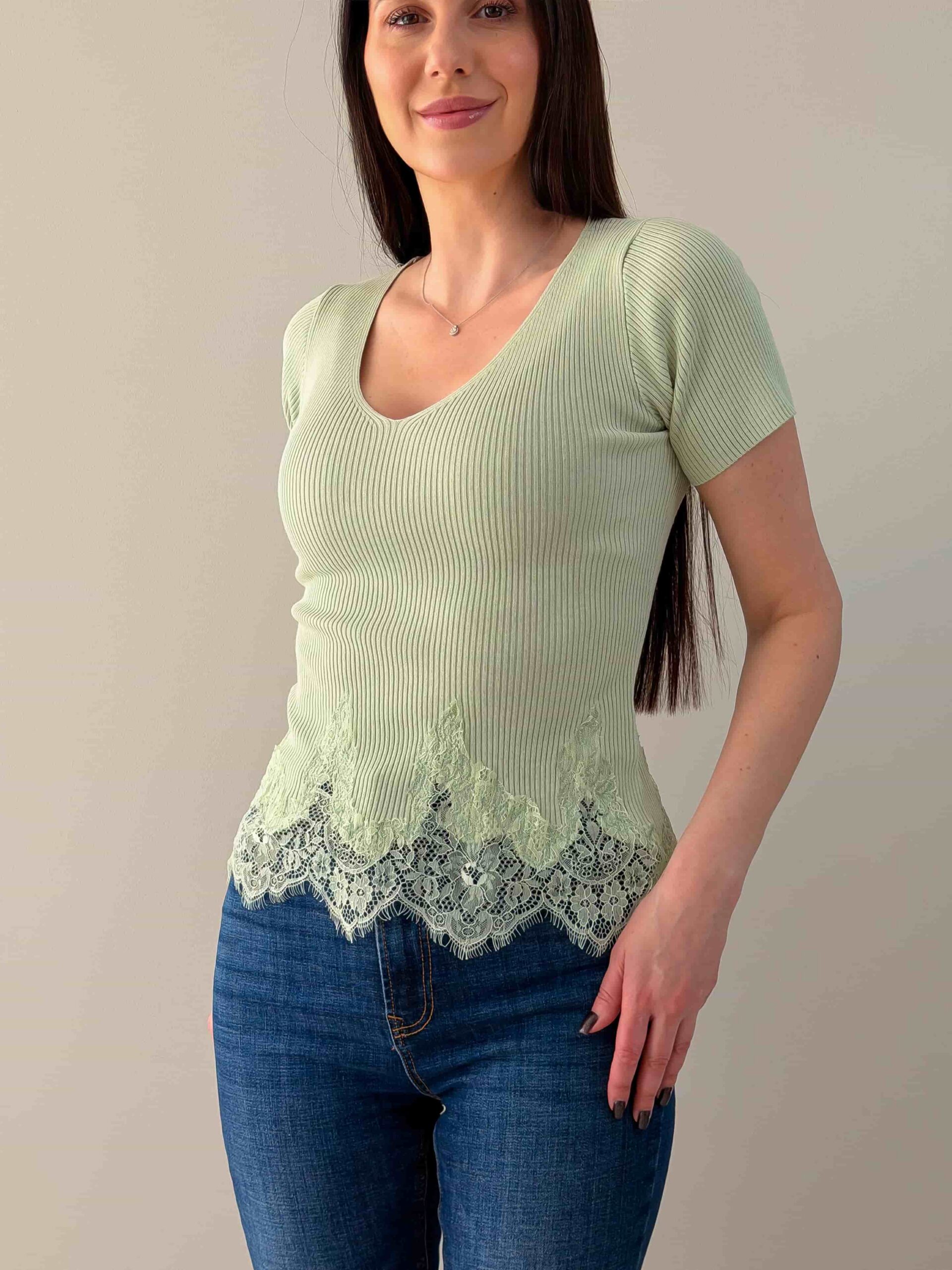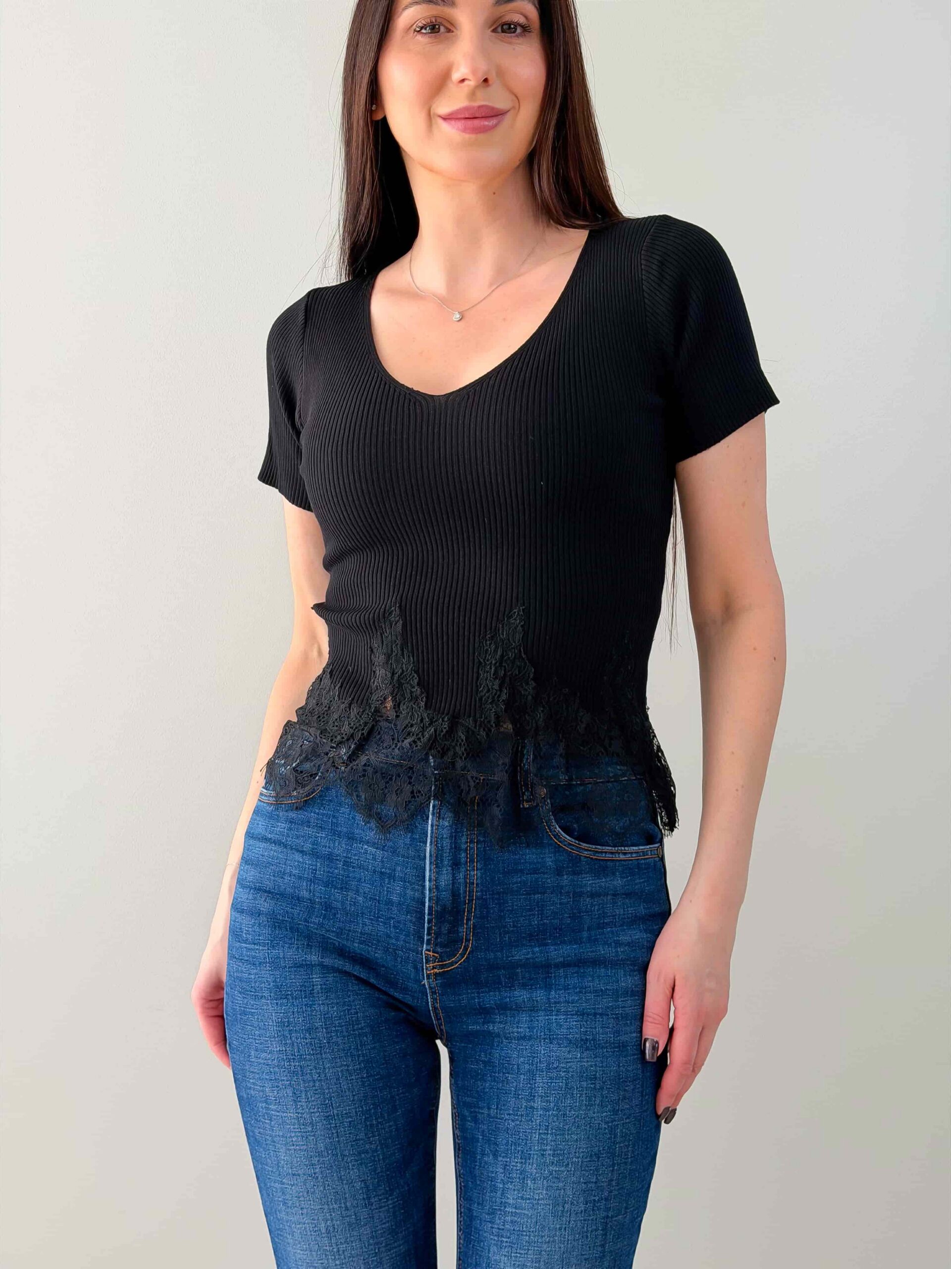 Футболка с ажурным низом — романтичная модель с V‑образным вырезом и коротким рукавом. Кружево подчёркивает талию и добавляет лёгкости, сохраняя универсальность изделия для повседневных и нарядных образов. Футболка с ажурным низом хорошо сочетается с джинсами, юбкой или шортами и служит стильной базой для многослойных сочетаний. Модель подчёркивает линию шеи и создаёт аккуратный, женственный силуэт. Футболка доступна в нескольких цветовых решениях.