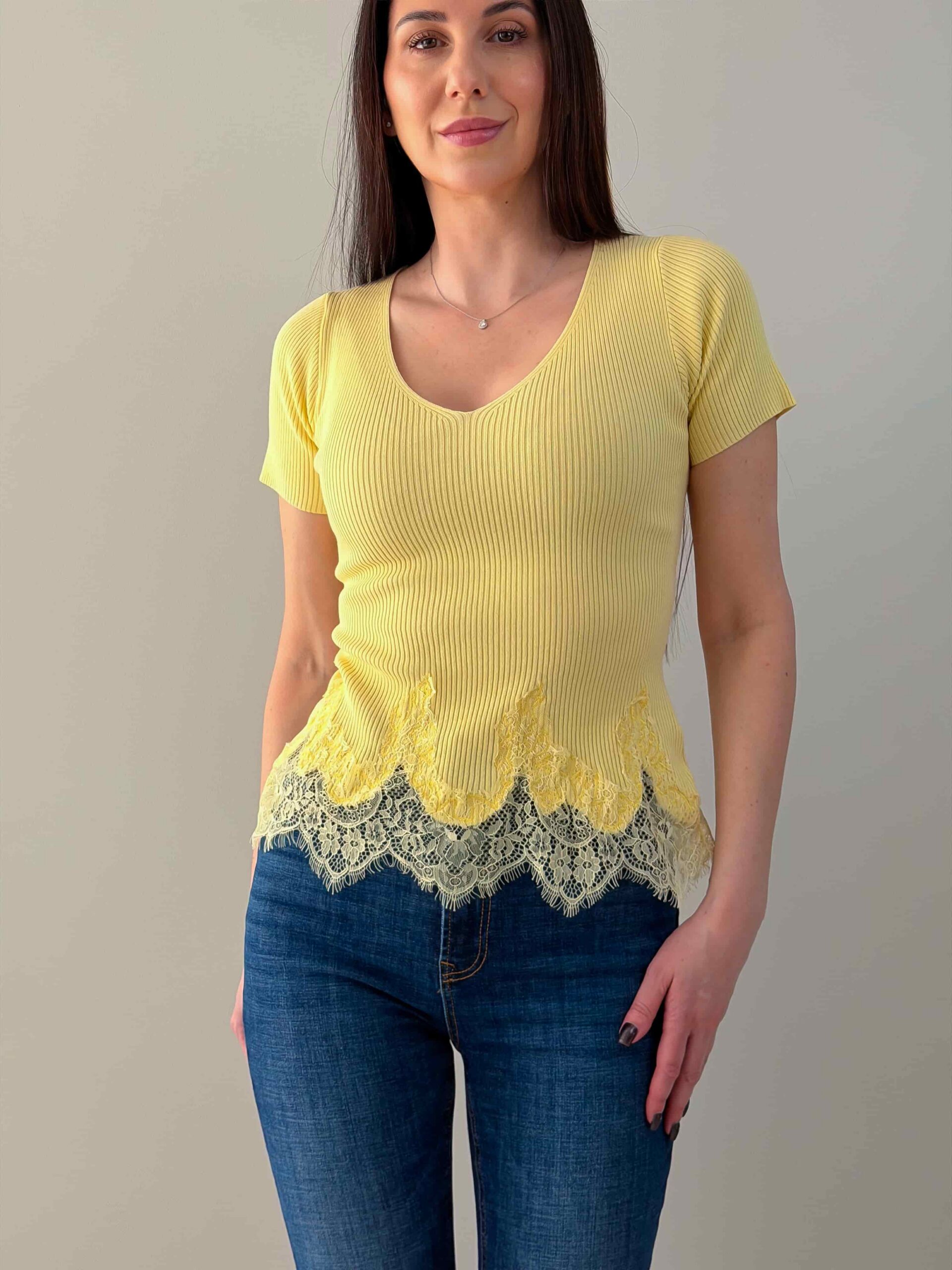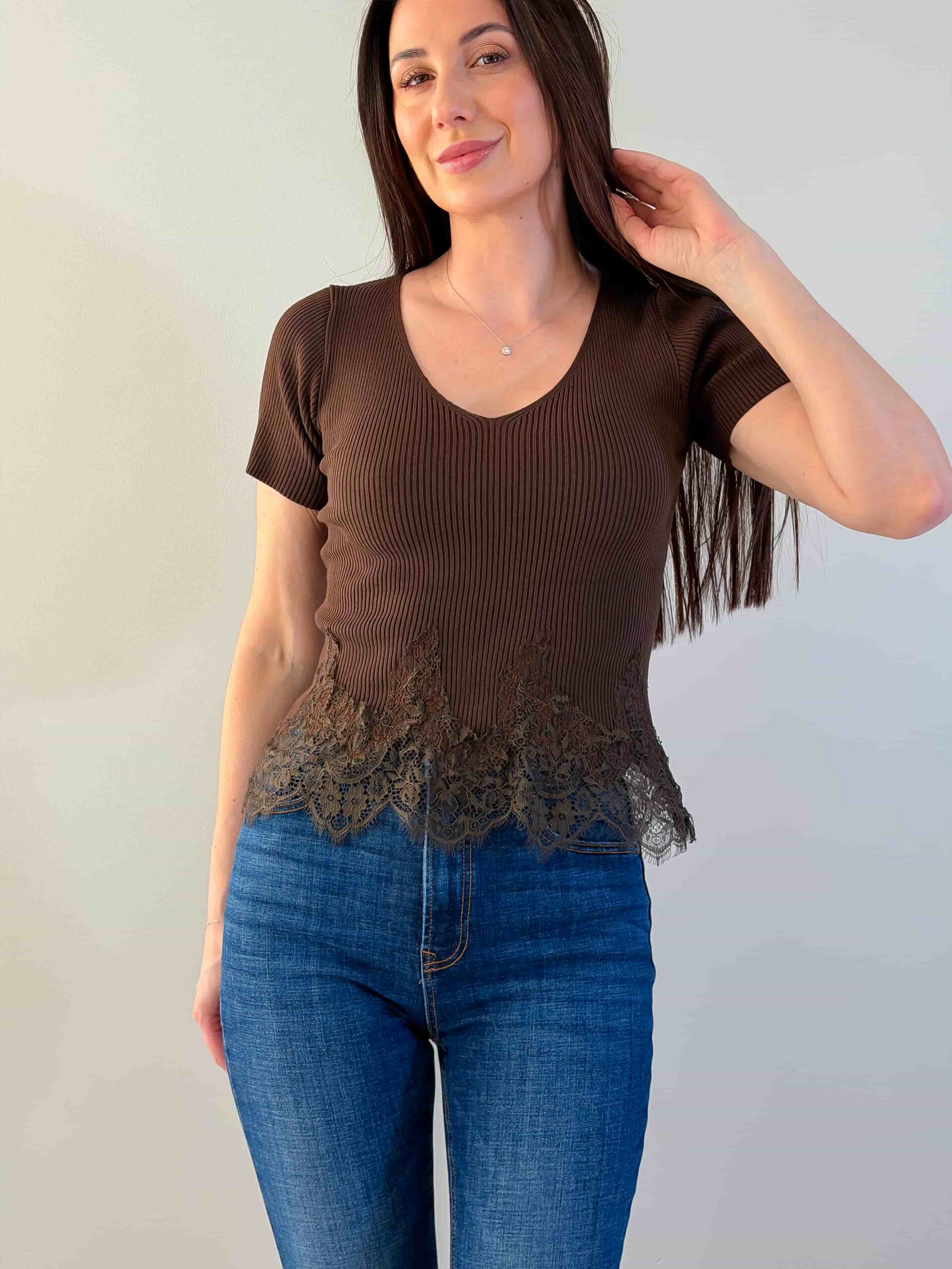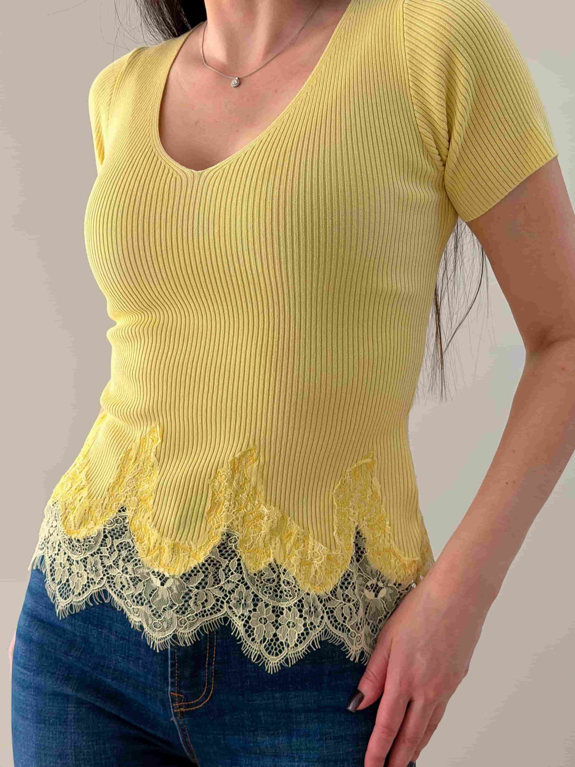 Футболка с ажурным низом — романтичная модель с V‑образным вырезом и коротким рукавом. Кружево подчёркивает талию и добавляет лёгкости, сохраняя универсальность изделия для повседневных и нарядных образов. Футболка с ажурным низом хорошо сочетается с джинсами, юбкой или шортами и служит стильной базой для многослойных сочетаний. Модель подчёркивает линию шеи и создаёт аккуратный, женственный силуэт. Футболка доступна в нескольких цветовых решениях.