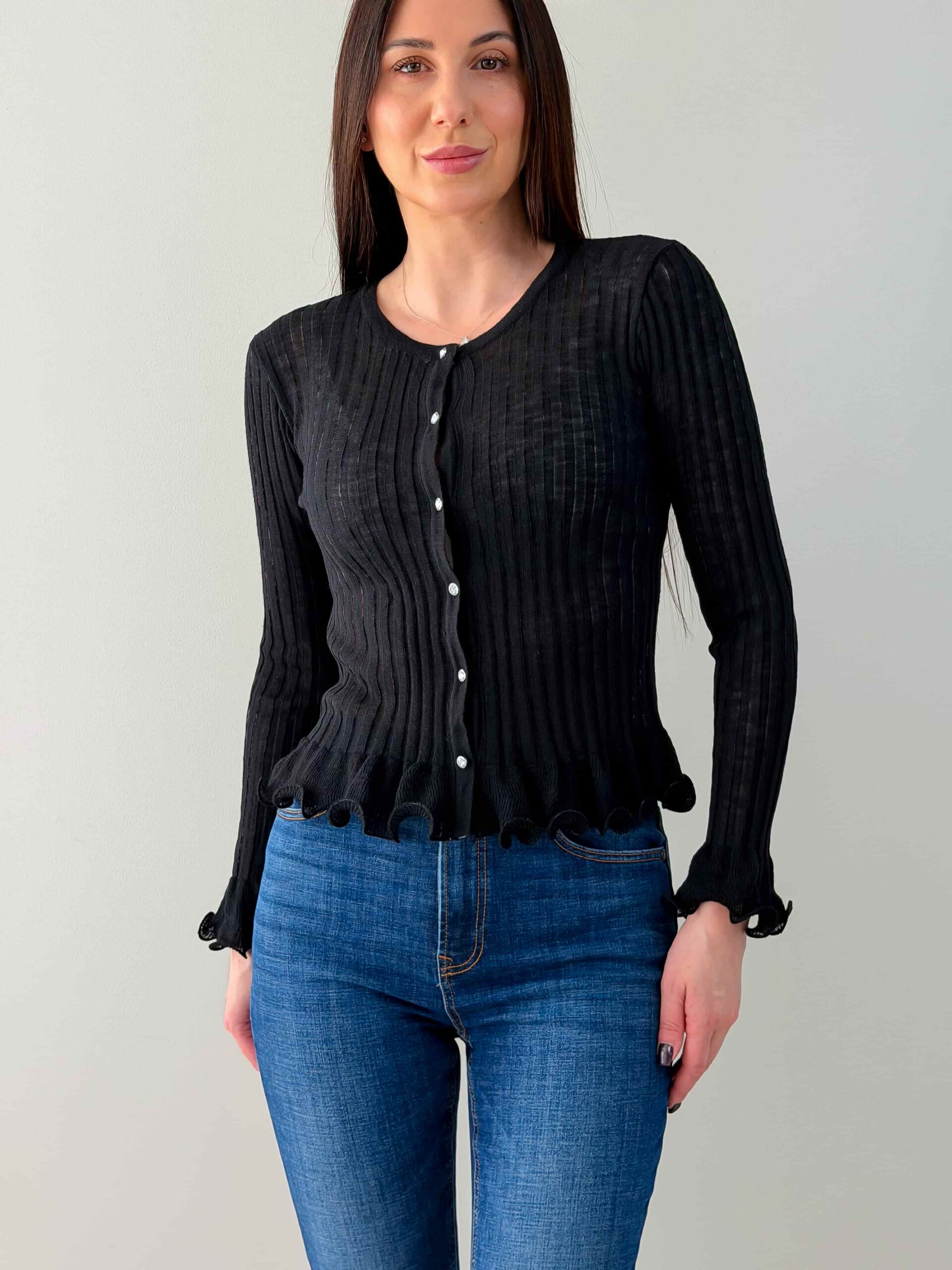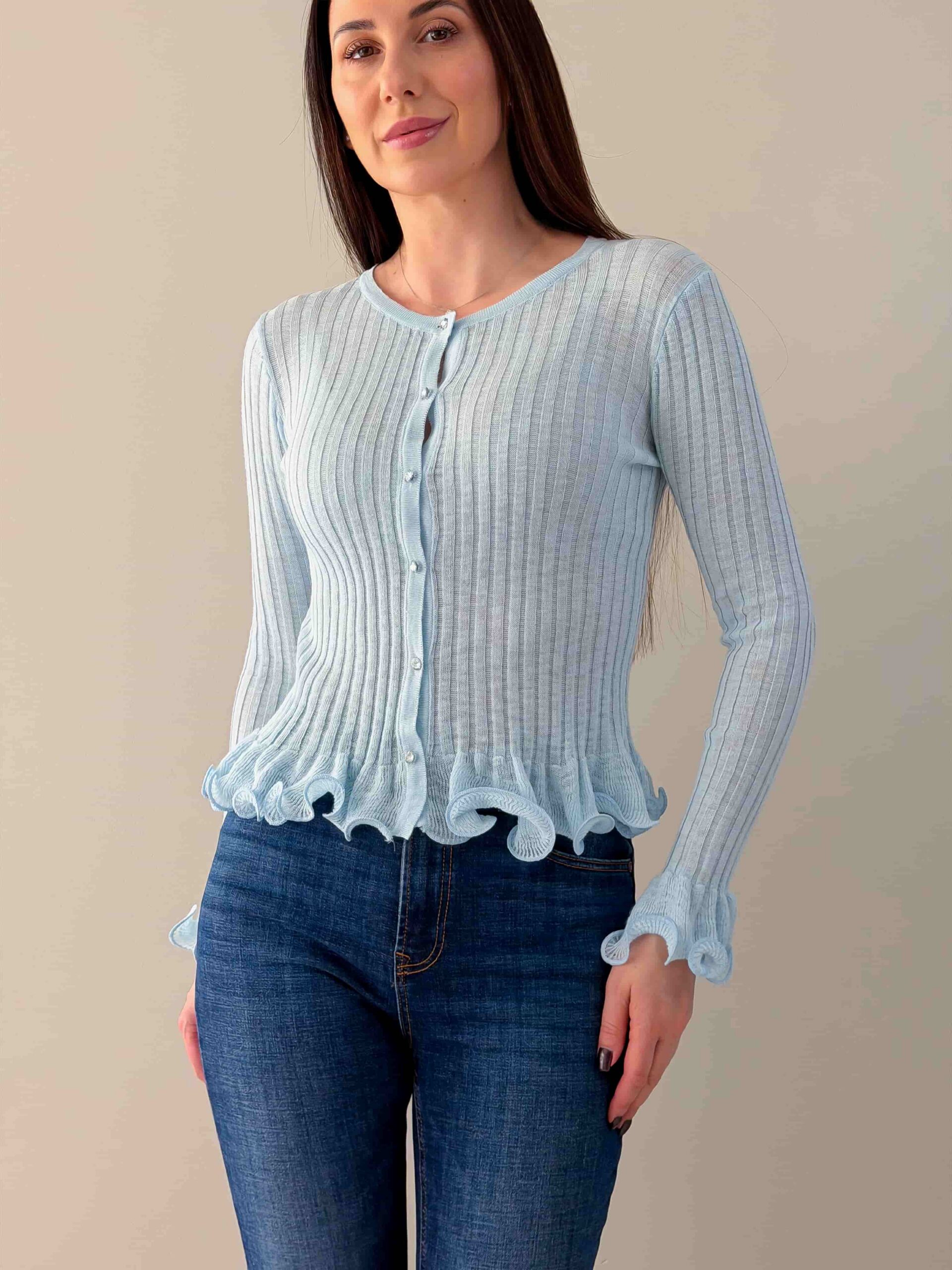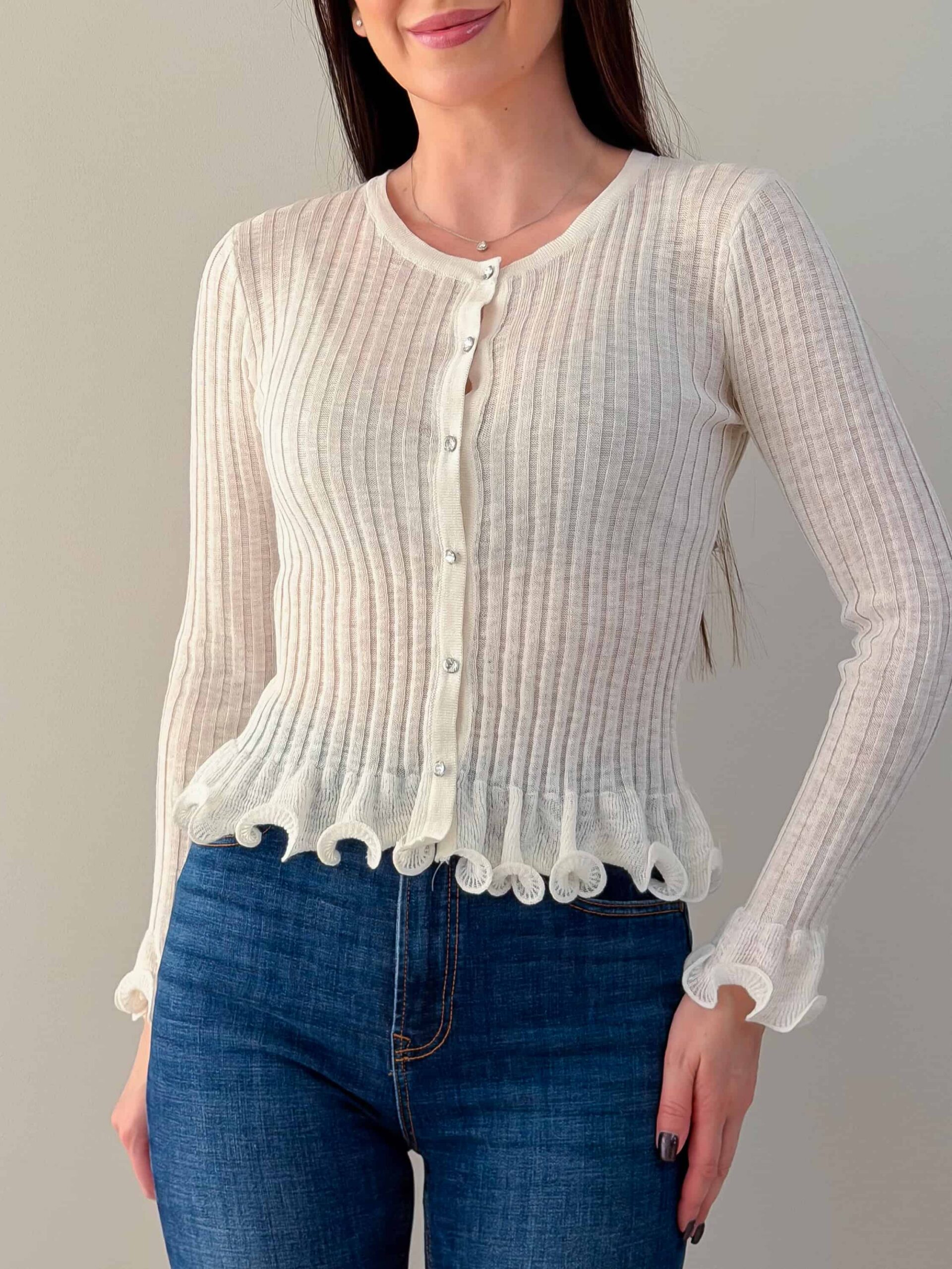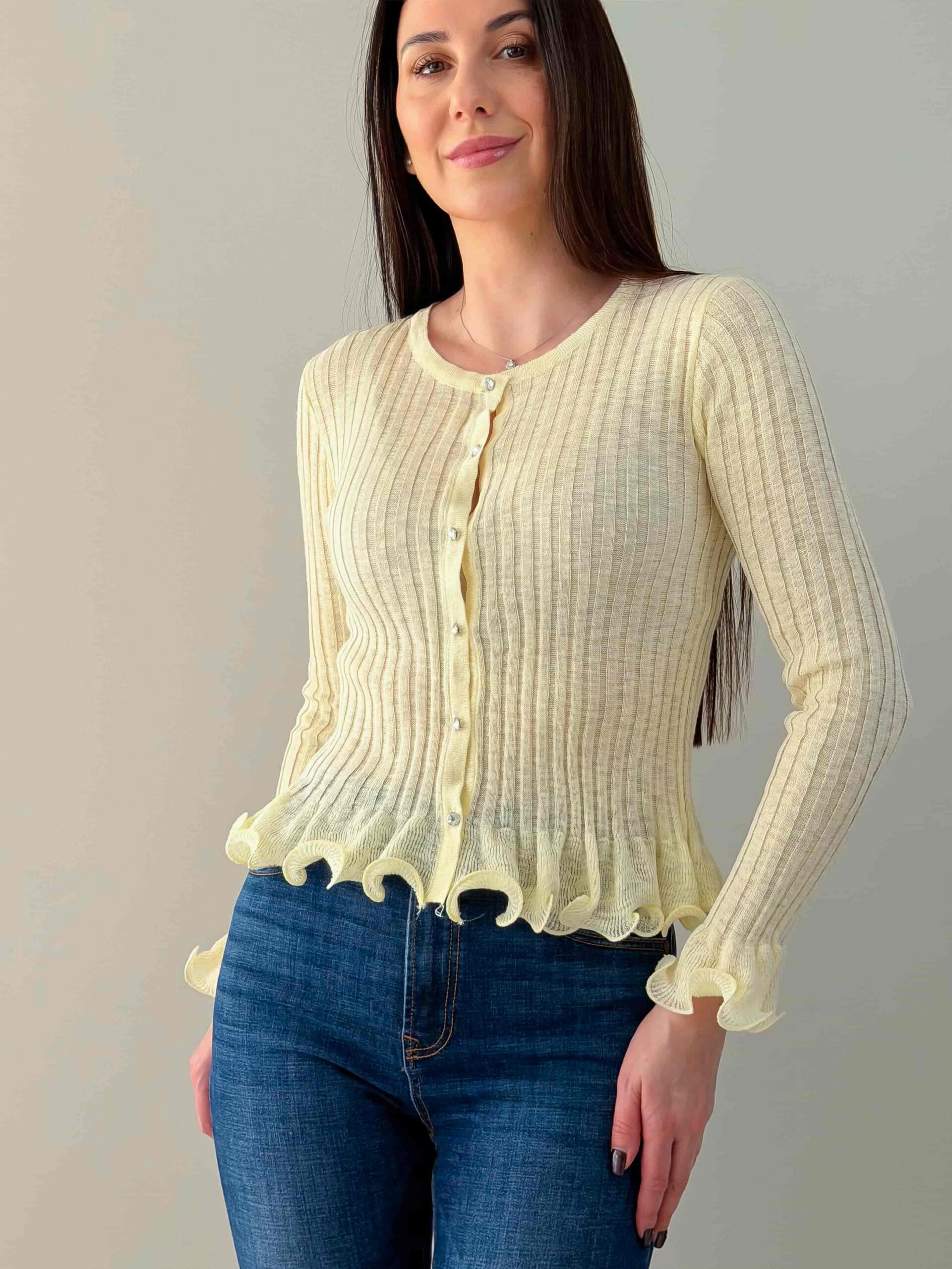 Кардиган с манжетами — утончённая и женственная модель укороченного кроя, оформленная пуговицами по центру и декоративными воланами на манжетах и по низу. Лёгкая посадка подчёркивает талию и создаёт аккуратный силуэт, а укороченная длина делает кардиган универсальным элементом для многослойных образов и сочетаний с юбками, брюками или платьями. Кардиган с манжетами привлекает внимание деталью в виде воланов, которая придаёт облику романтичную нотку, и одновременно остаётся практичным решением для ежедневной носки. Модель легко комбинируется с базовыми топами и рубашками, а декоративные пуговицы завершают стильную концепцию изделия.