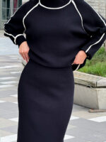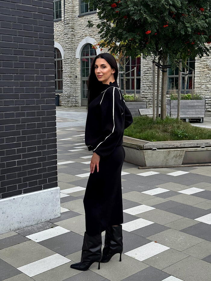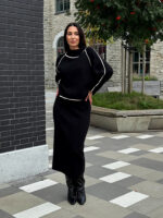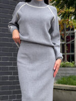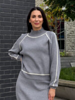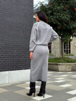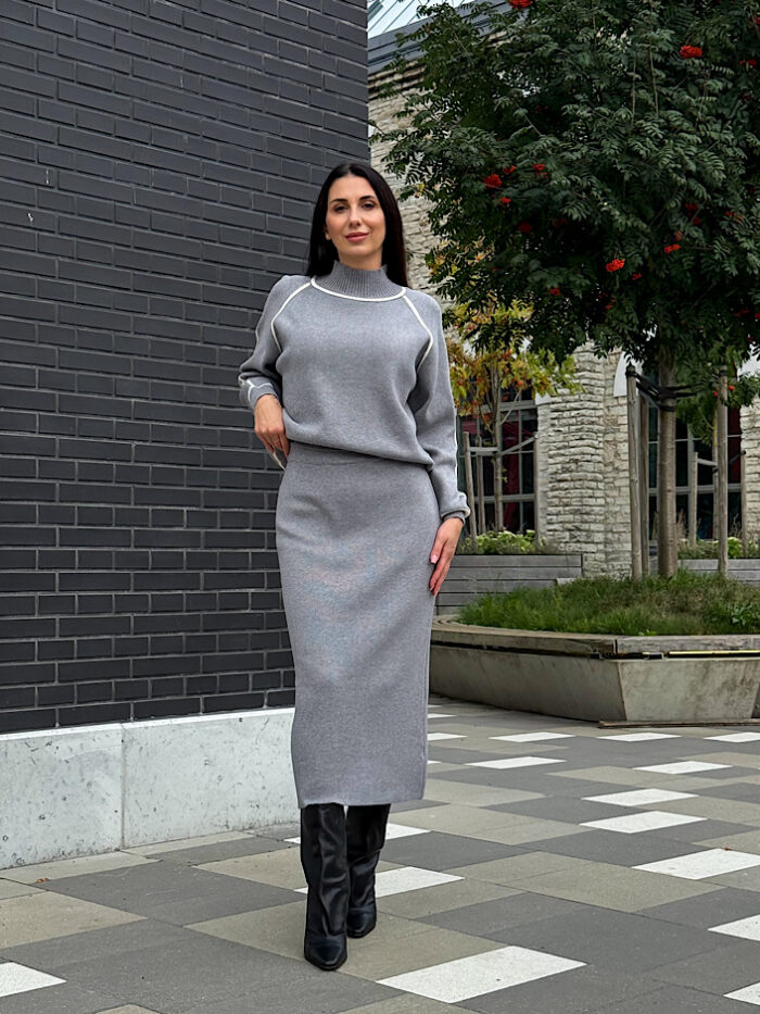 Элегантный костюм с юбкой миди выполнен из мягкого вязаного трикотажа с добавлением вискозы, что обеспечивает комфорт и приятное ощущение.