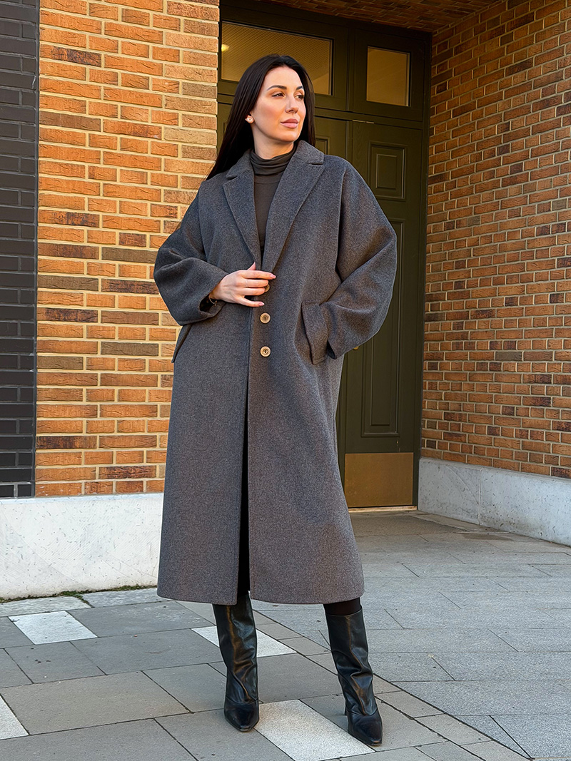 Главная деталь — акцентные пуговицы, которые мгновенно привлекают внимание и добавляют пальто индивидуальности.