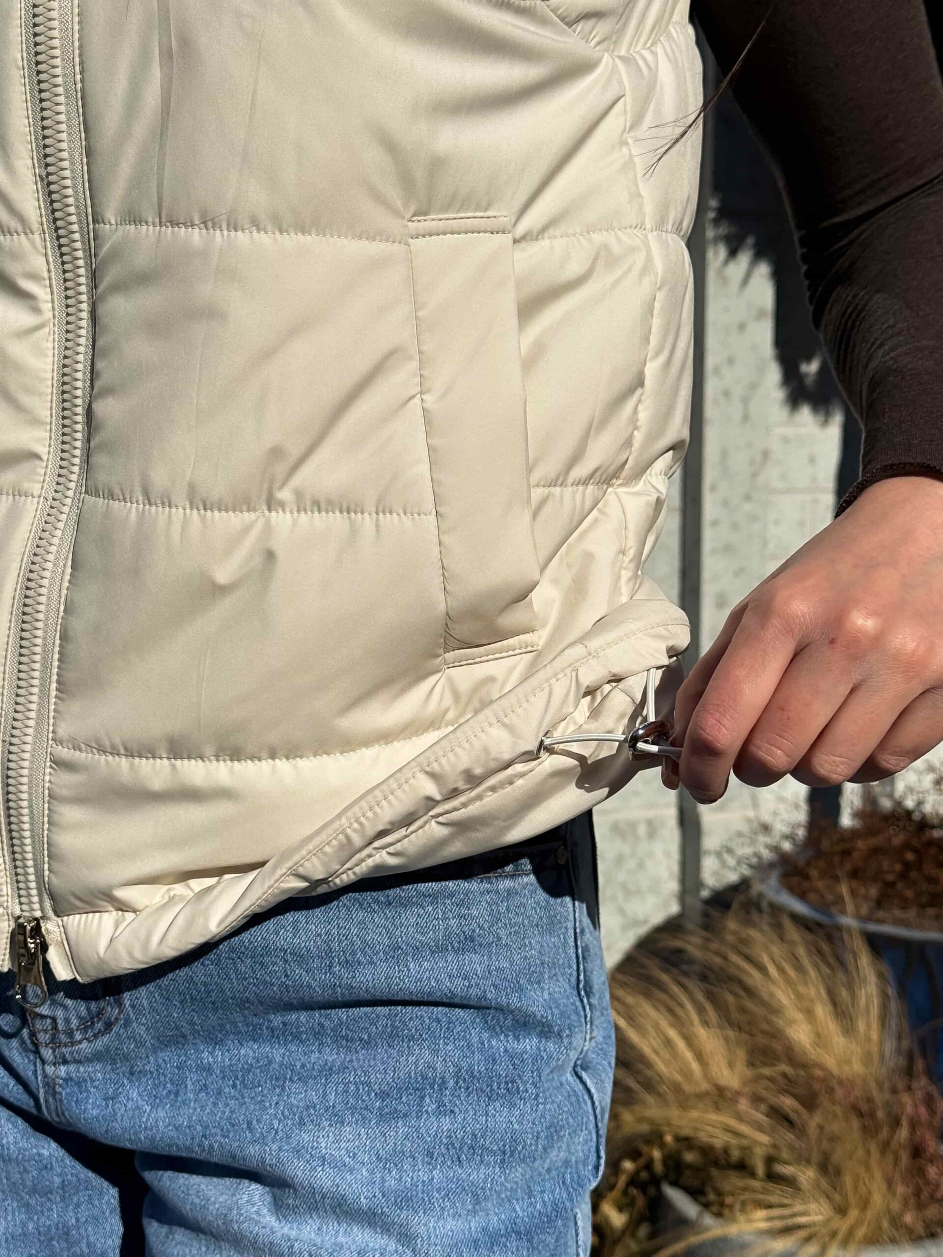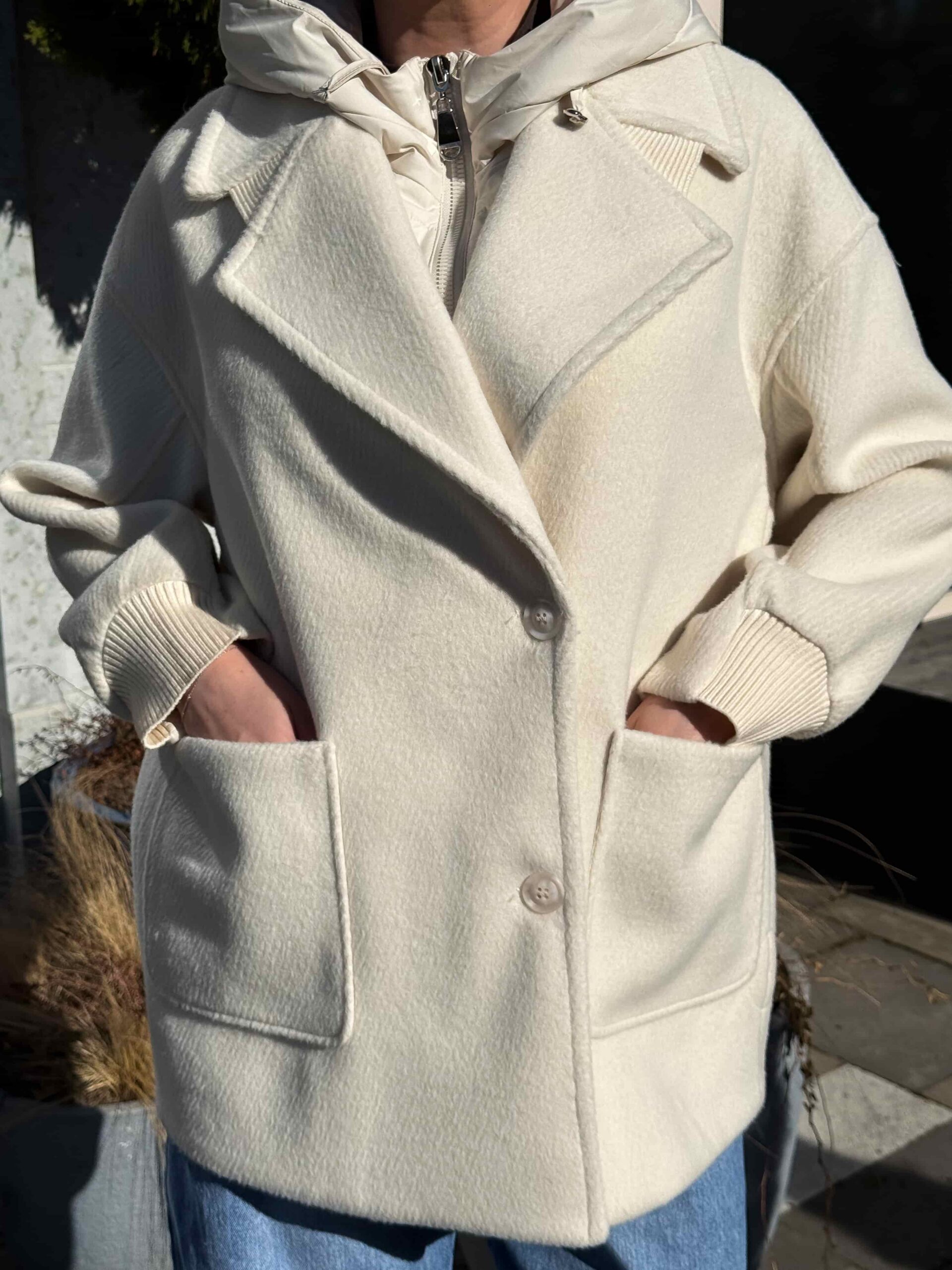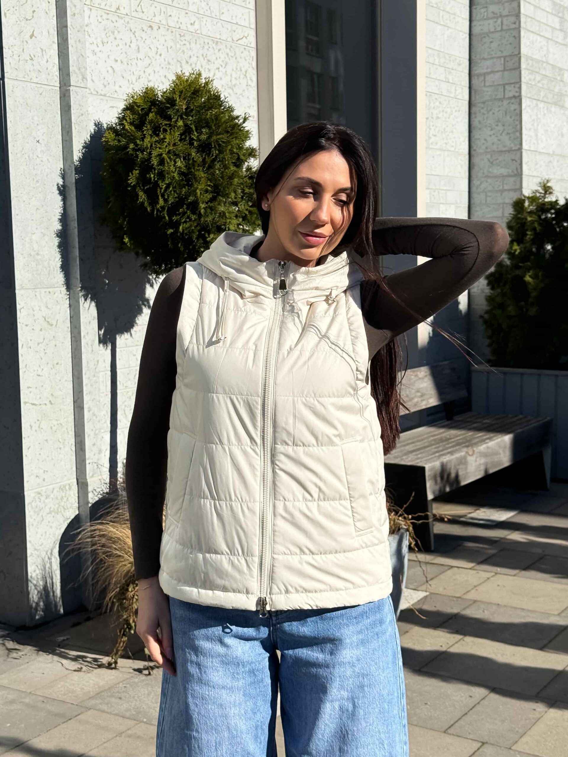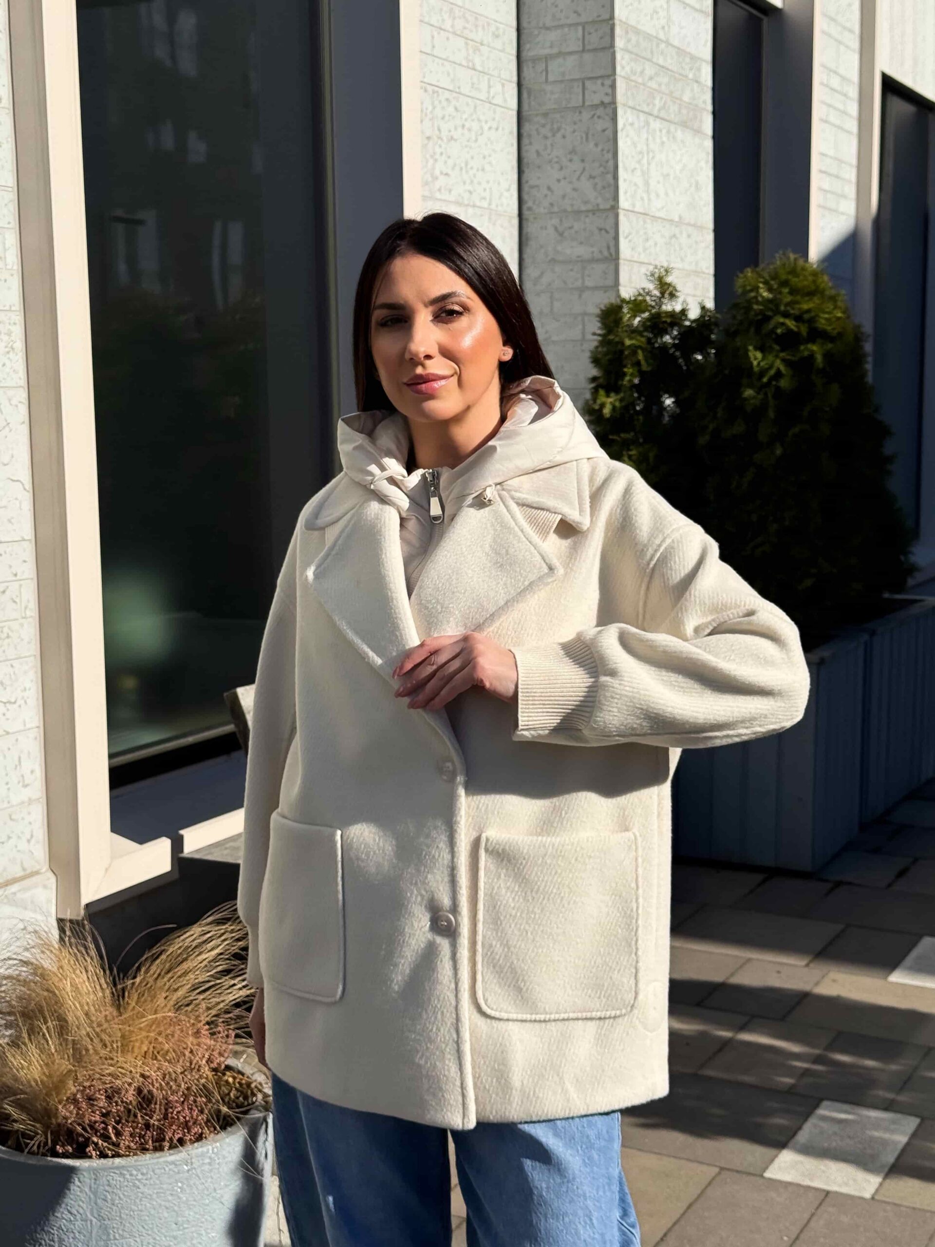 Стильное и функциональное пальто с жилетом — идеальное решение для межсезонья. Лаконичный прямой силуэт до середины бедра выполнен в мягком молочном оттенке; широкие накладные карманы добавляют практичности и подчёркивают современный городской стиль. Стёганый жилет с застёжкой-молнией и капюшоном обеспечивает дополнительное утепление и позволяет носить вещь в трех вариантах: как лёгкое пальто, жилет или как тёплый комплект. Капюшон защищает от ветра и дождя, аккуратные манжеты на резинке удерживают тепло. Отличается продуманной посадкой, универсальностью сочетаний и экономией места в гардеробе — две вещи в одной для повседневных и деловых образов.